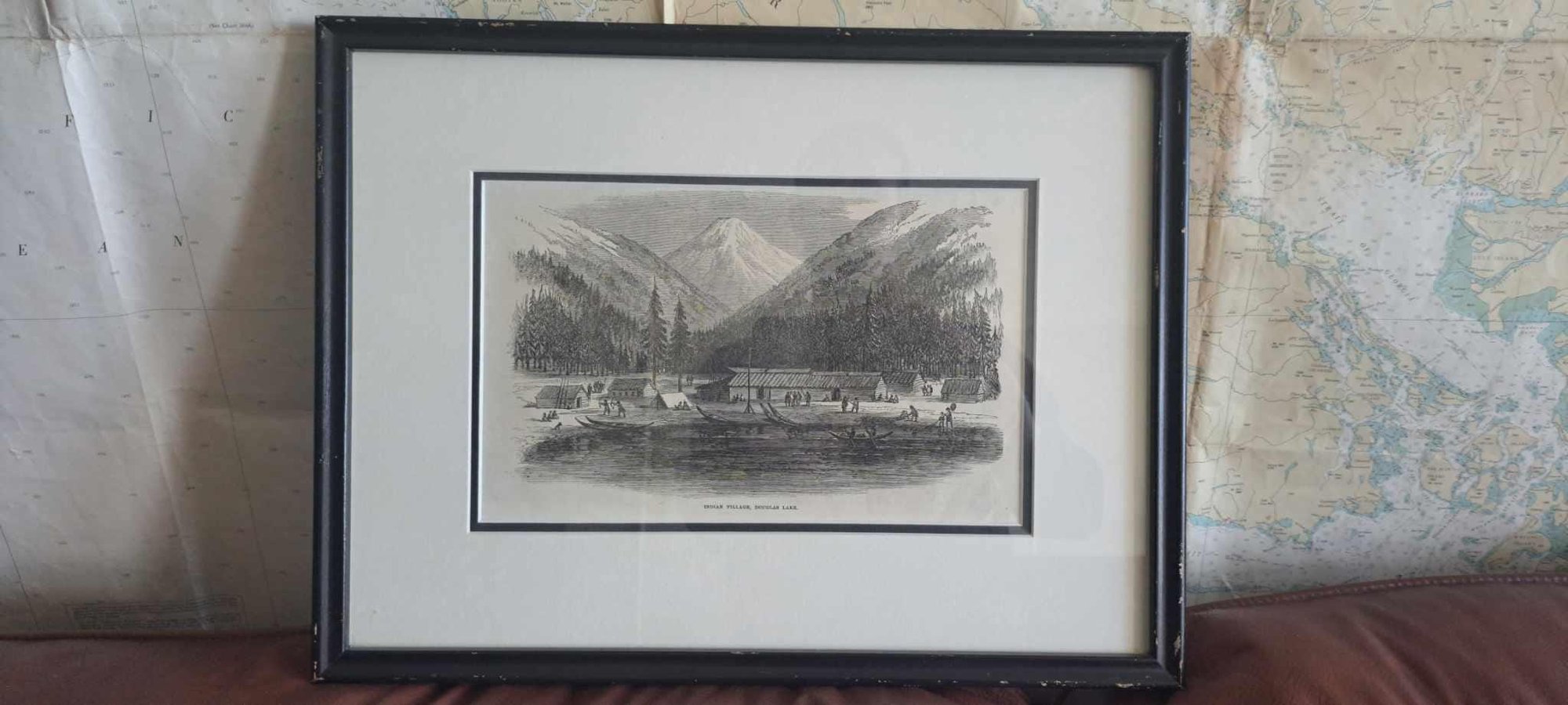 A lithograph titled "Indian Village, Douglas Lake" by an unknown artist. The print is in very good condition. The frame is in fair condition. Faint marks can bee seen across the frame's wood (see pictures). The backing is in great condition.