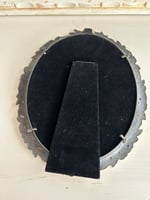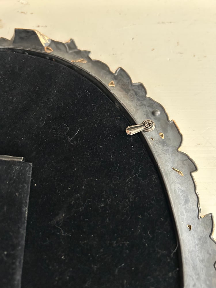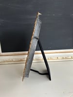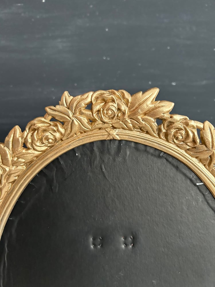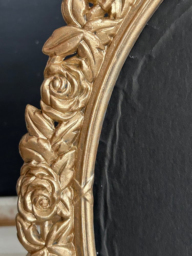 This is a gorgeous gold painted frame. The frame is in great condition with no cracks or chips. This is a pewter frame which has been painted with a gold metallic paint, it is on the heavier side. The floral design stands out with great detail. There is NO glass in this frame, but the backing and the stand are in very good condition (this is table top only). The backing is black velvet.