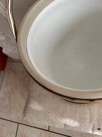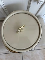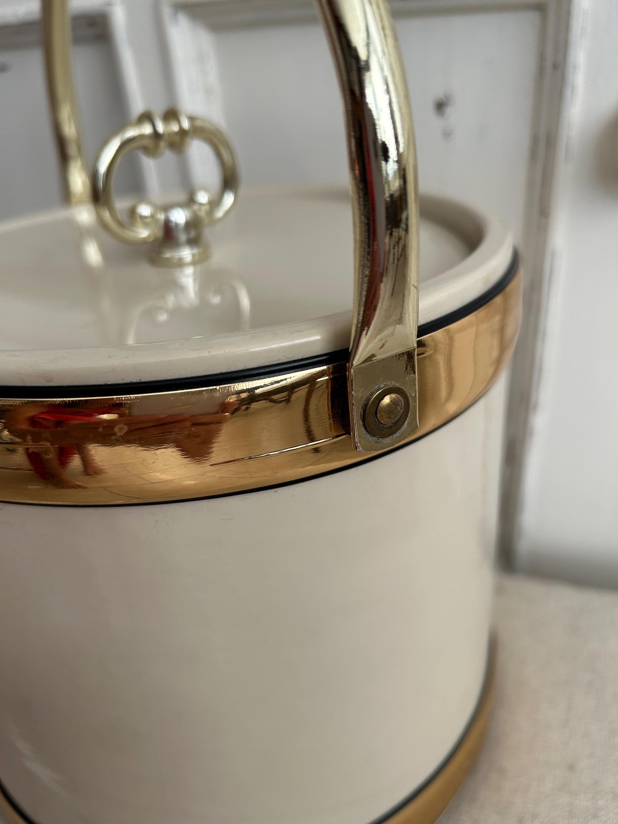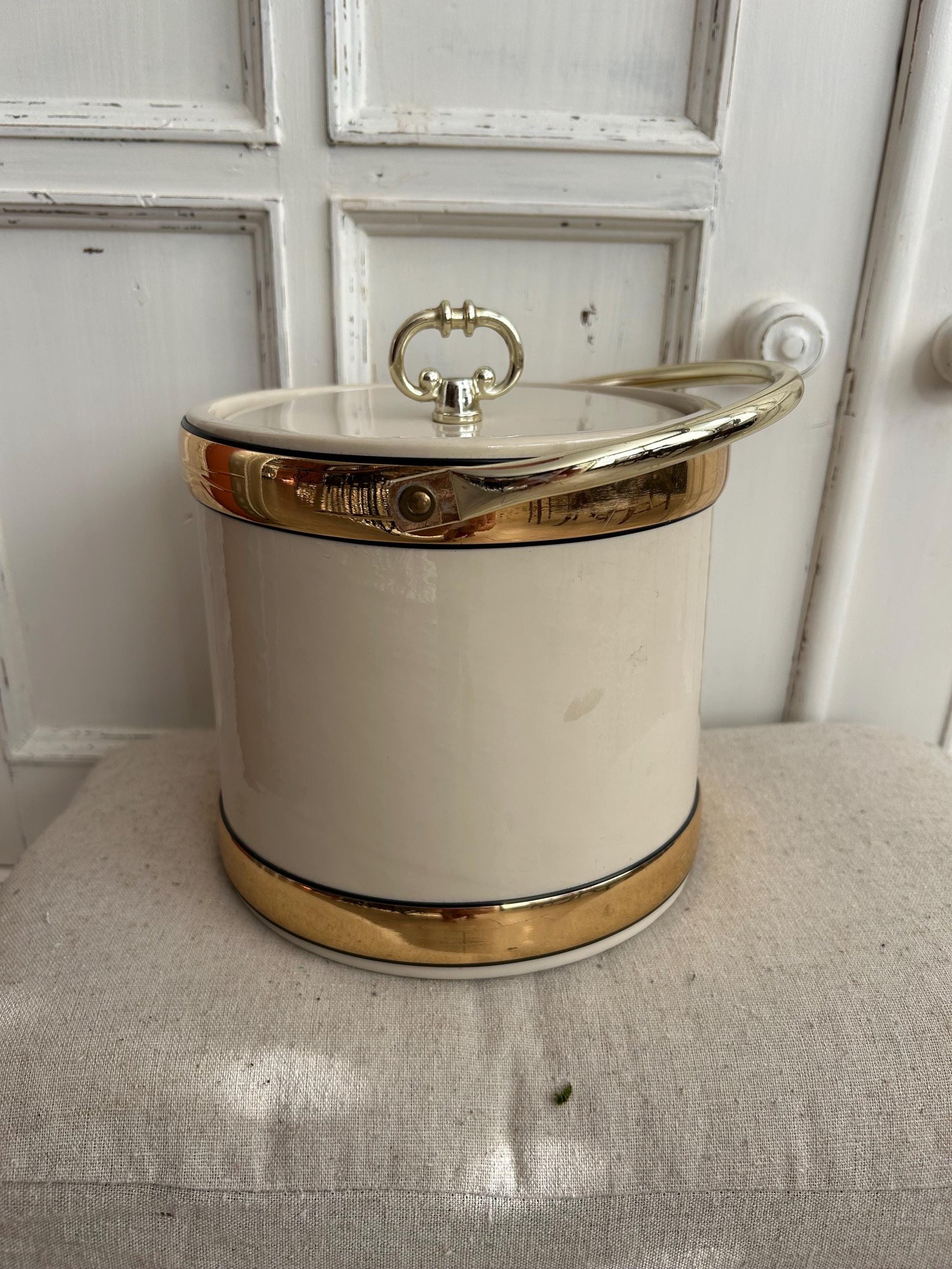 This beautiful ice bucket is a combination of vinyl and plastic. Absolutely beautiful and in good vintage condition. The lid shows small amounts of wear from age and is a snug fit but closes (see pic # 9 to see the fit of the lid which causes the snug closing). The plastic liner is in great shape and the handle works well. There is 1 small light mark on the side as shown in Pic #3.