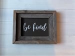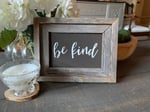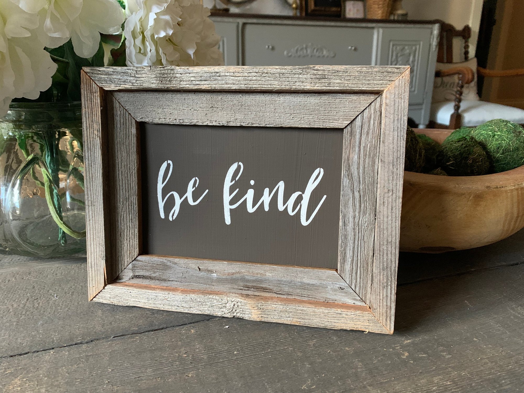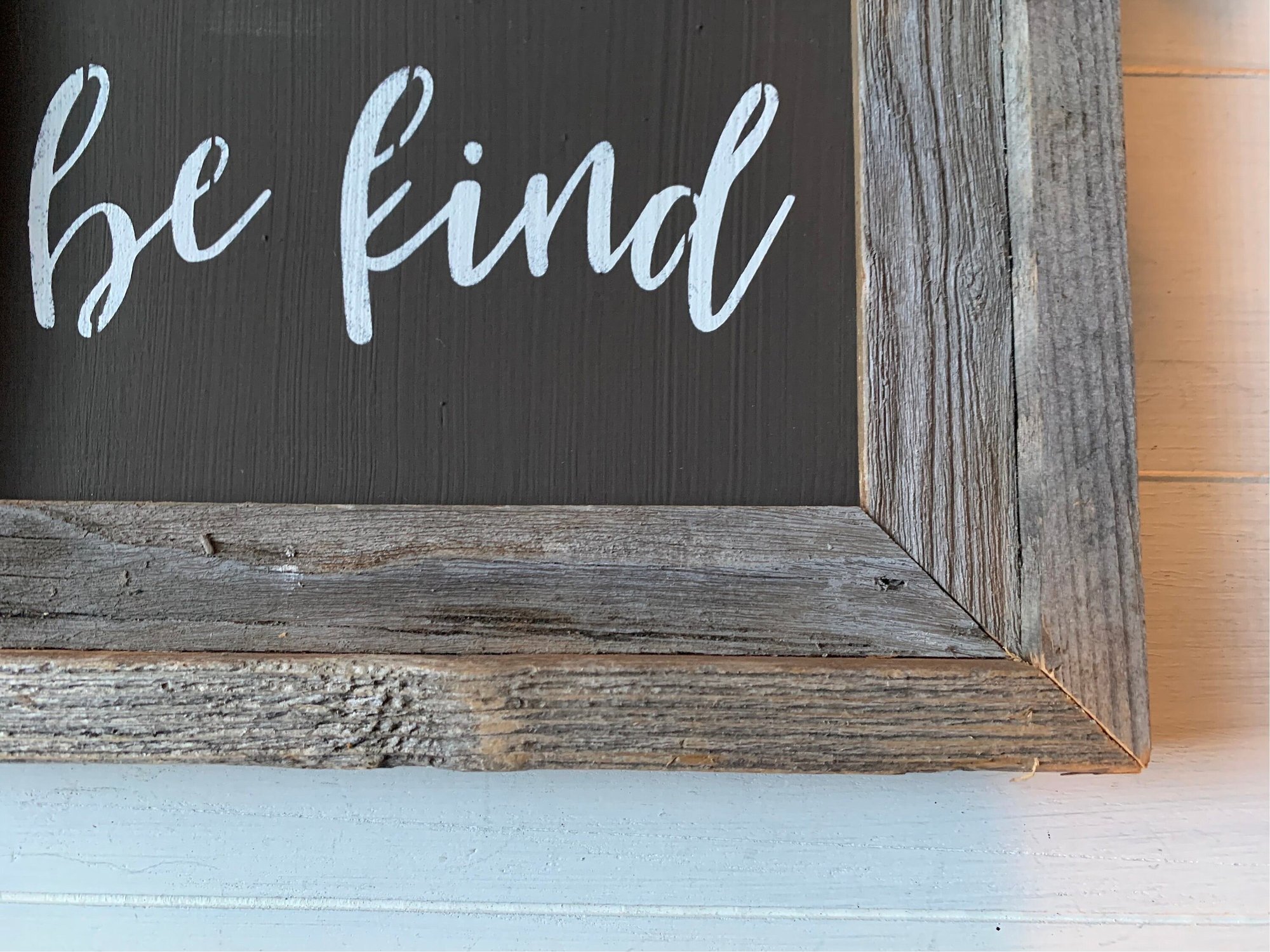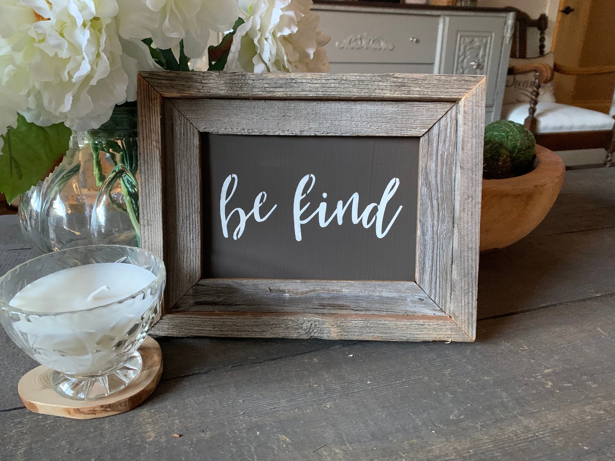 This rustic barnboard frame has been altered by painting and adding backboard and painting the saying 'Be Kind' in white. Use the frame as it is or remove the picture and use for your own artwork or photo. In very sturdy, good condition.
