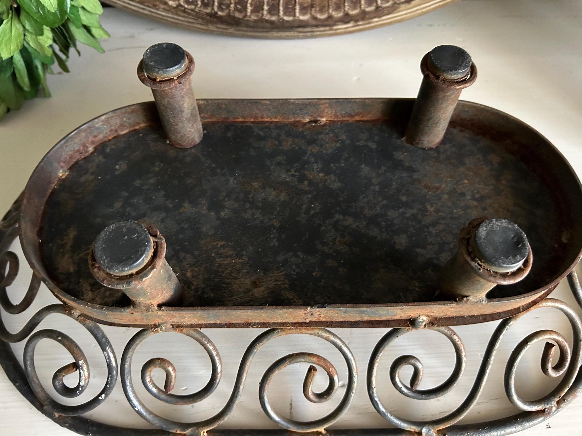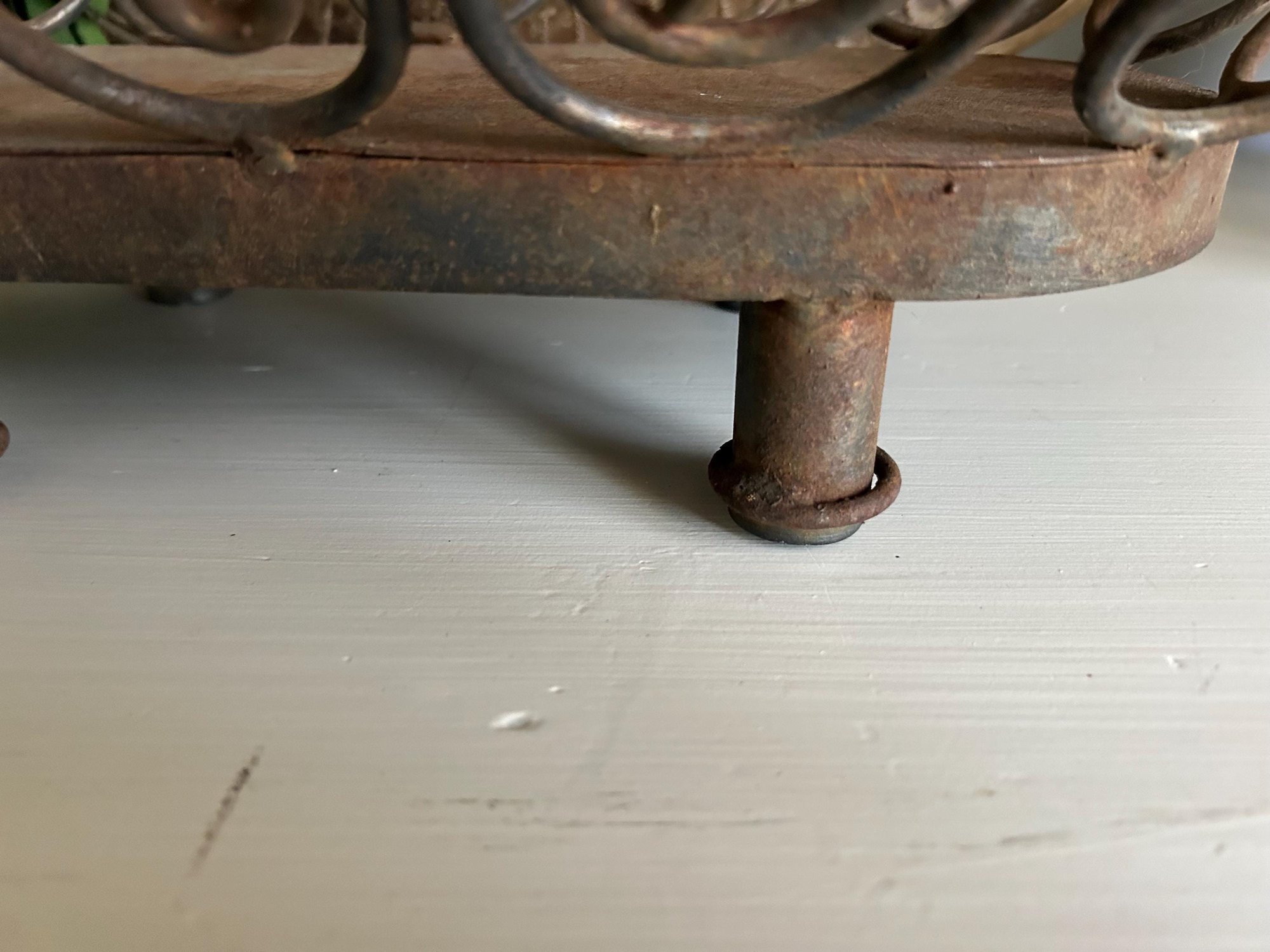 This decorative metal basket it is quite striking and makes a great statement. The rust is genuinely achieved as can be seen from the underside which is still the original black, It is on the heavier side and the edging on it makes it a statement piece. Could be used for some many purposes.