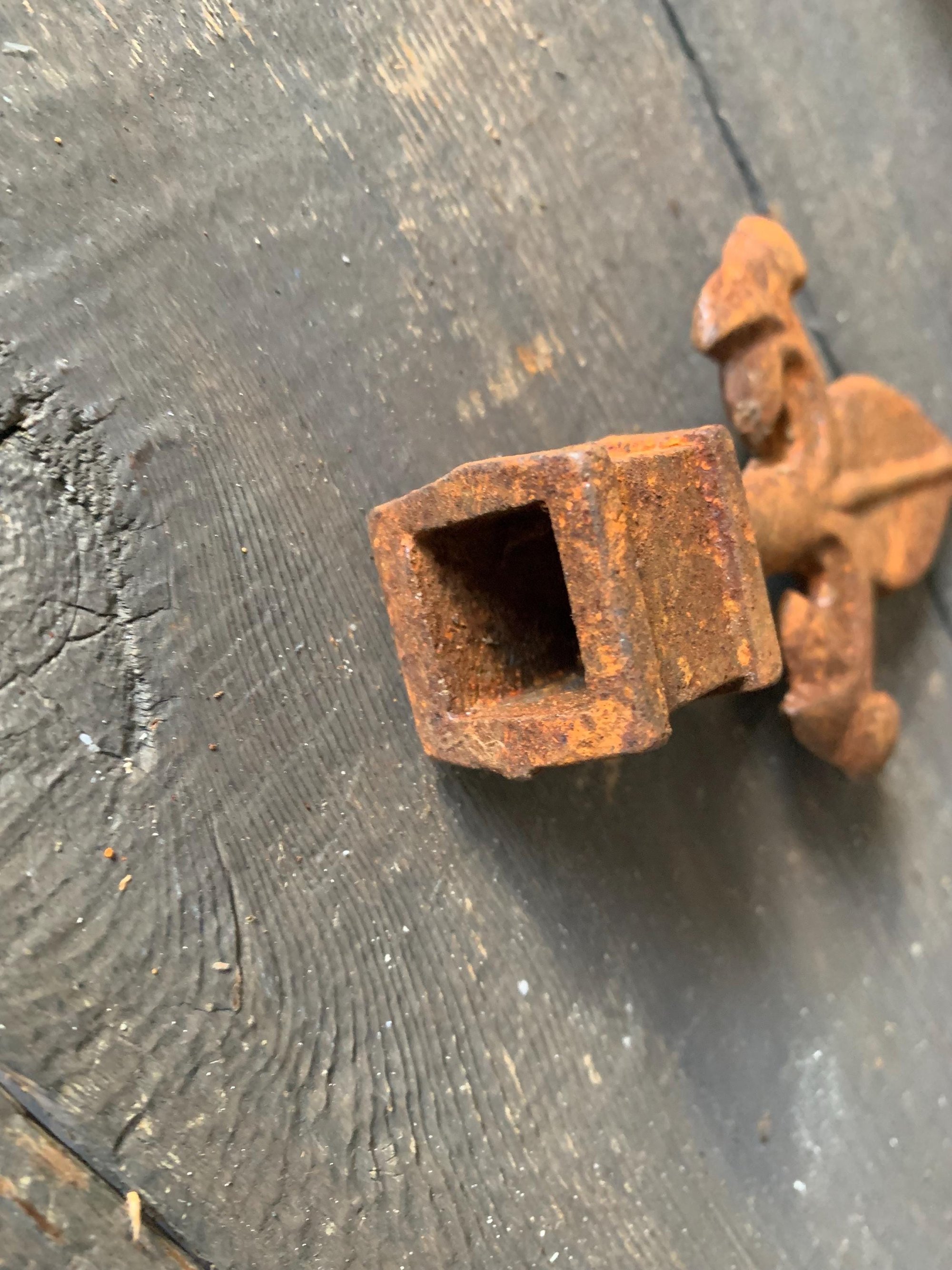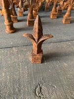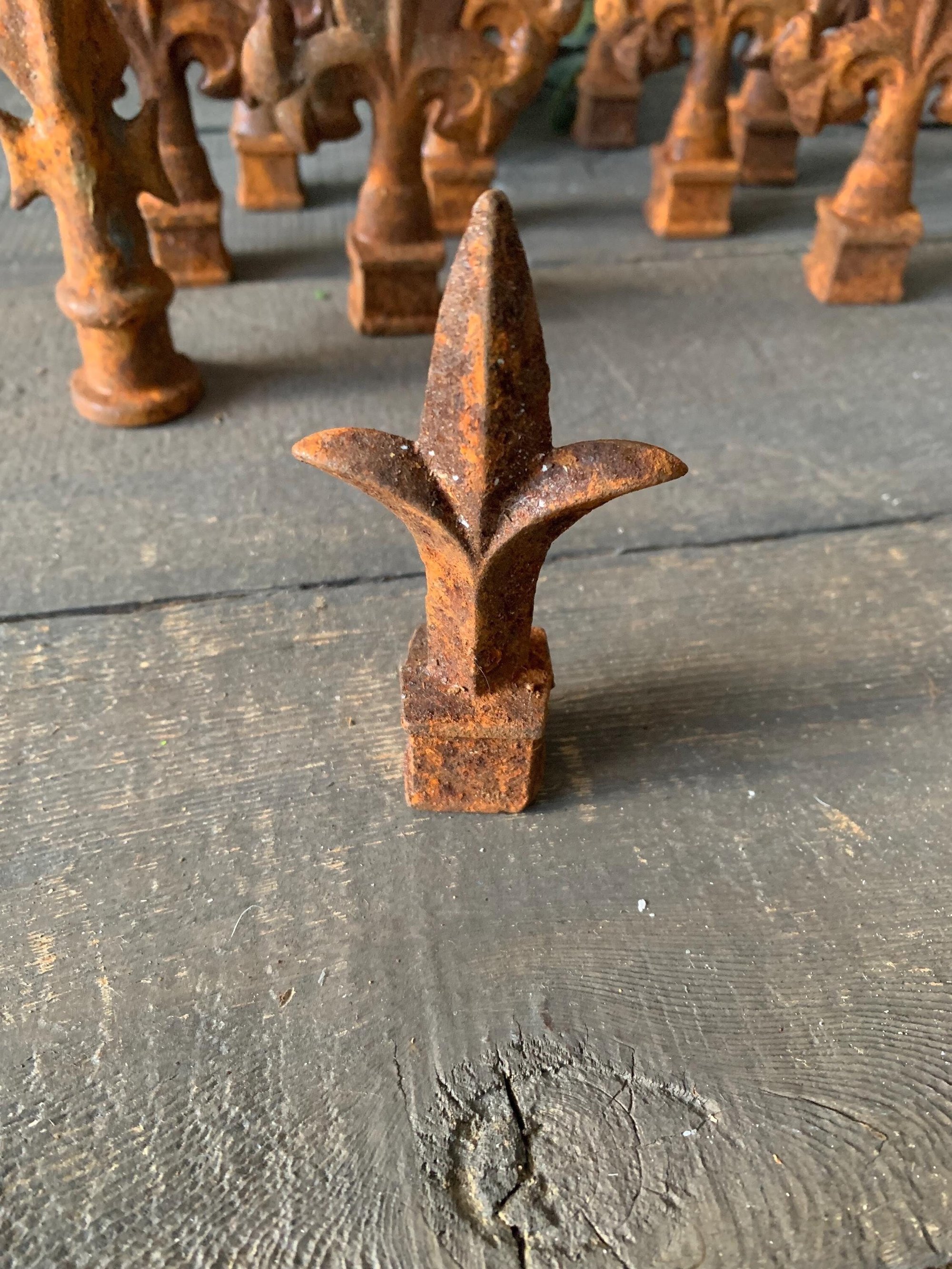 The fleur de lis finials are made of cast iron and are quite rusty. There are 2 odd fleur de lis shaped finials out of the 11. They all look like they probably came off from an old gate or something, but the possible uses are endless (craft project, finial for a curtain rod, top of a lamp, or maybe even the top of a birdhouse).