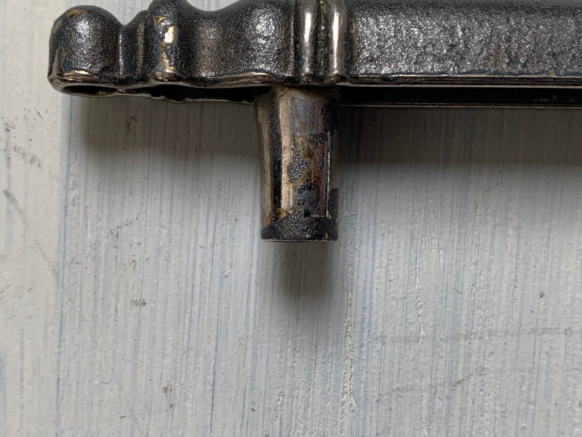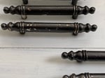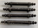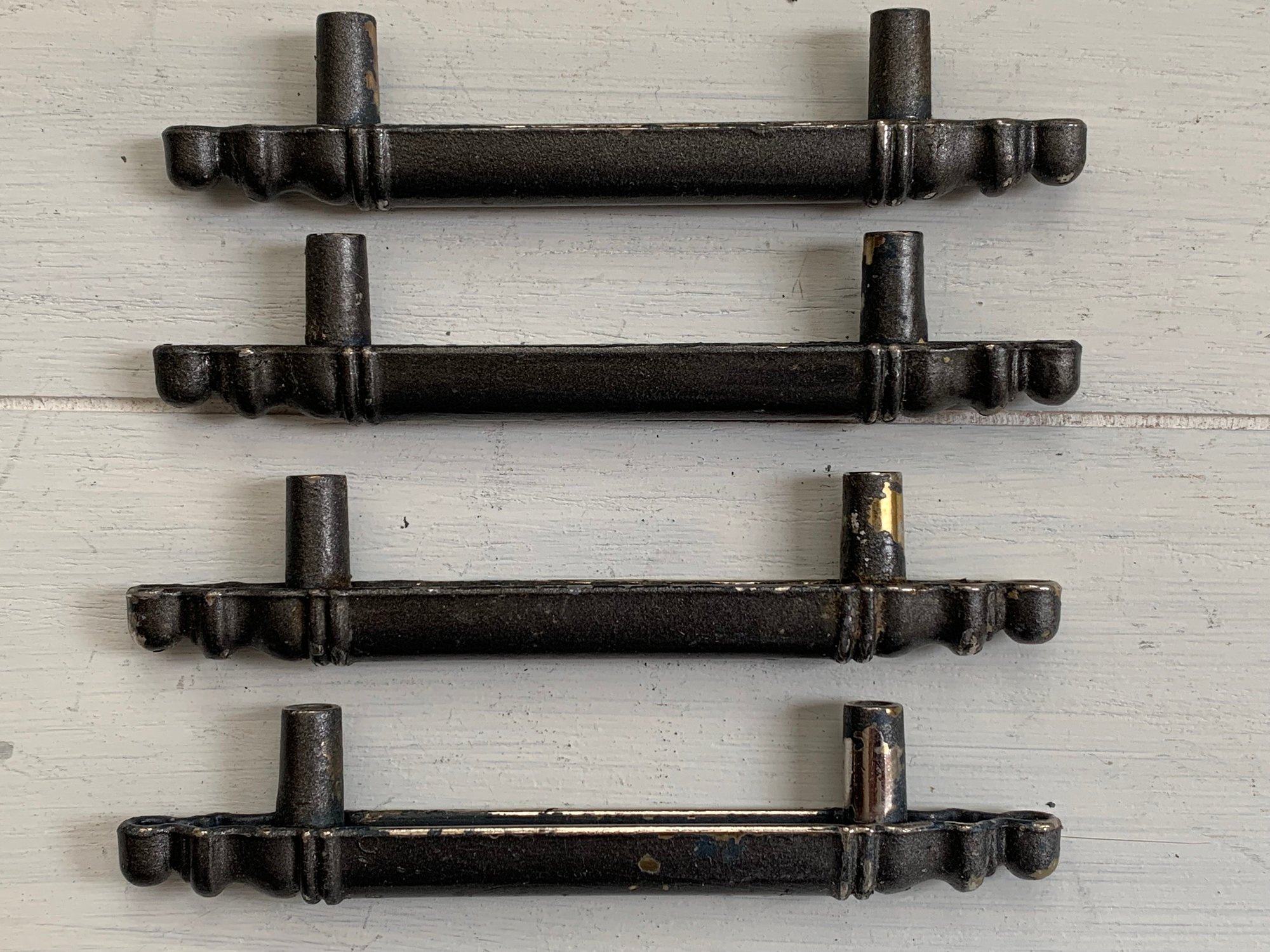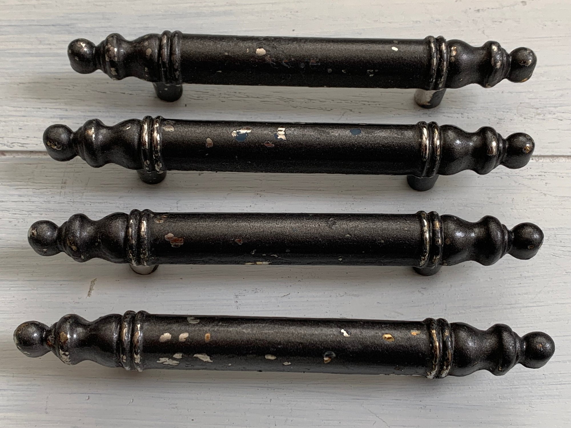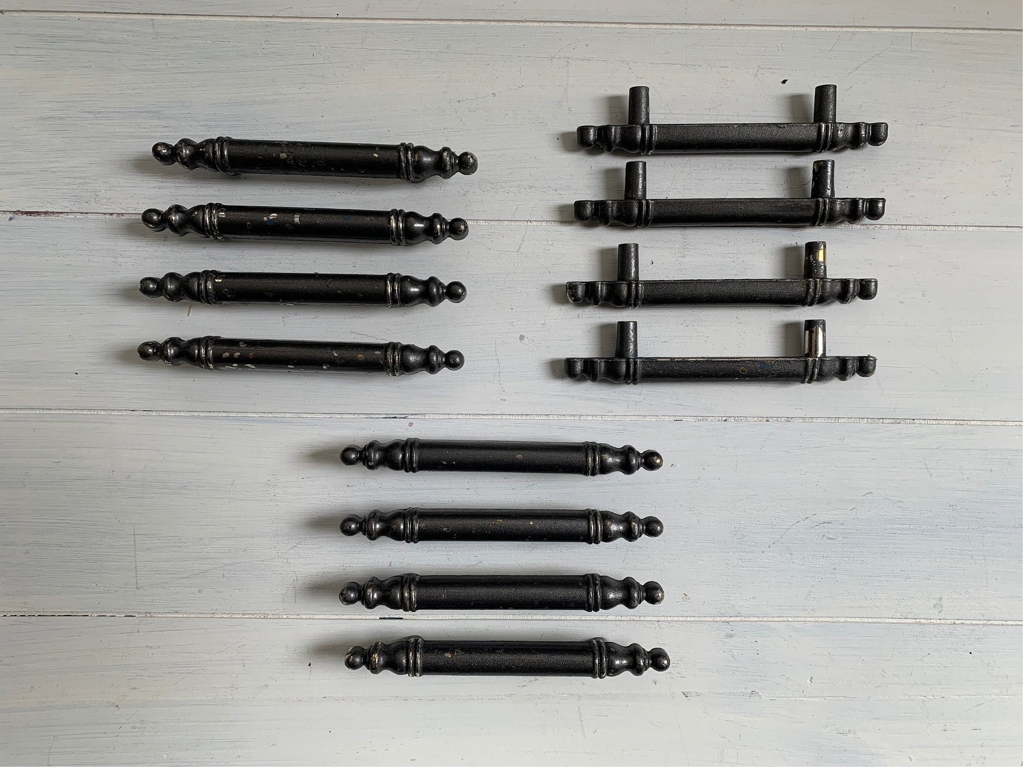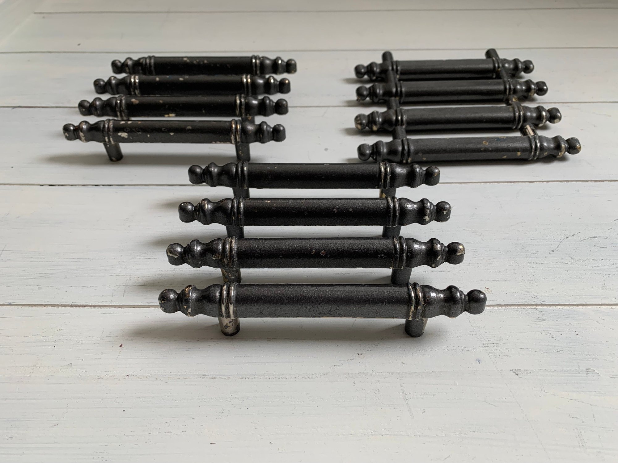 There are a total of 12 drawer handles, these are being sold in sets of 4. These look to have been spray painted gray and the finish is coming off in small areas, providing a rustic shabby look. These handles are completely sturdy and solid. The embossing shows 'Made in Canada'. There are no screws available