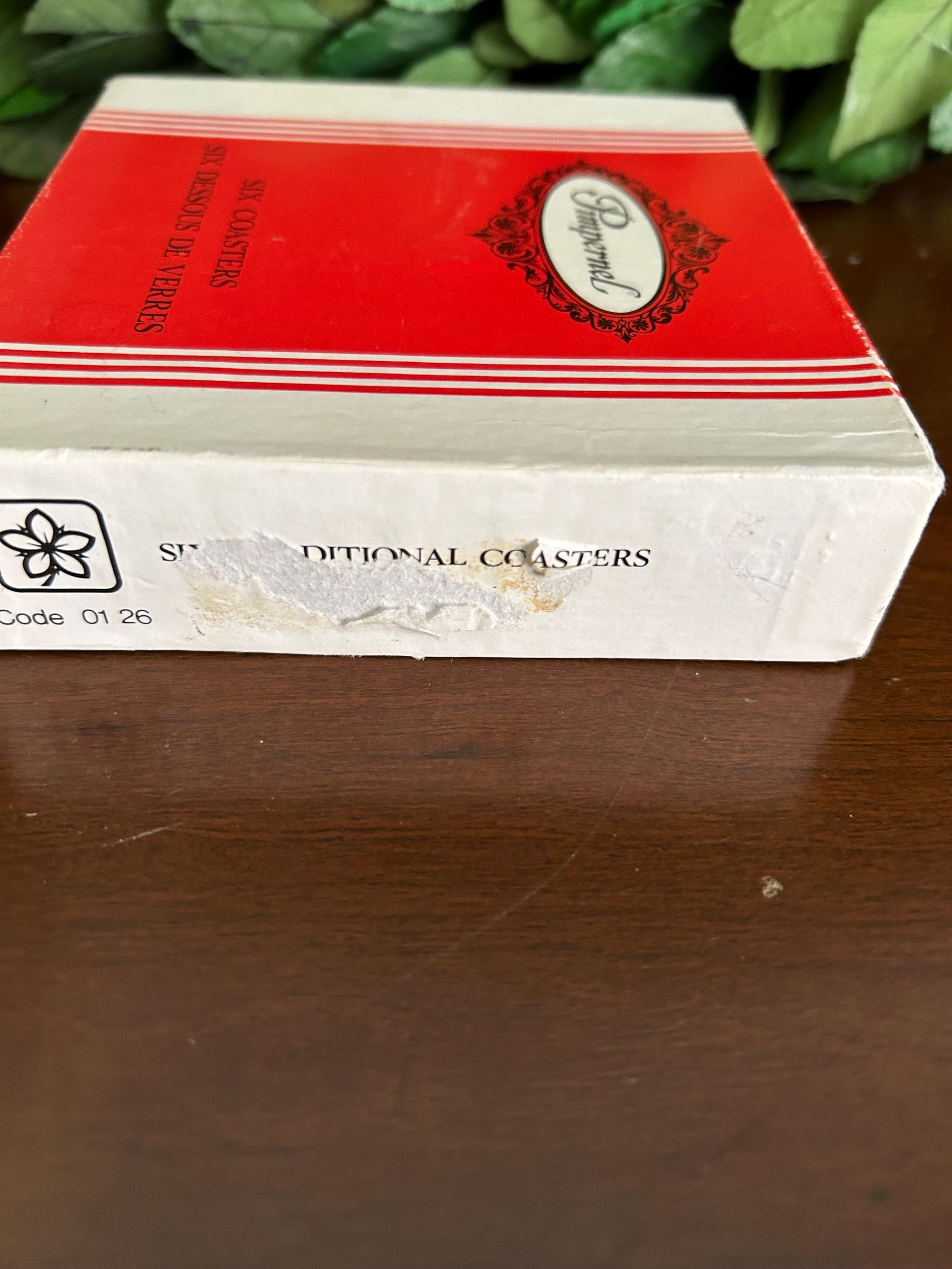 This is a set of six square Coasters in its original box. All 6 coasters are of a different Traditional English scenes. There is very little wear and tear on the coasters, they appear to have been very lightly used. The box is quite solid as well, it does have a few marks as shown in pictures