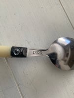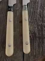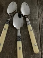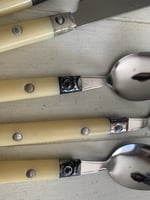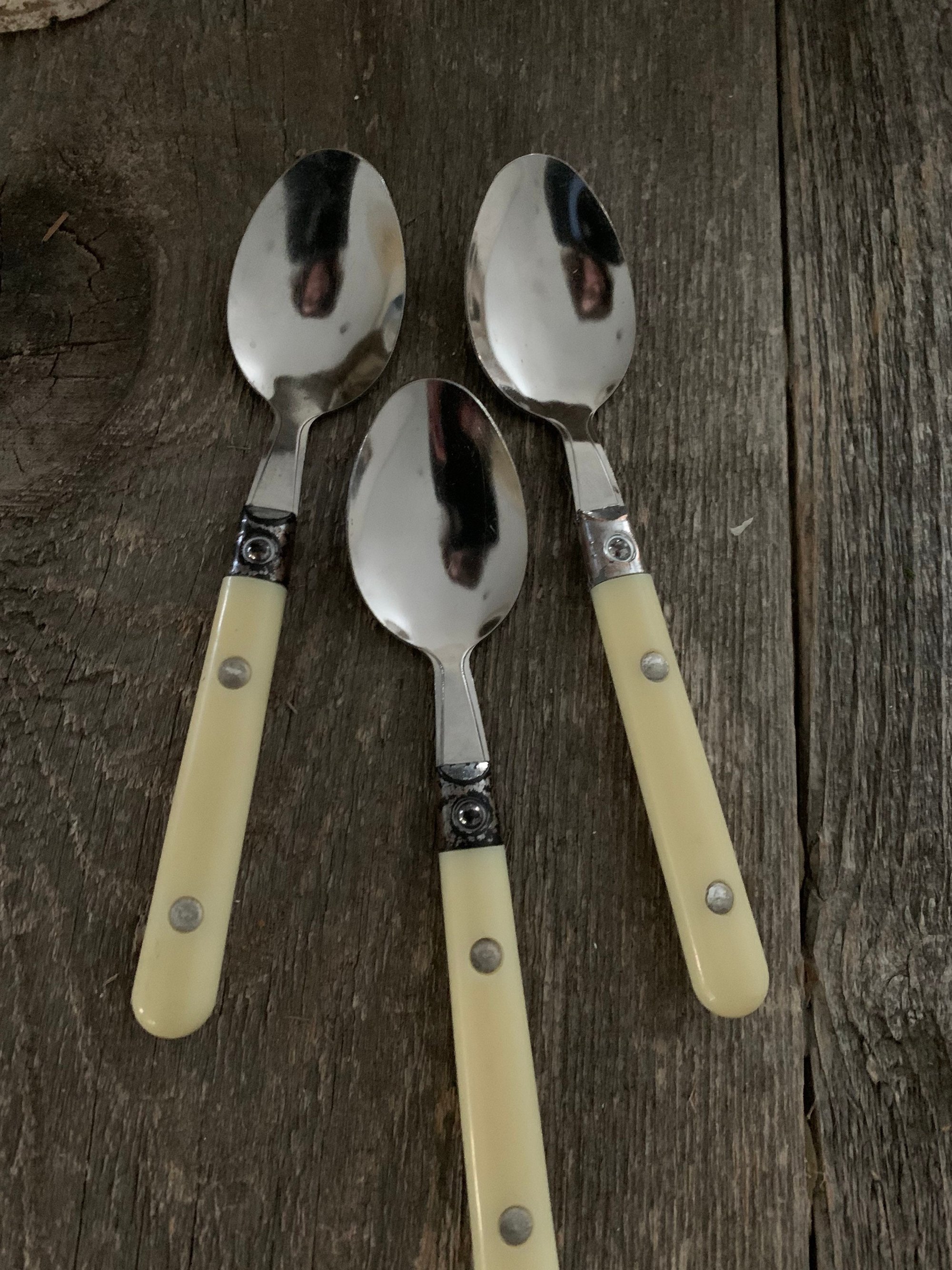 Vintage Inox Cutlery in good condition, mismatch set with 3 teaspoons and 5 knives. Serrating on the knives is still good and the spoons do not look to have been used much. The metal areas show wear due to age.