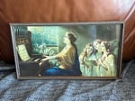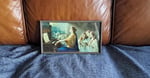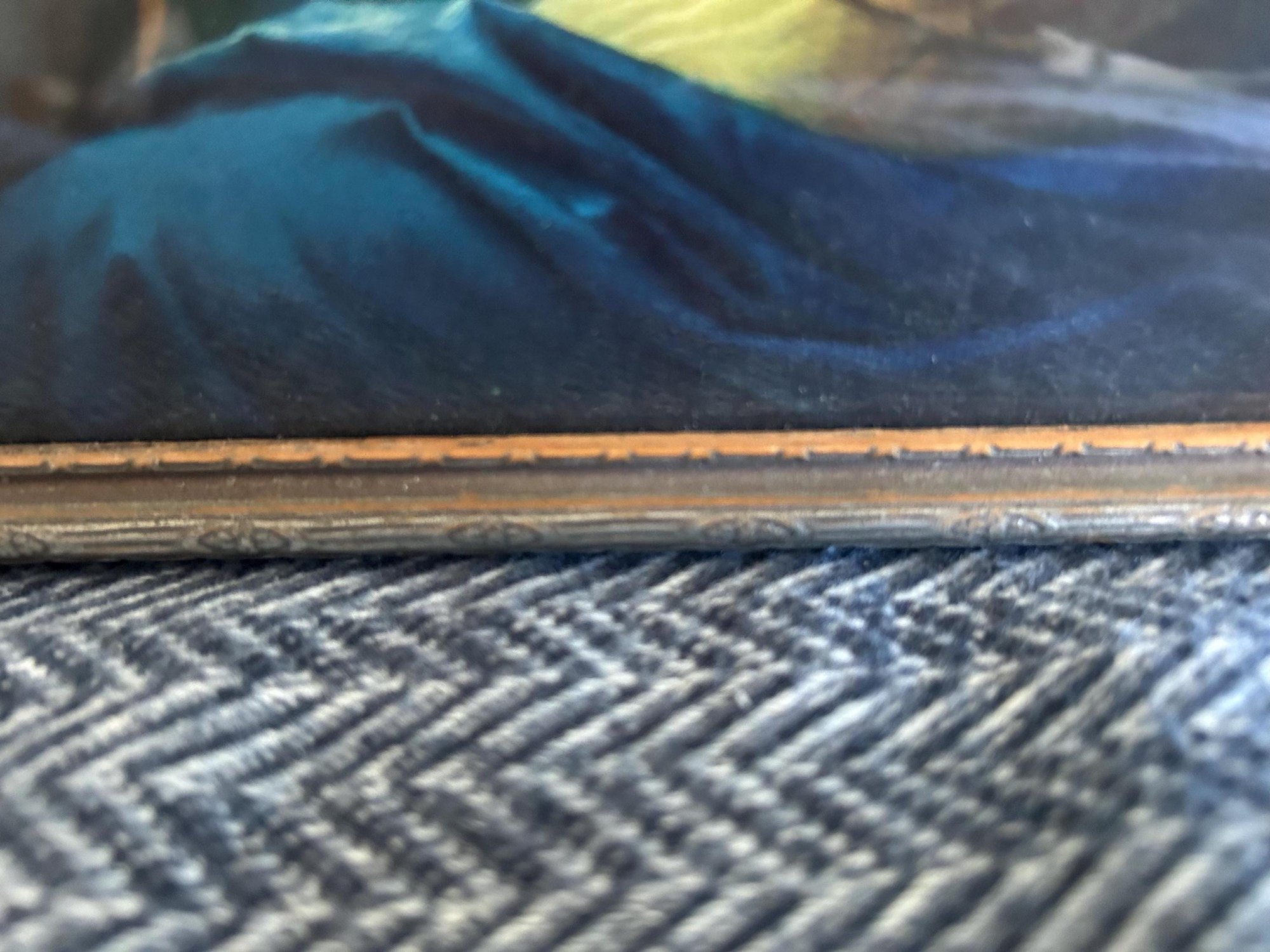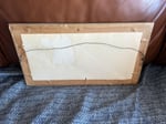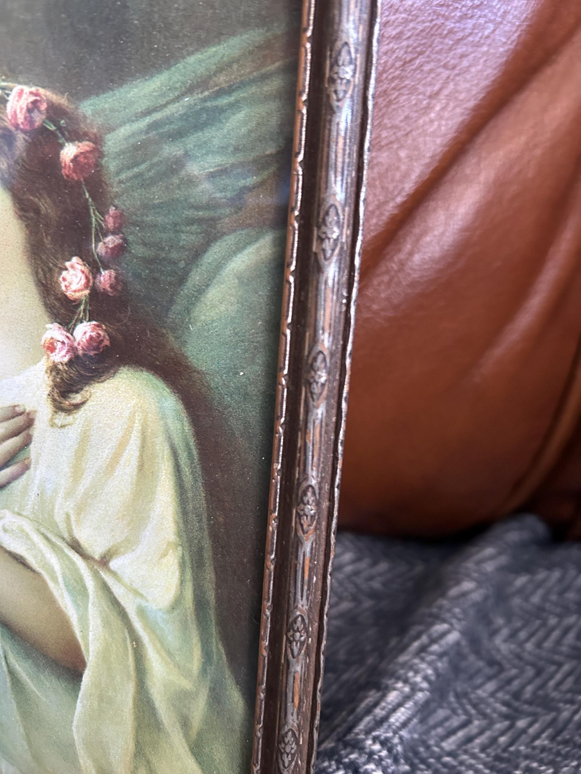 Vintage angel print in good condition and the frame is still sturdy. No marks on the wood frame besides the natural distressing of the paint from age. Minor water damage can be seen from the back (see pictures). Small ripples can be seen when the print is held up against a spot light. These ripples can't be seen under natural lighting (see pictures).