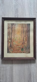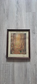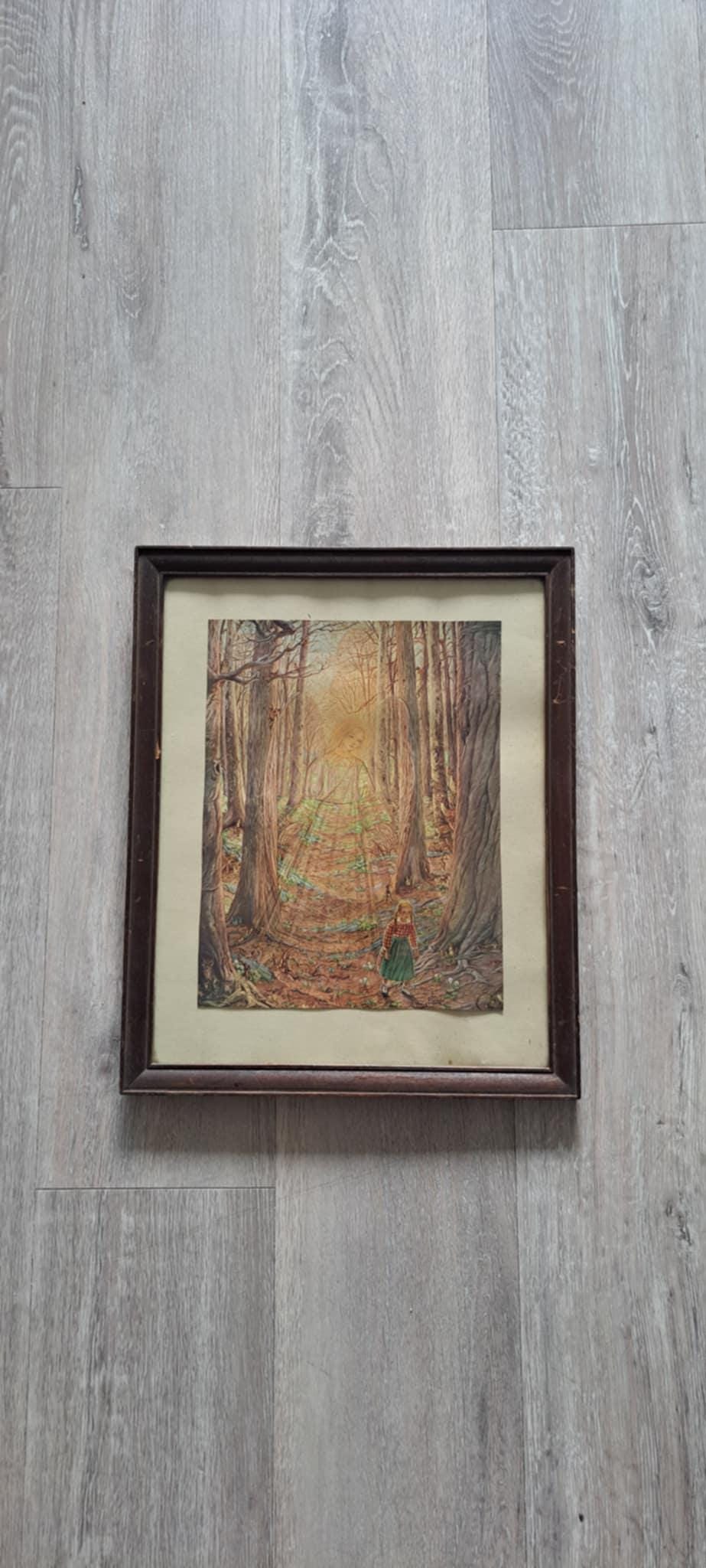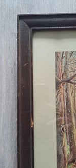 This vintage wood frame is not in great condition. The print is still in good condition, though I cannot identify who the print is by. However, the original backing tape is still mostly intact.