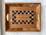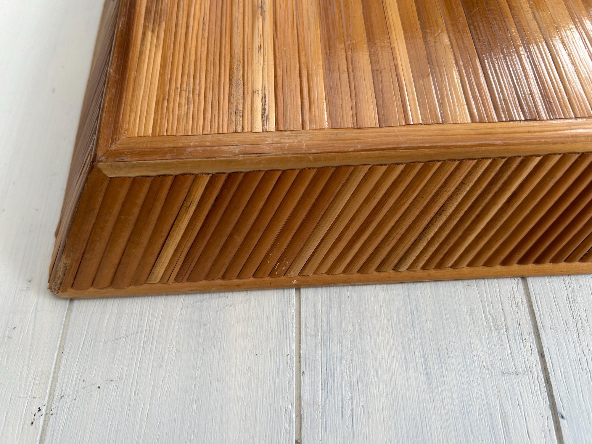 This Vintage bamboo serving or drink tray with lovely handles and fabulous design is in great shape. The tray is very sturdy. No chips or cracks or stains that I can see. The tray has a checkerboard pattern that is surrounded by vertical reeds and the bamboo or reeds have a warm teak color. The inside portion has some of the reeds painted what appears to be dark blue. Very unusual.