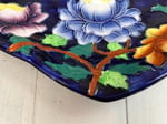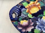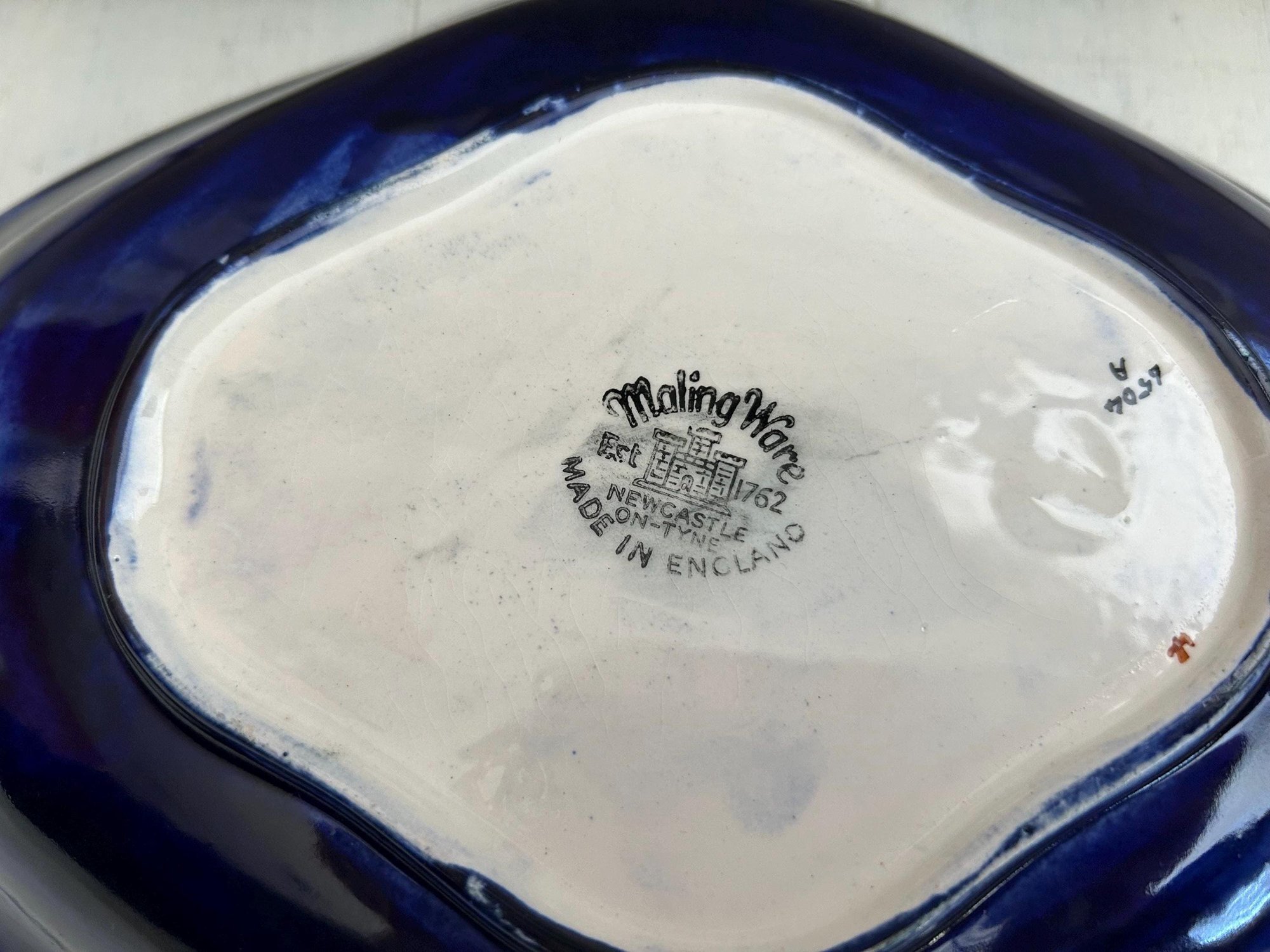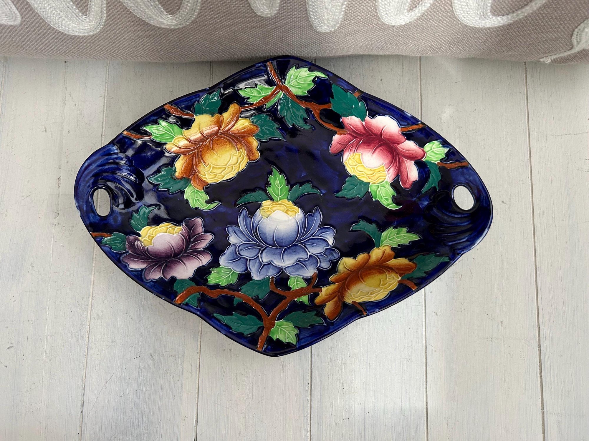 This vintage plate/bowl has such incredible colour to it, deep and rich. Its background is a deep blue and all the other colours bounce off of that. It has a depth to it so could be used as a trinket tray by the front door or just as decor on a table top. The are 2 holes on either end of the handles. The plate is stamped on the back with ''Maling Ware Est 1762 Newcastle -on-Tyne Made in England'