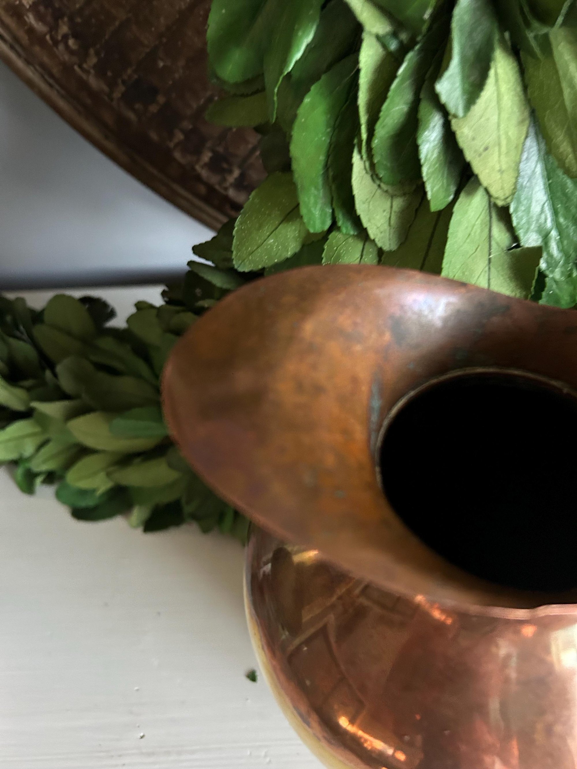 It is a mix of copper with brass and has a beautiful large arced brass handle. Imagine it with a bouquet of wild flowers on the wooden kitchen table. Perfect for country and farmhouse decor. This is most probably originally from Belgium