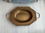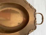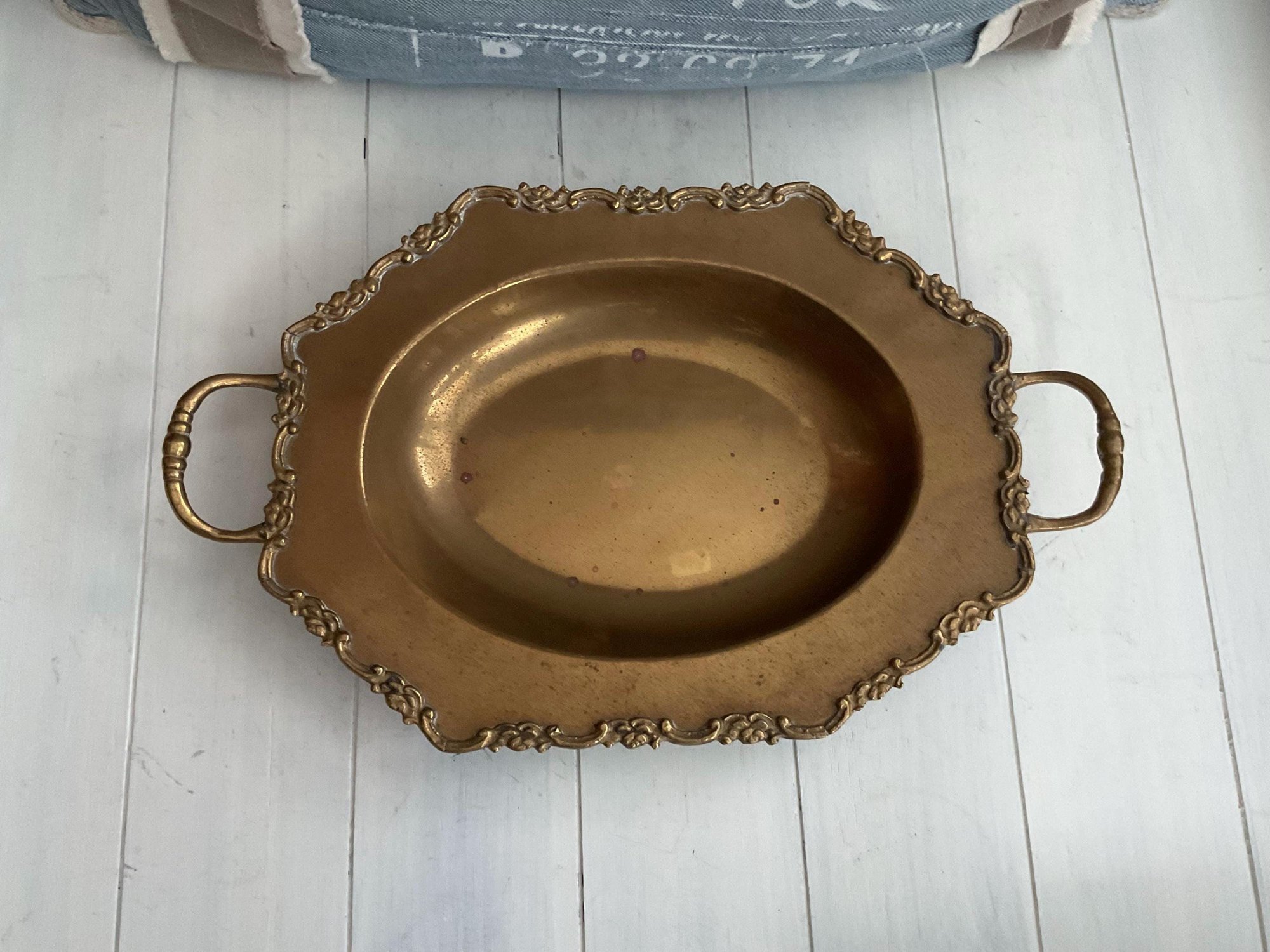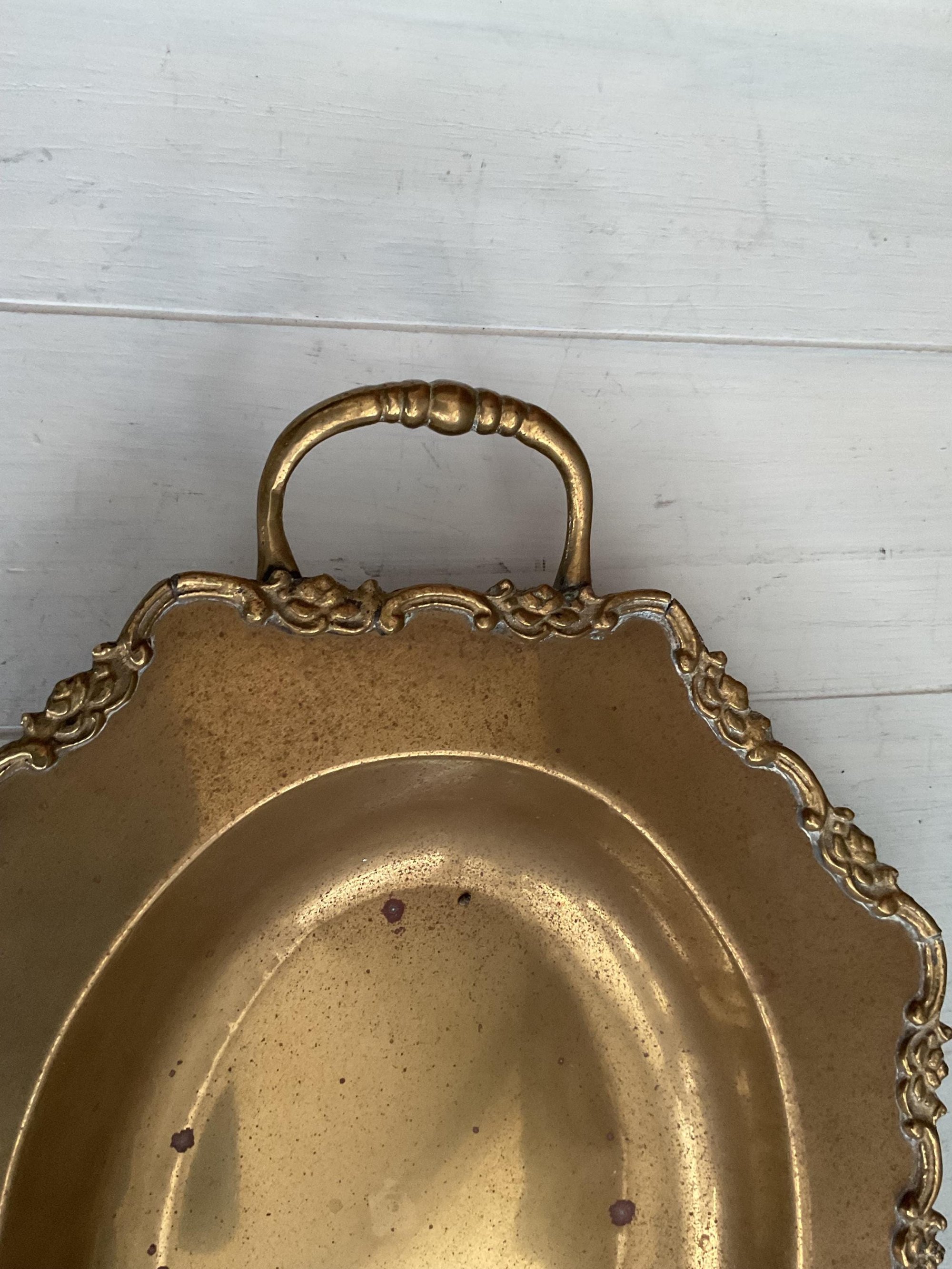 This vintage brass tray shows the beginnings of a patina appearing across its surface that gives it great character. It is sturdy and sits even on a surface.