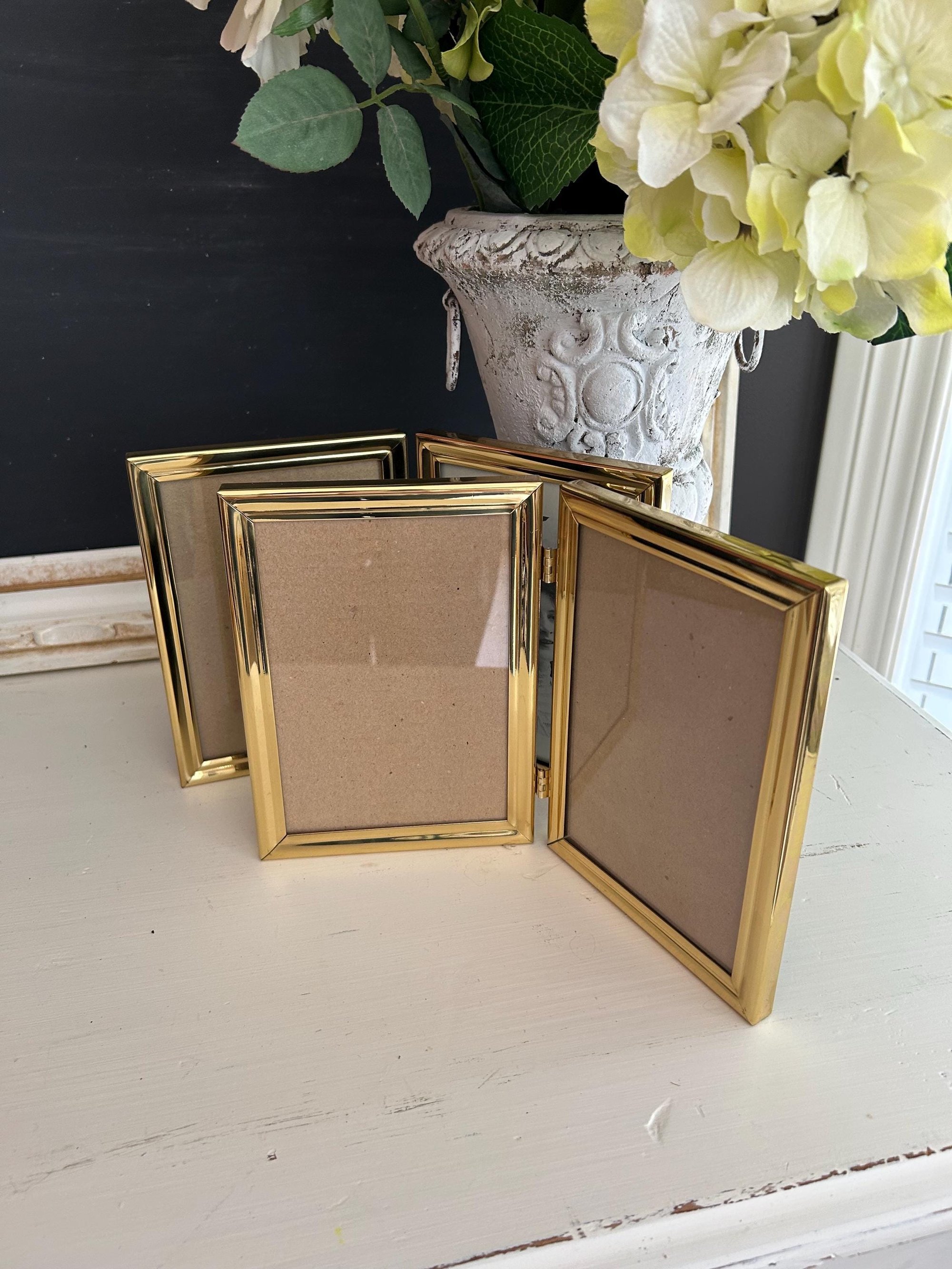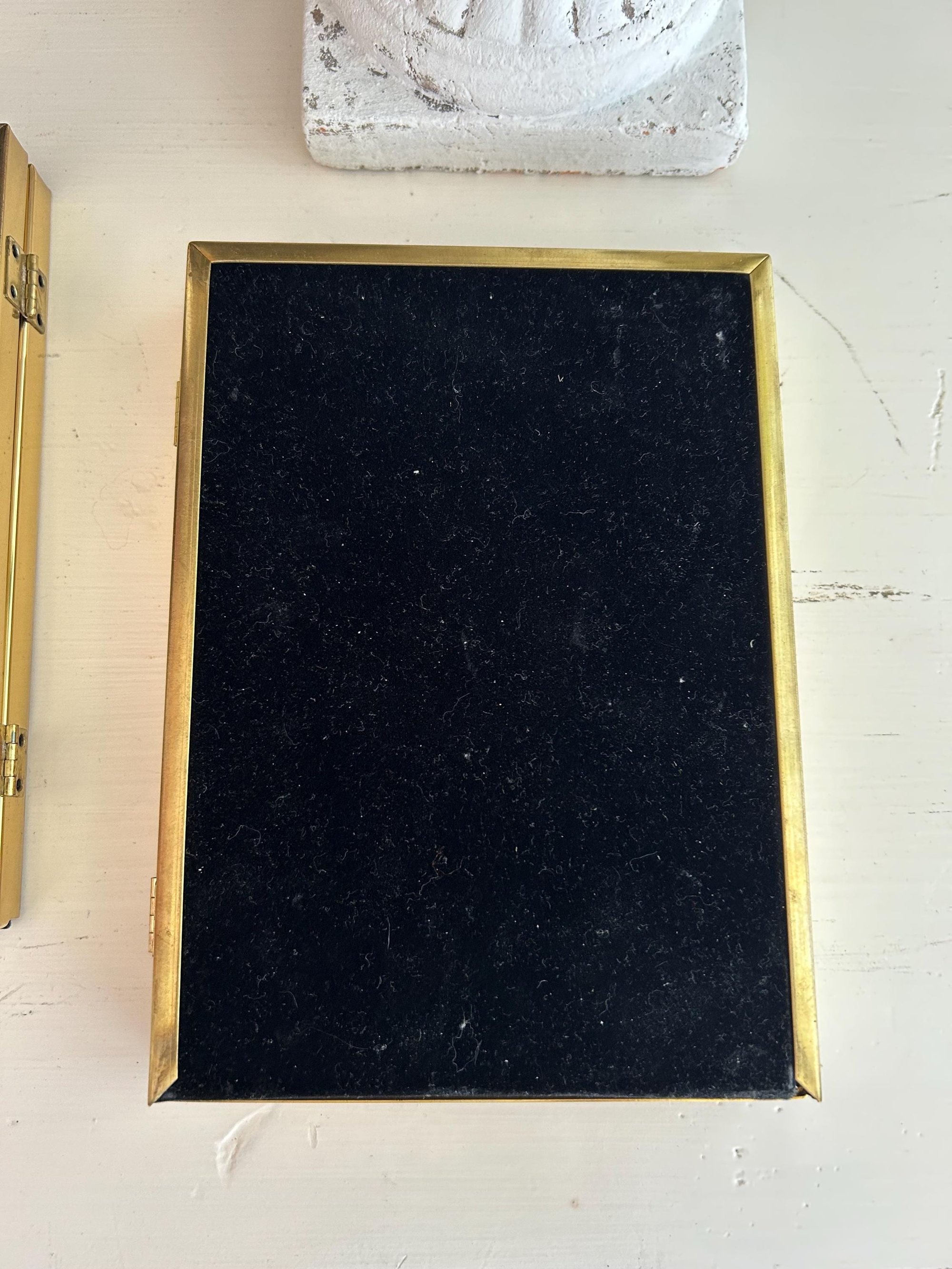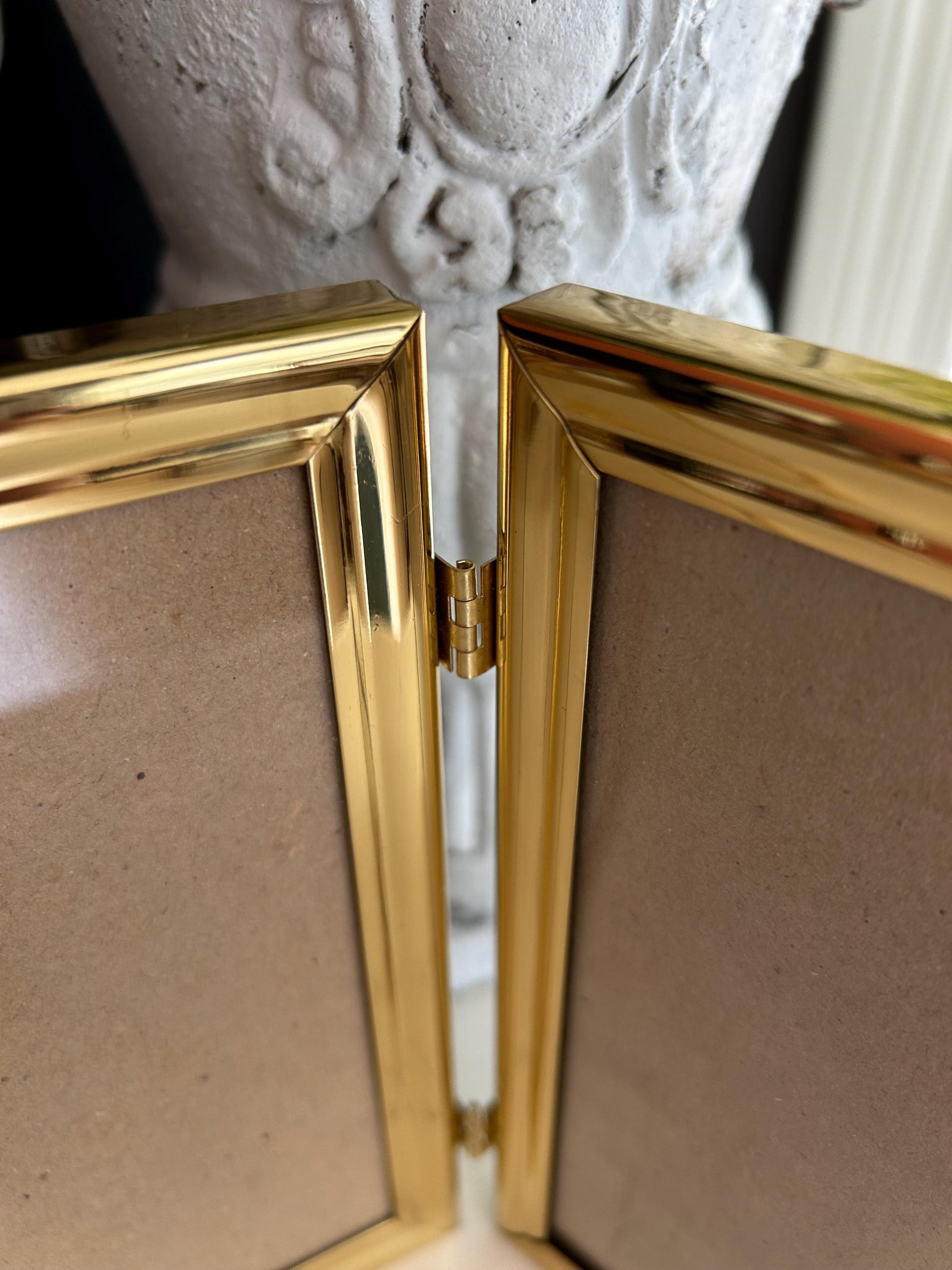 This double sided picture frame is in excellent vintage condition. The brass is in great shape and the hinges work well. Closes firmly and smoothly and the black velvet is in great shape.