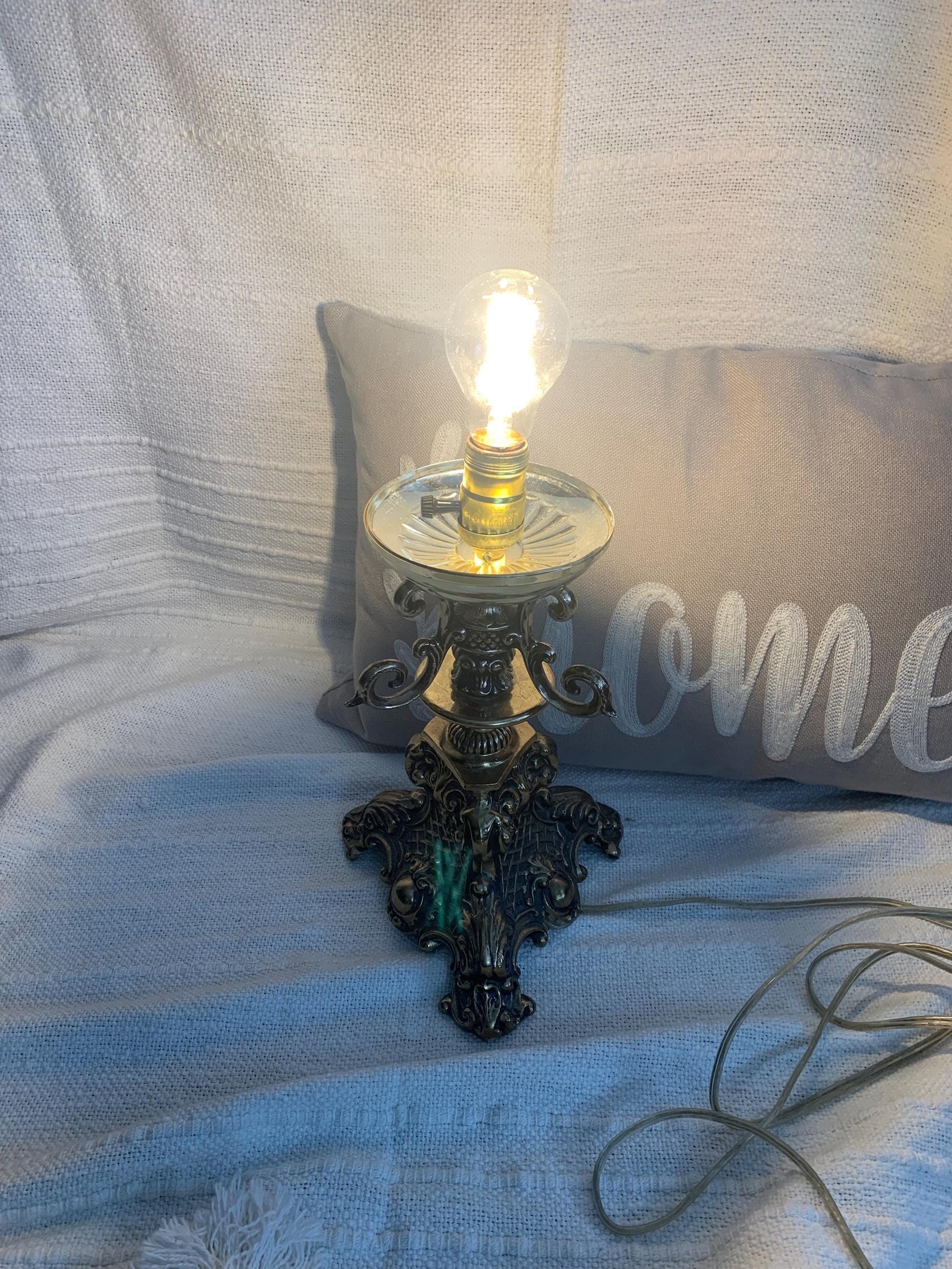 This vintage lamp is in excellent condition. It has been tested and works. There is no shade or harp. All wiring is original so could be changed if preferred but everything works.