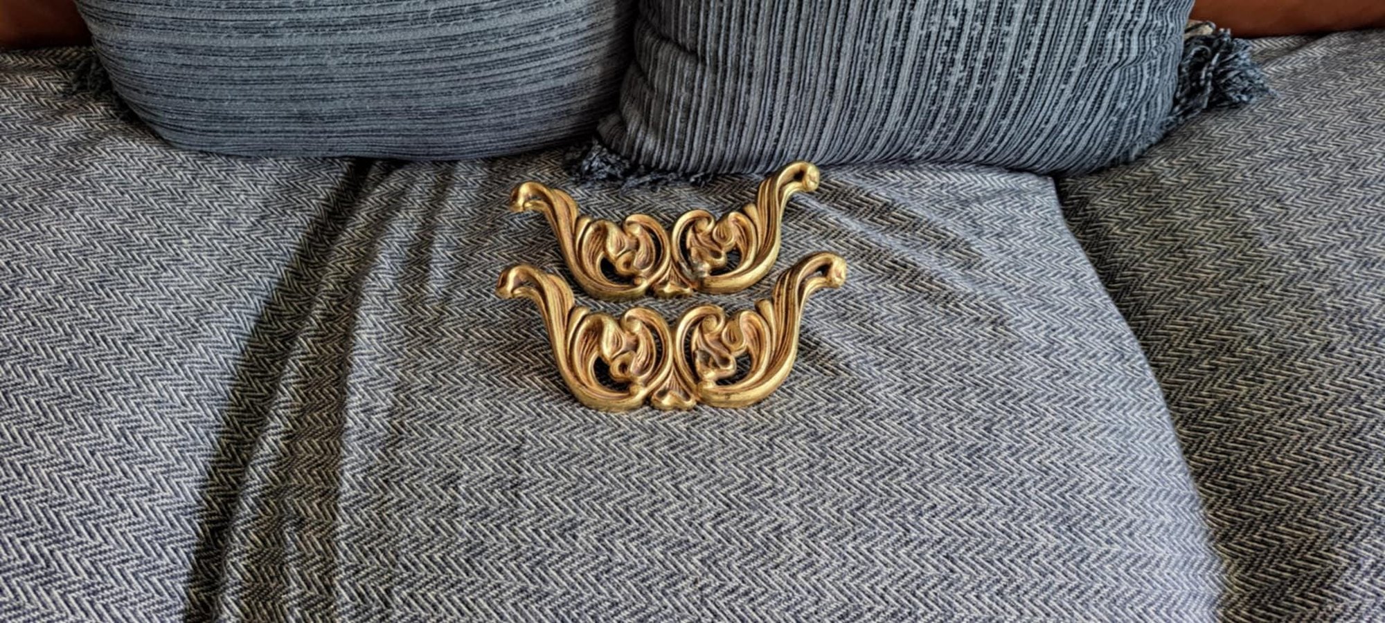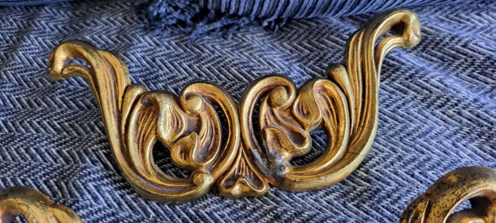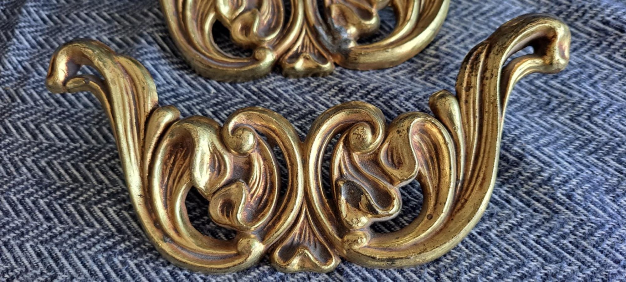 A pair of vintage brass plated rococo furniture or frame corner trim. There is some patina on both pieces; one piece has some rust on the front (see pictures). Despite this, both are in sturdy vintage condition.