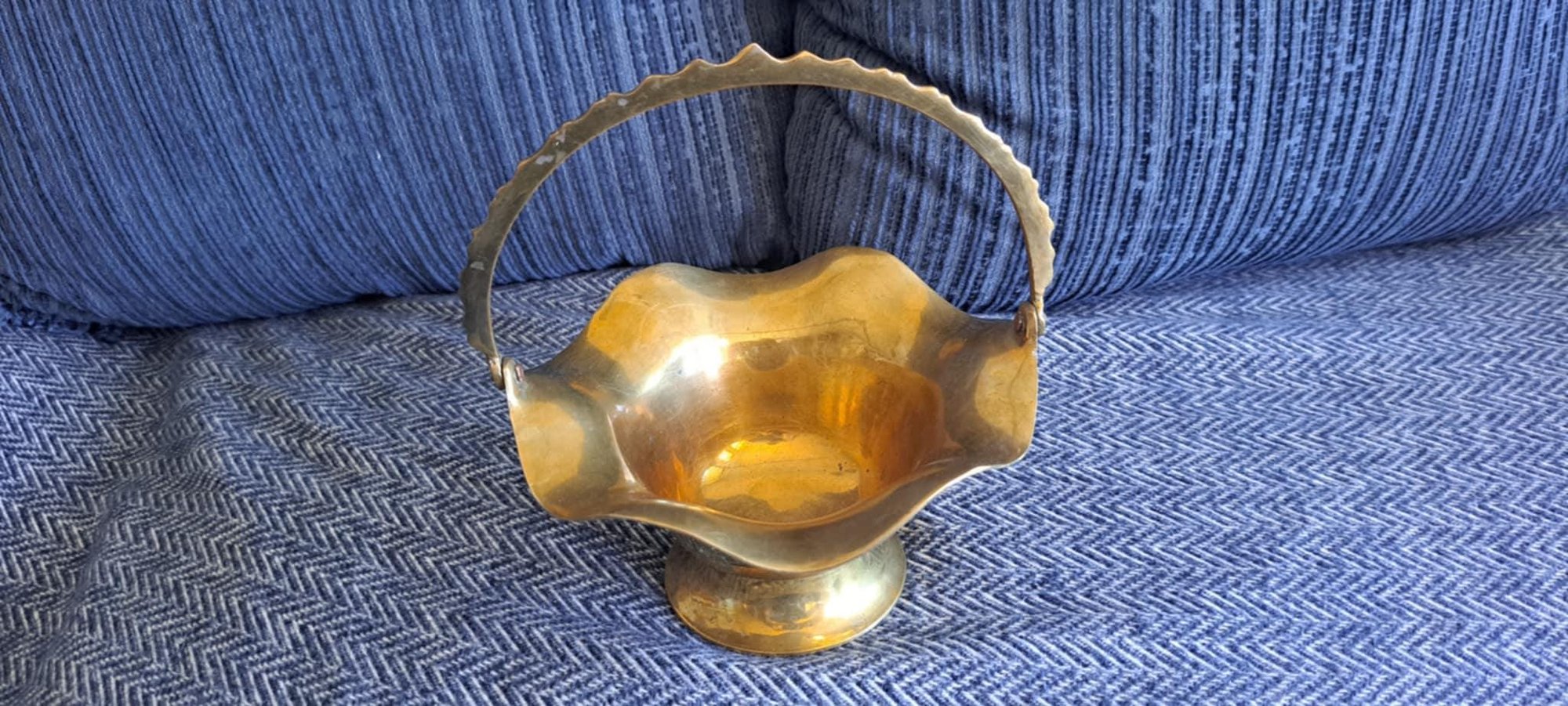 This solid brass dish is made in India and in good great condition. The bottom is strong and sits square on any surface. The handle is a bit stiff but works well.
