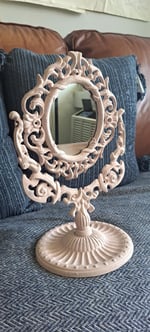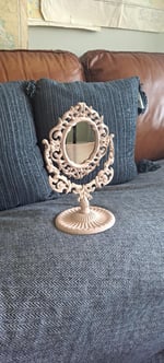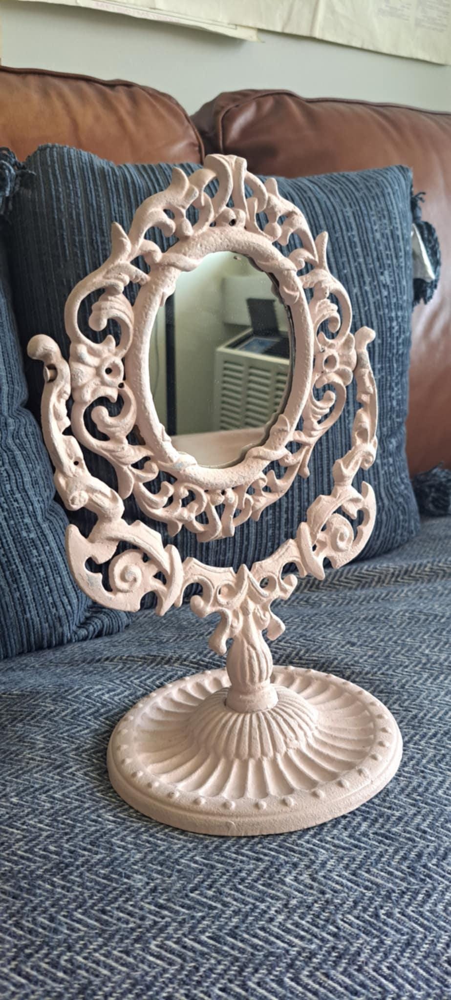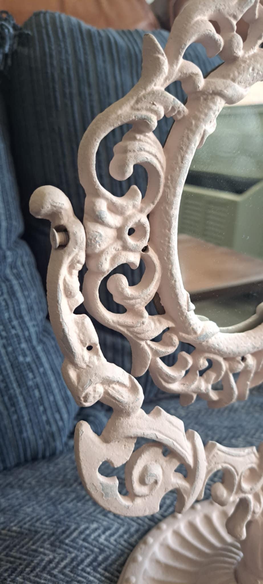 This vintage cast iron mirror is in good condition. The frame portion swivels on the stand very nicely, no issues.