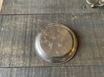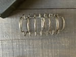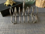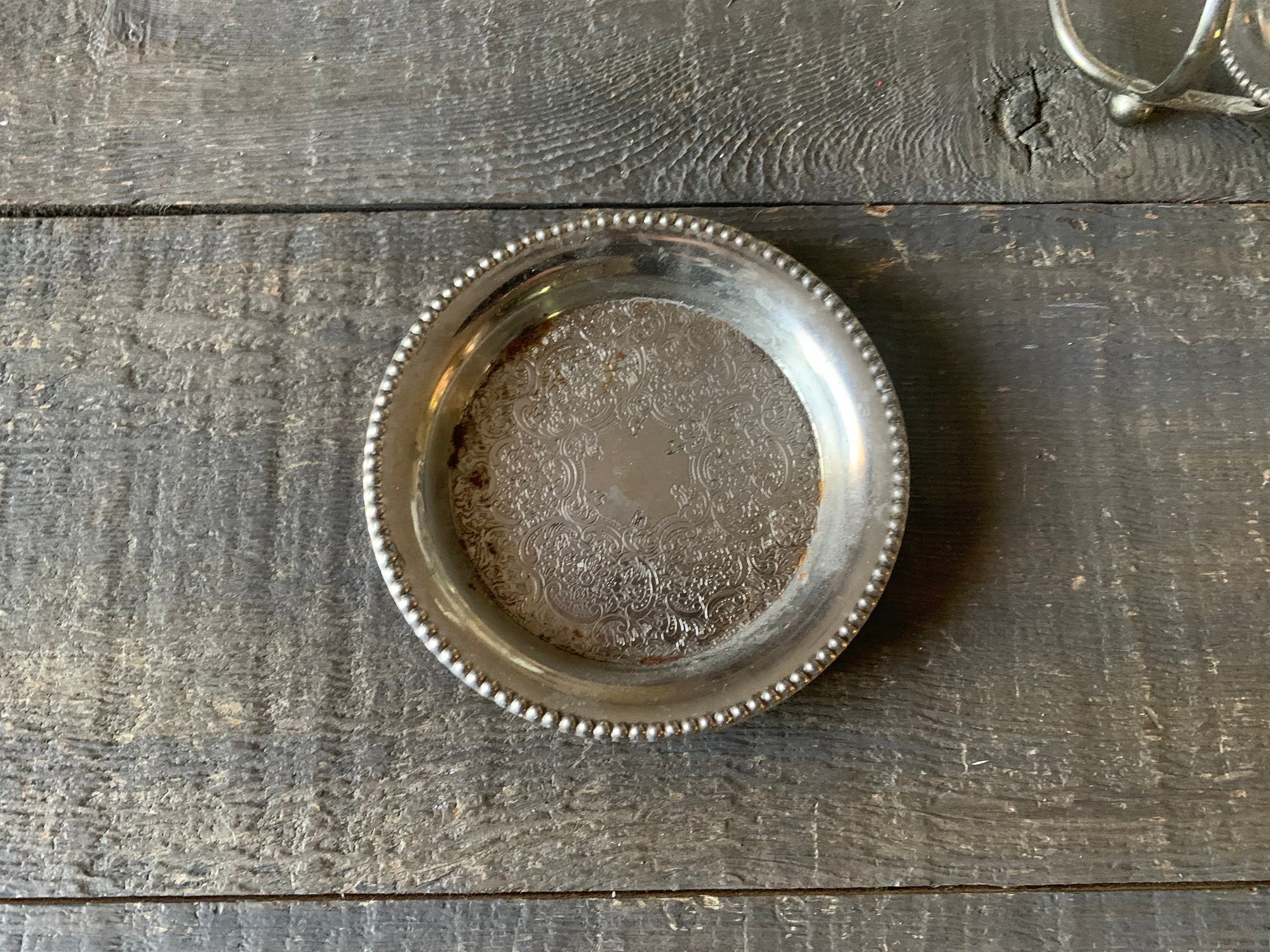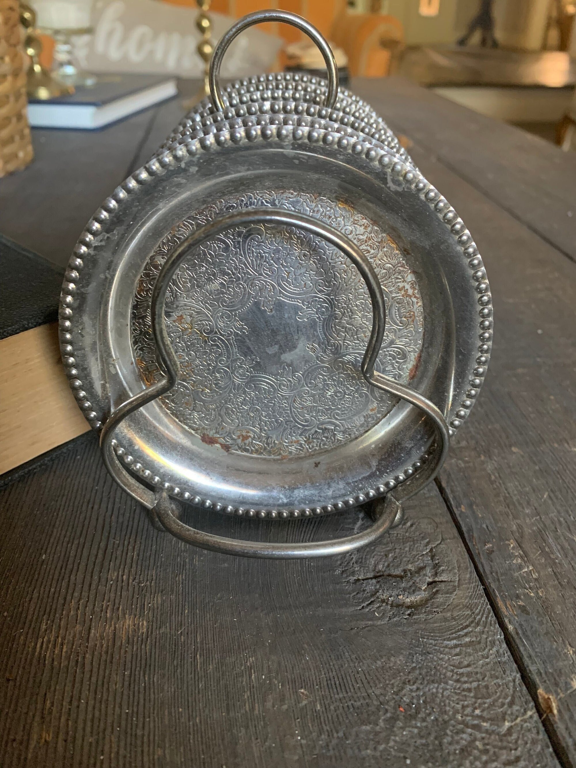 Vintage set of six coaster set with sturdy metal caddy. Lovely aged patina on the coasters. If one prefers shiny I am sure they can be cleaned up, it has been left with the patina for an aged look. The caddy is in great shape, no wobble or bent metal areas