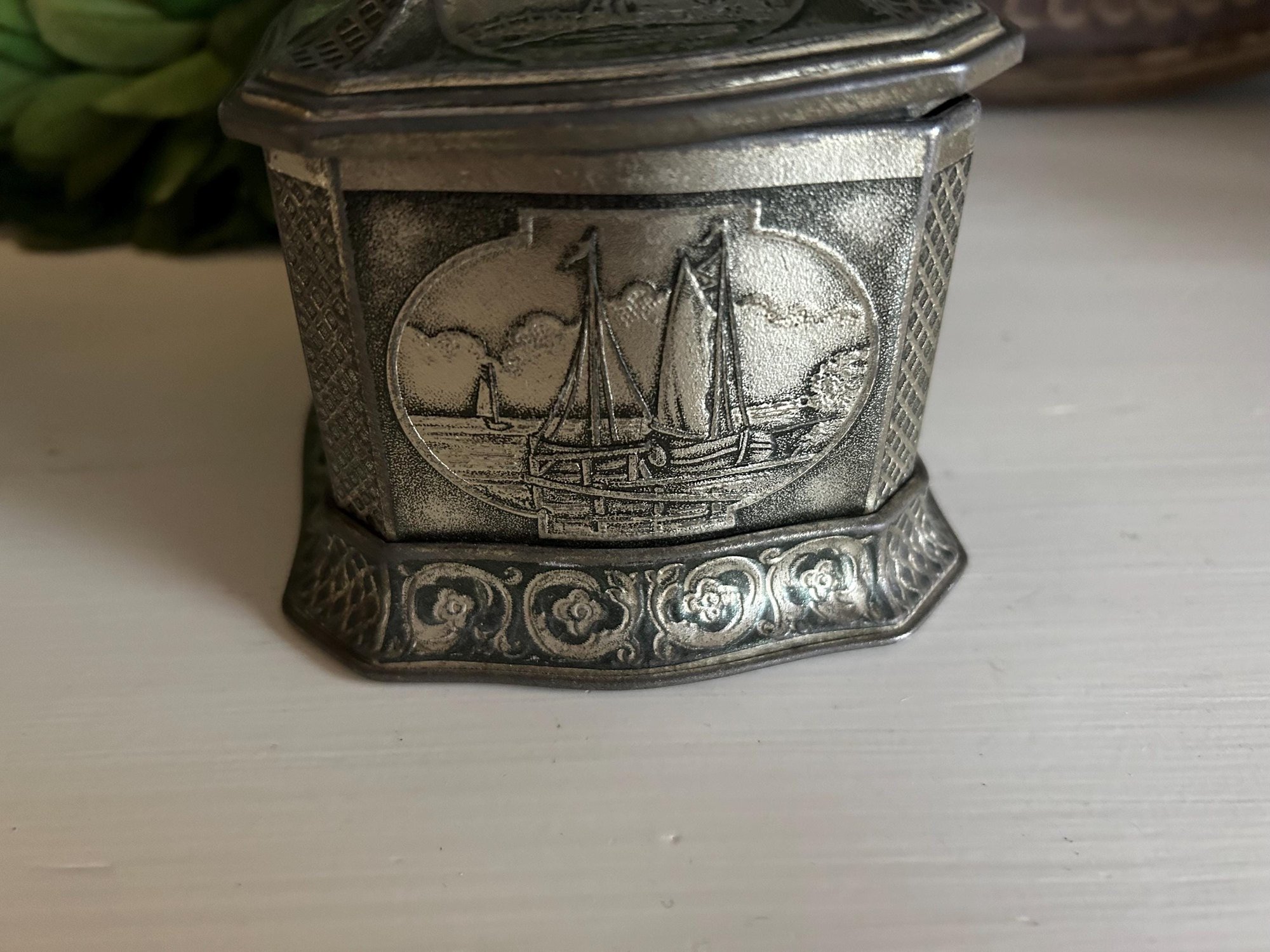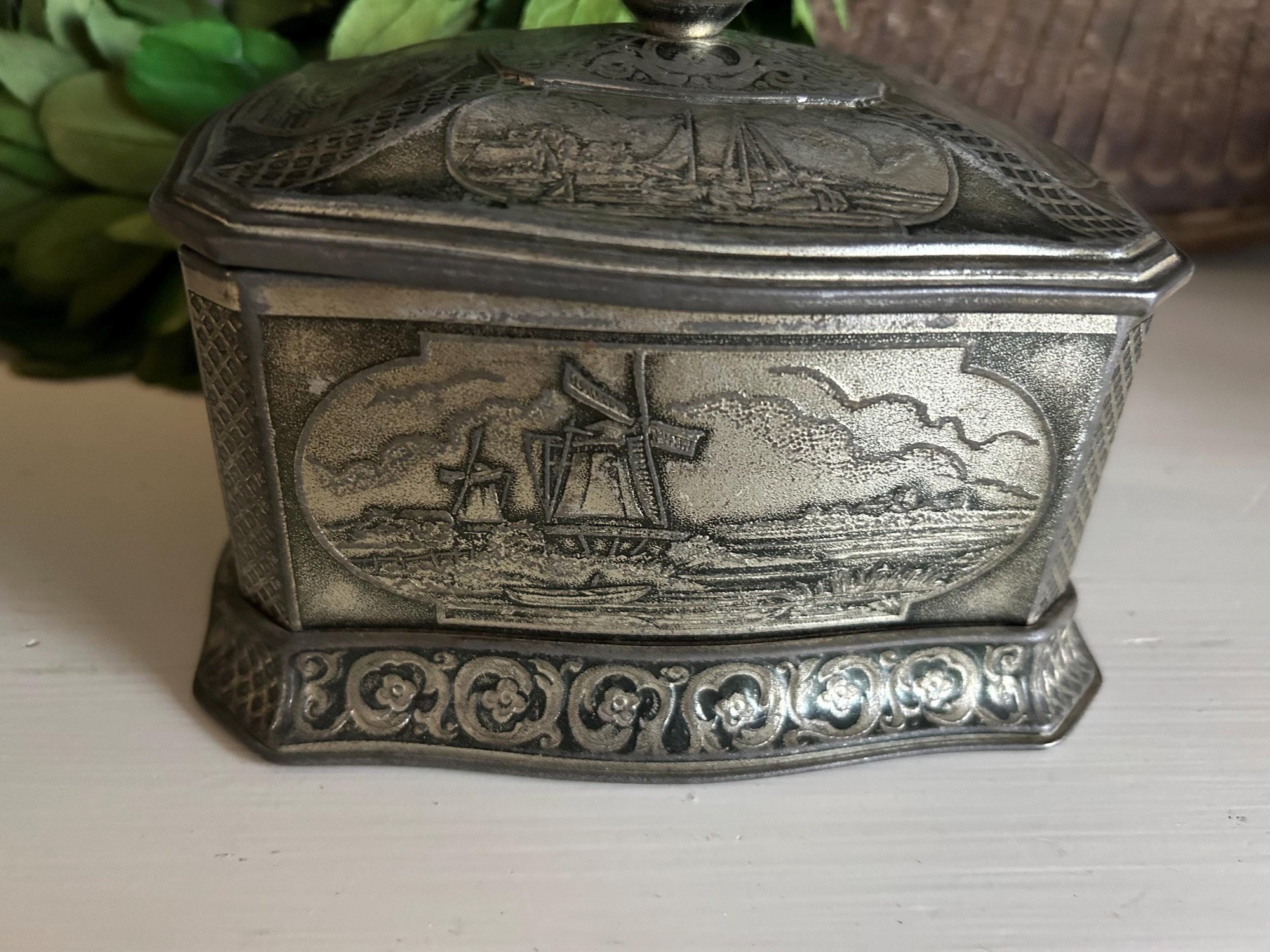 This is a lovely vintage Dutch metal biscuit tin with charming Dutch scenes of windmills and sailing boats on all sides of the tin, it is in good vintage condition. Lids comes off and goes on, it is abit snug but easily removable.