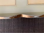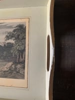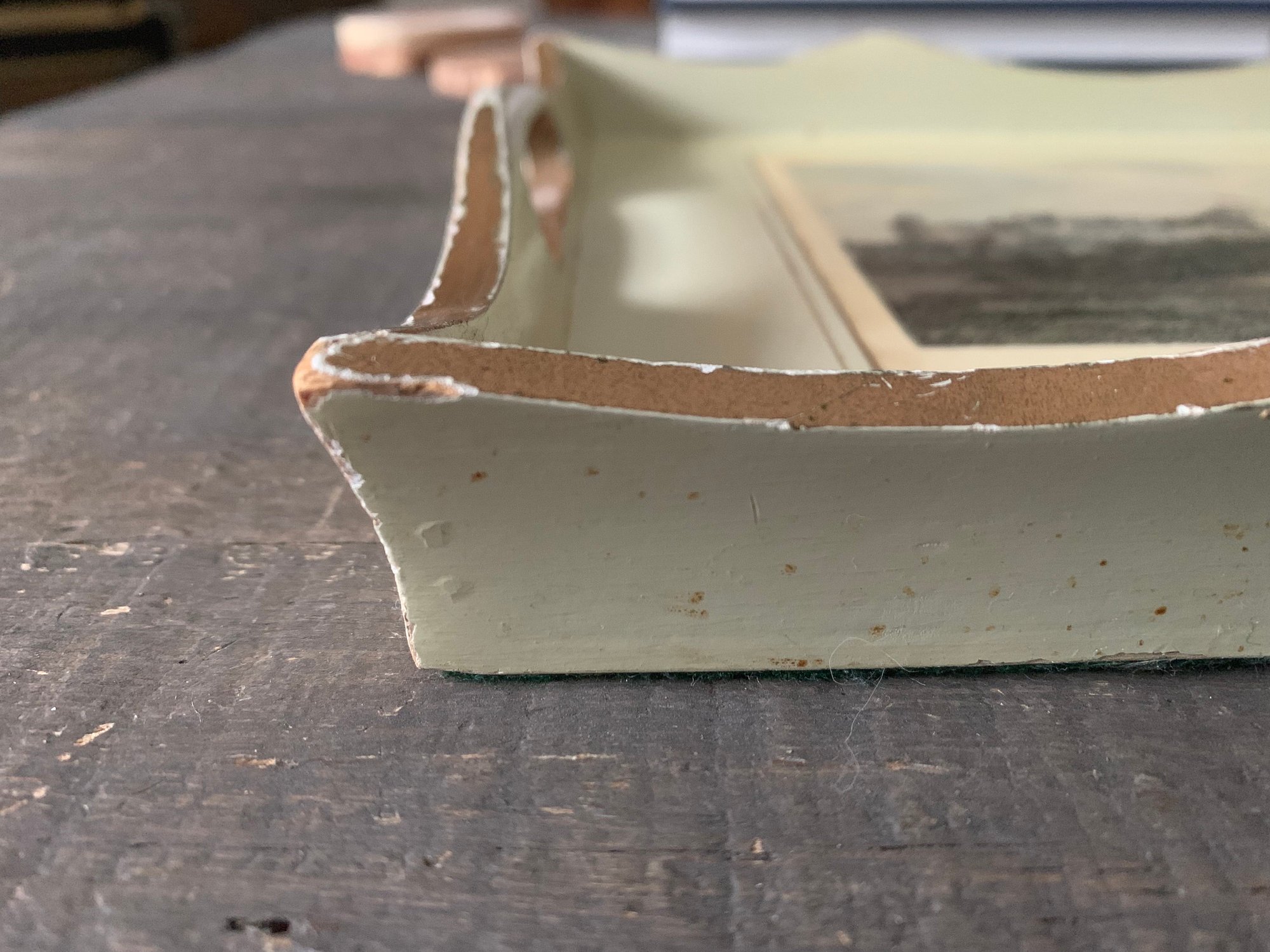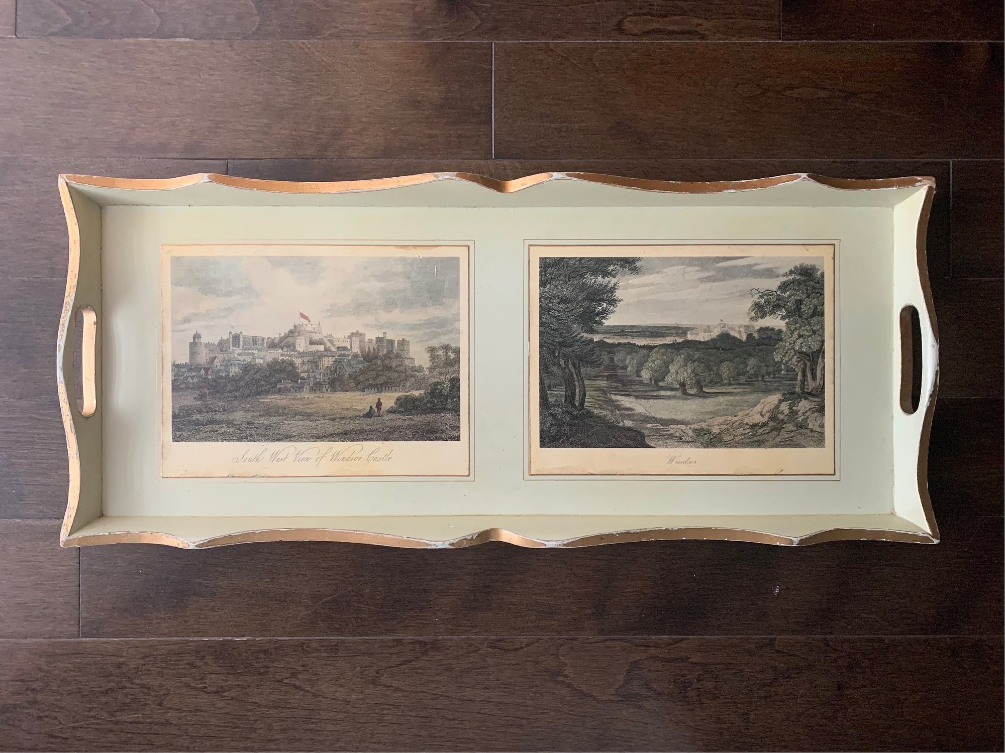 This rectangular tray is a great example of vintage decor. The pictures of Windsor Castle are showing wear, they appear to be old paper pictures glued onto the tray. The soft green color and the gold accents are showing beautiful wear giving it an amazing vintage look. The felt on the bottom is still in very good condition. Sits firm and even on tables.