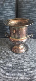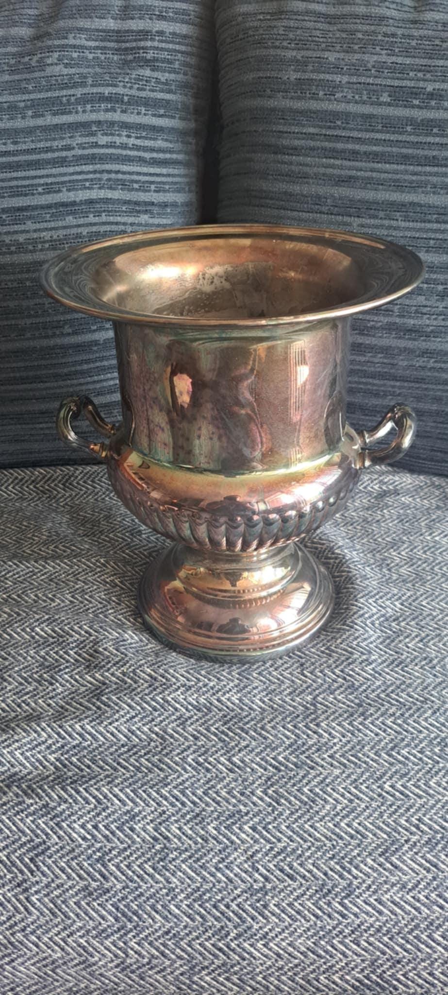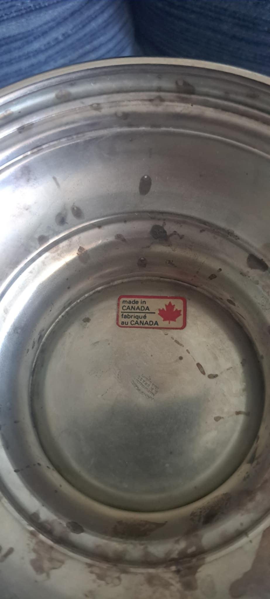 This electro plated brass pot made in Canada is in good vintage condition. The bottom is strong and sits square on any surface. There is a bit of a scratch above one of the handles (see pictures).