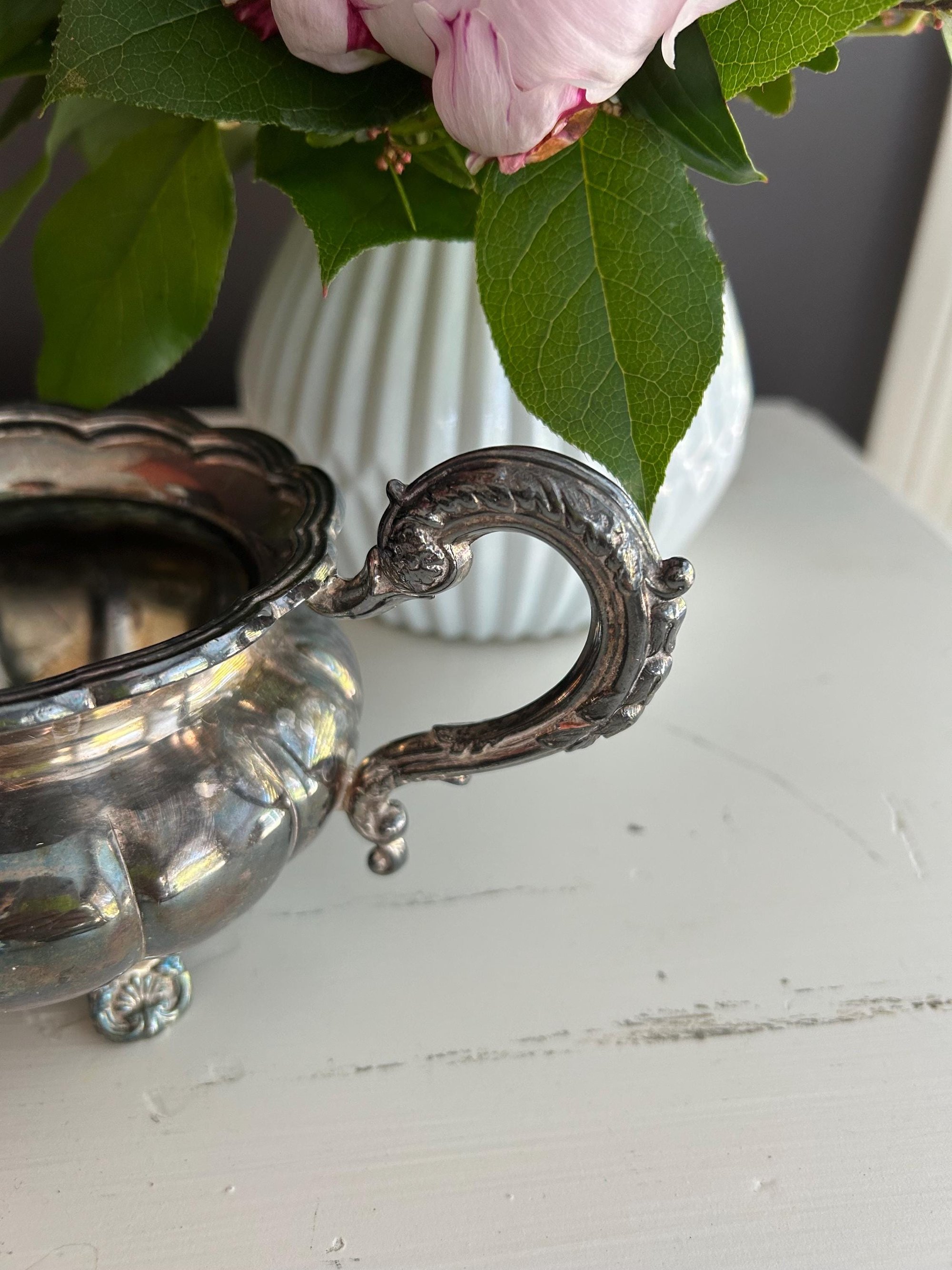 This vintage silver creamer is on the larger size as well as having some unique details. The edging and the feet are very pretty. The patina that is starting is very unique.