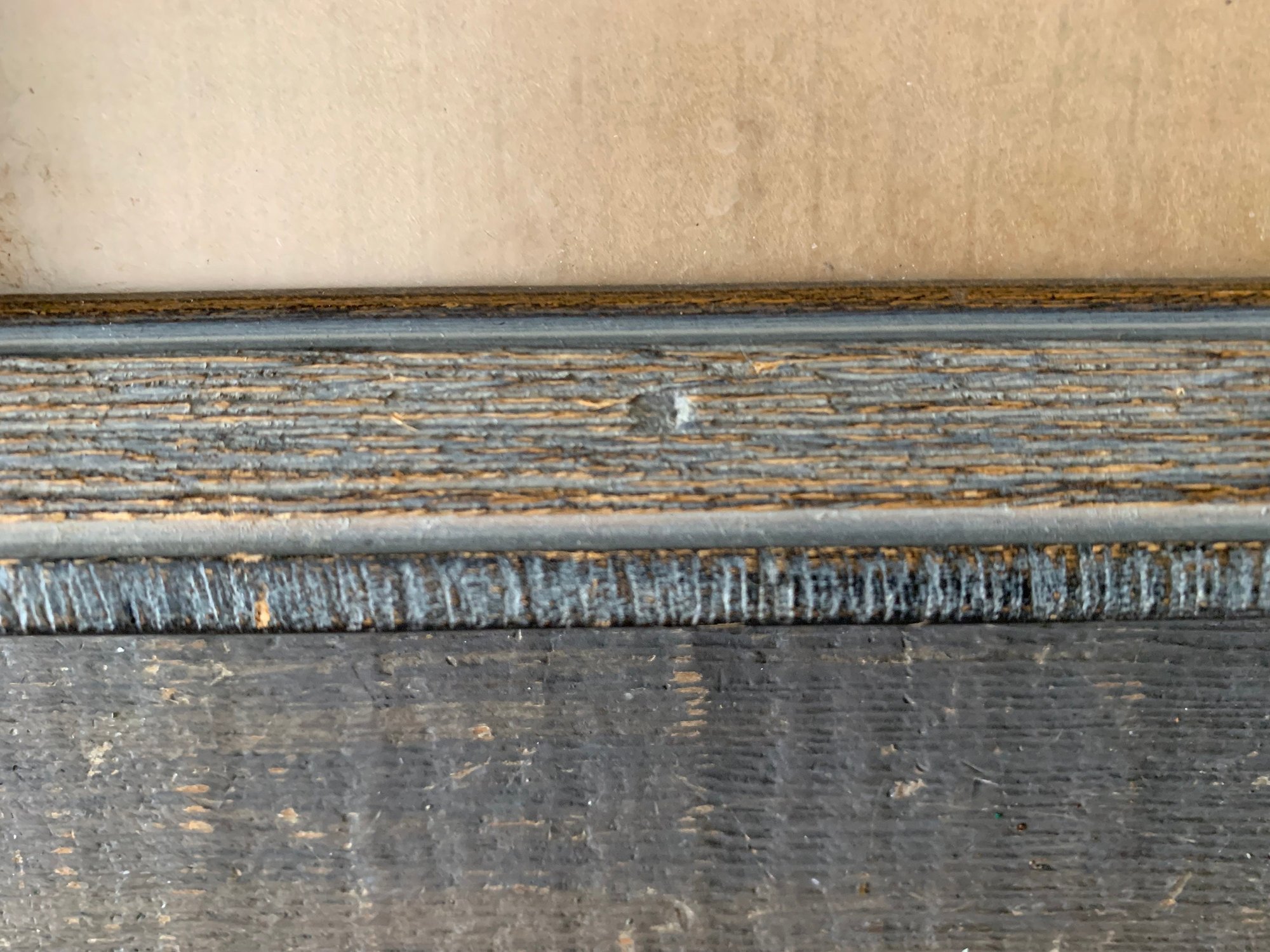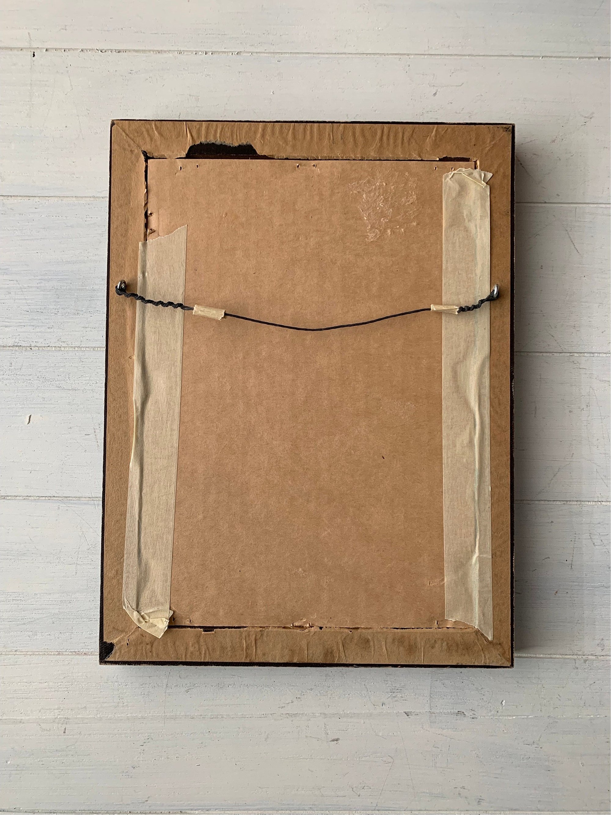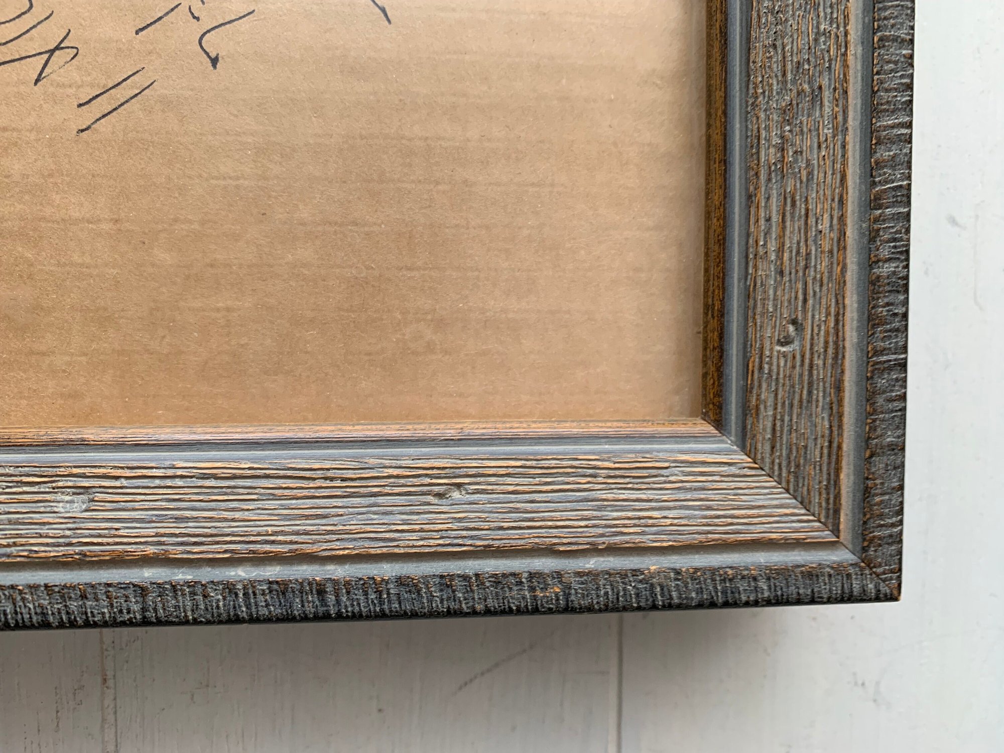 This lightweight frame has great character. The colouring in the frame itself is unique, it appears to be a blend of brown and gray/blue. It is composite not wood, but the effort to copy a wood finish has been achieved. There is glass with the frame. The frame is in good shape as well and no cracks can be found, there are some small chips in the black edging as shown in pictures.