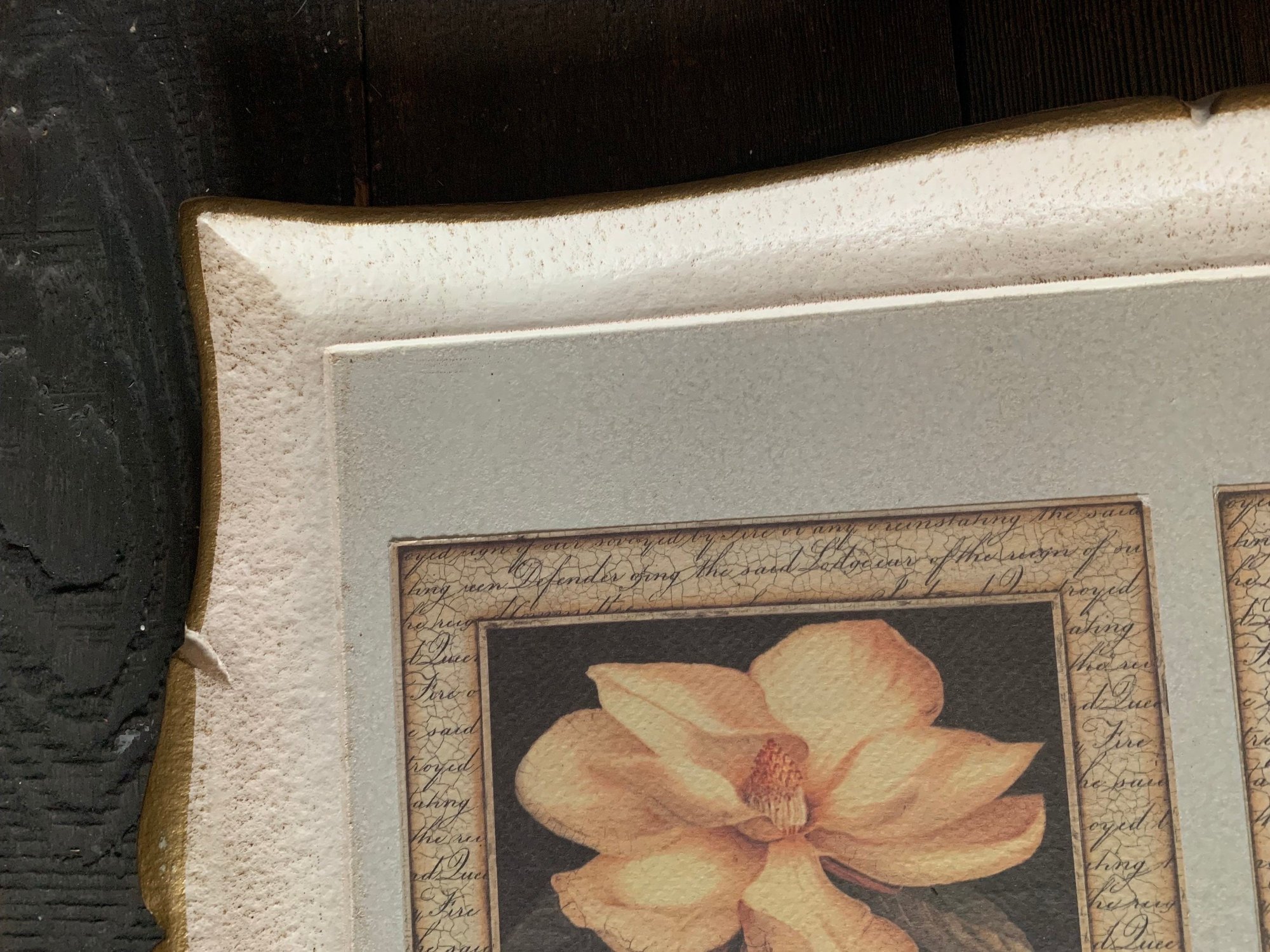 This vintage tray is in great condition, there is one mark on the edging as shown in pictures however it is very small. It stands sturdy on a table top. The decoupage pieces of floral are in very good condition as well. The frame colouring itself is a mix of cream and gold highlights.