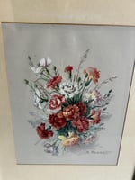 This framed print is in very good vintage condition. The frame is sturdy and original backing still attached for hanging. There is no staining on the mat and no chips or cracks in the wood frame. It is signed.