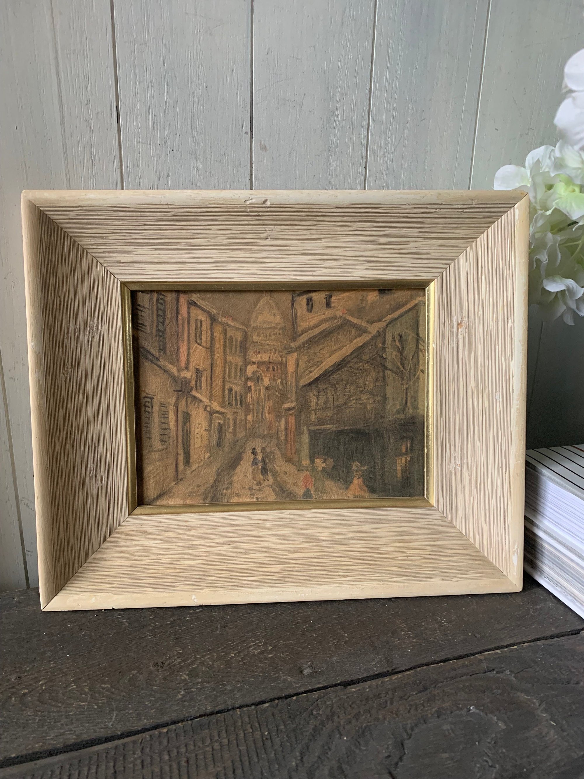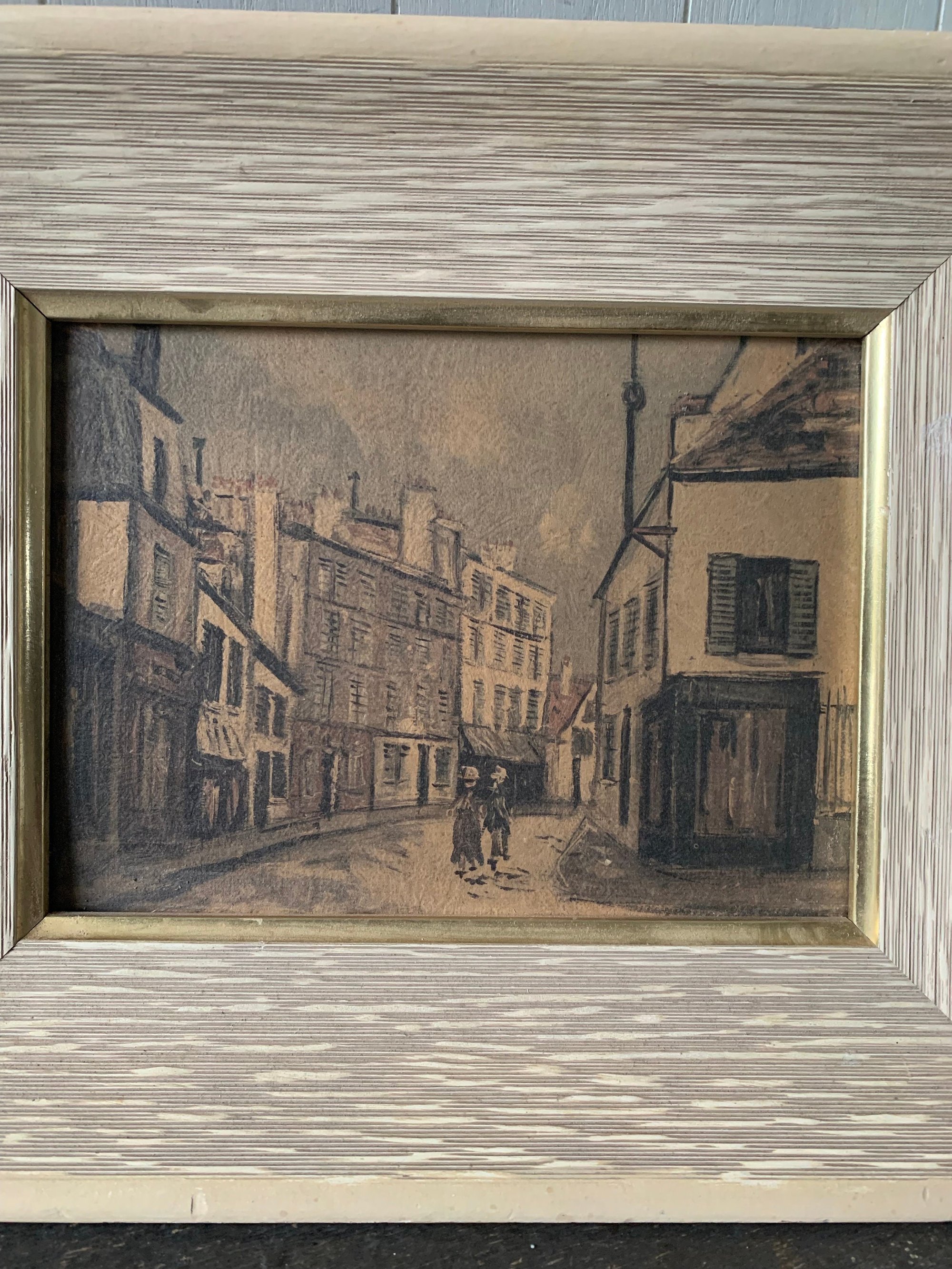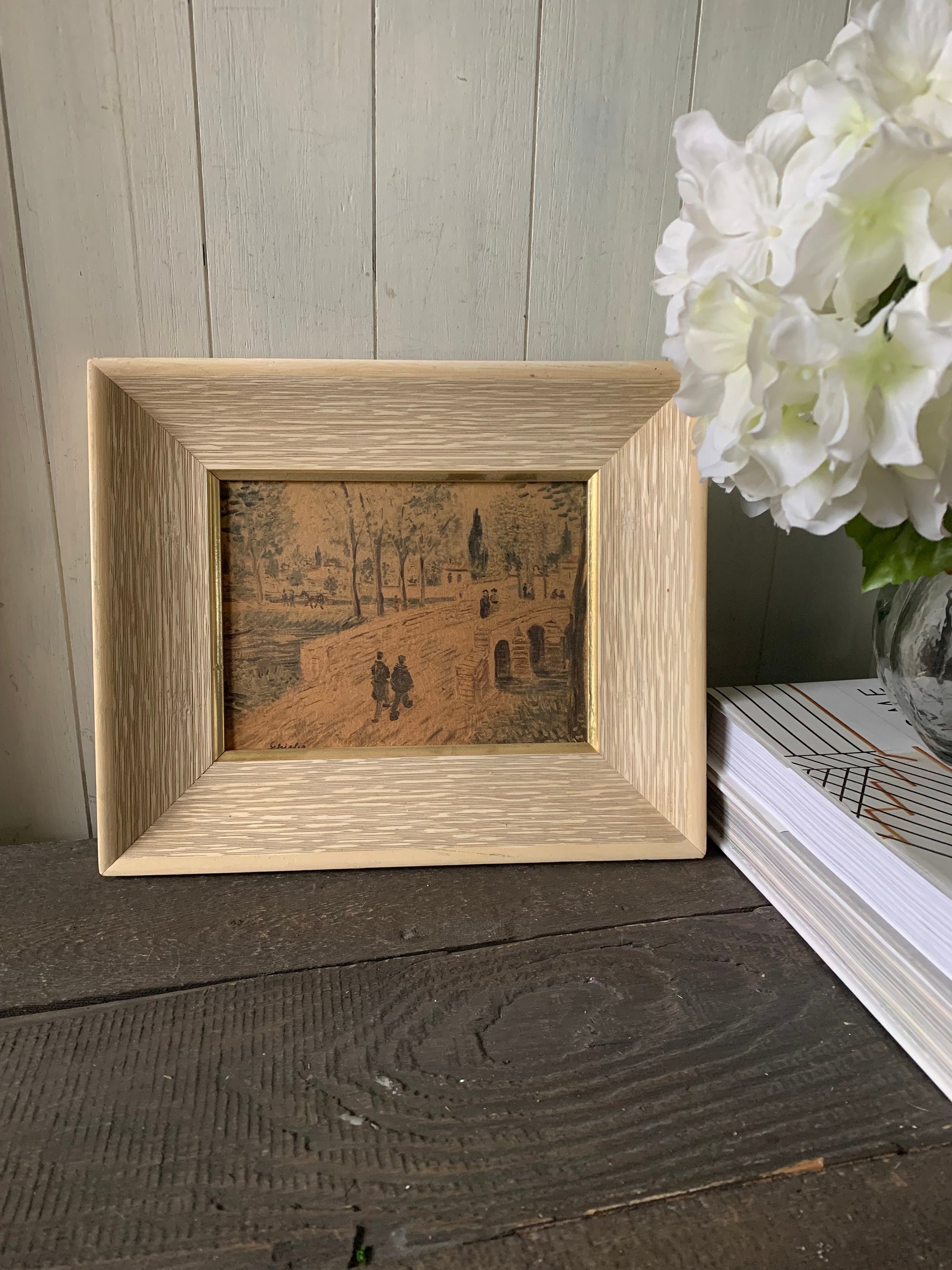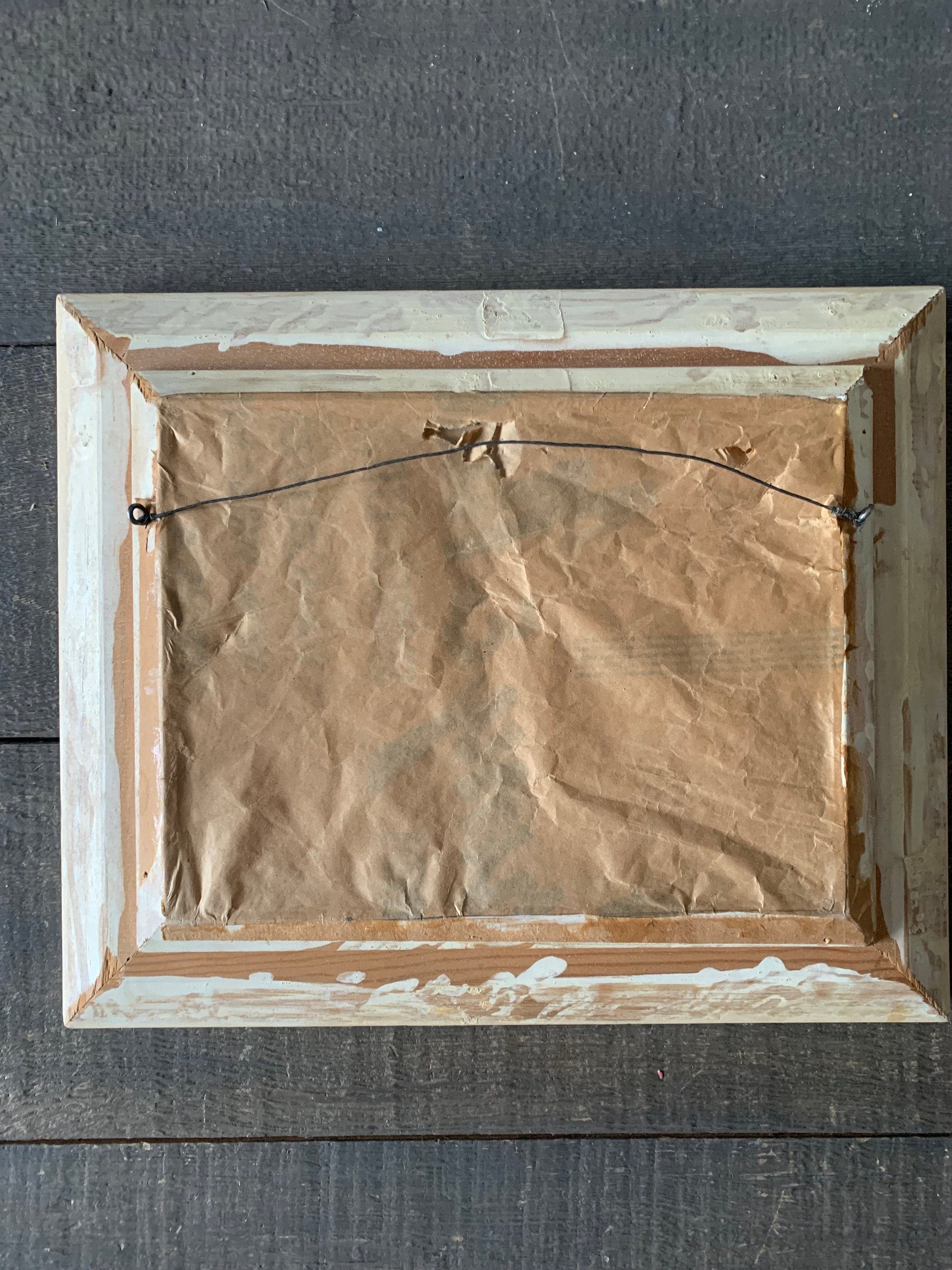 The backings are showing their age on all the pics however they still have the original wire. The color on the frame is between cream and white and there is gold around the edges. There is NO GLASS included. The pictures themselves are all done in darker hues, browns with the occasional colour on an object.