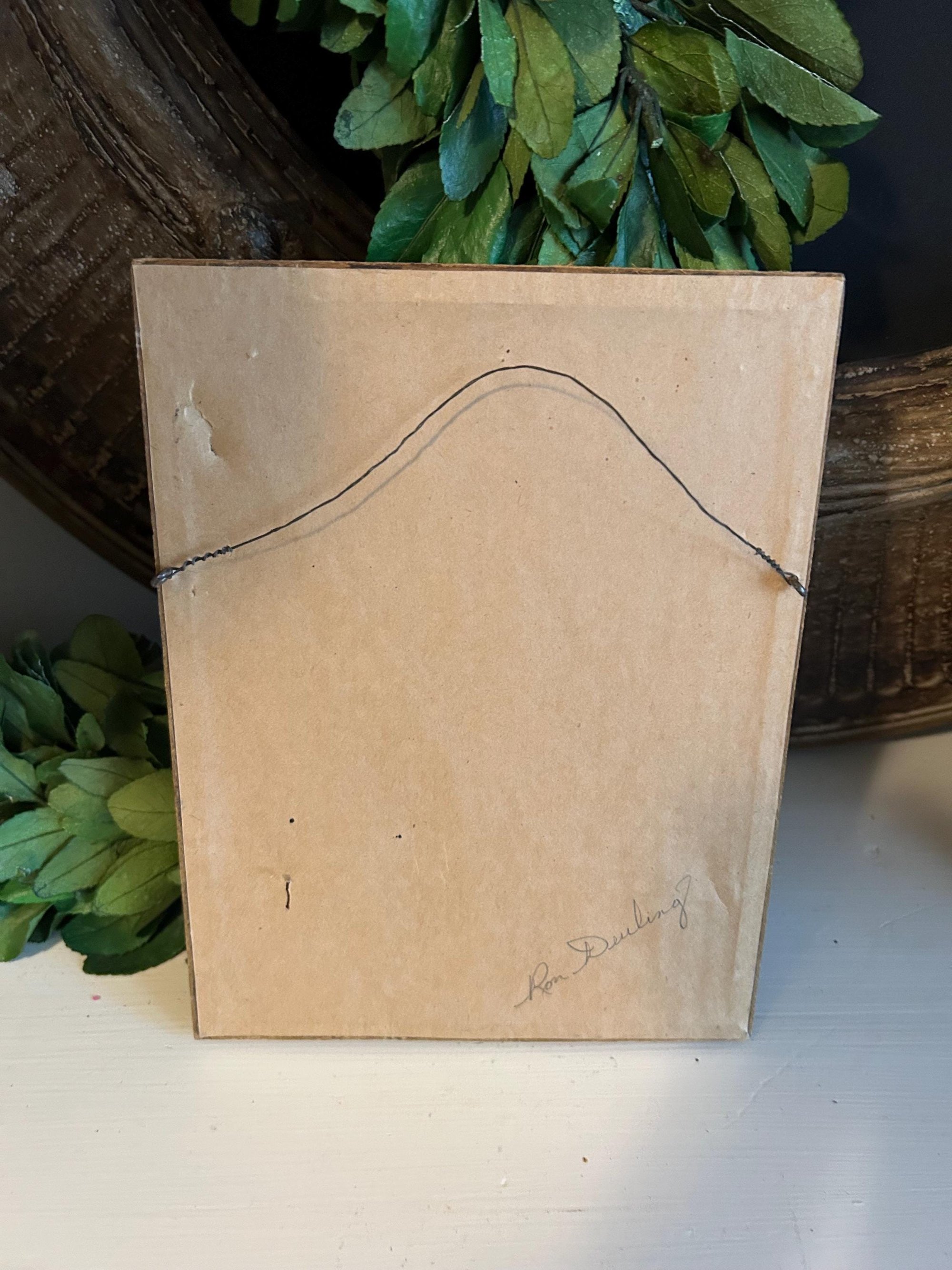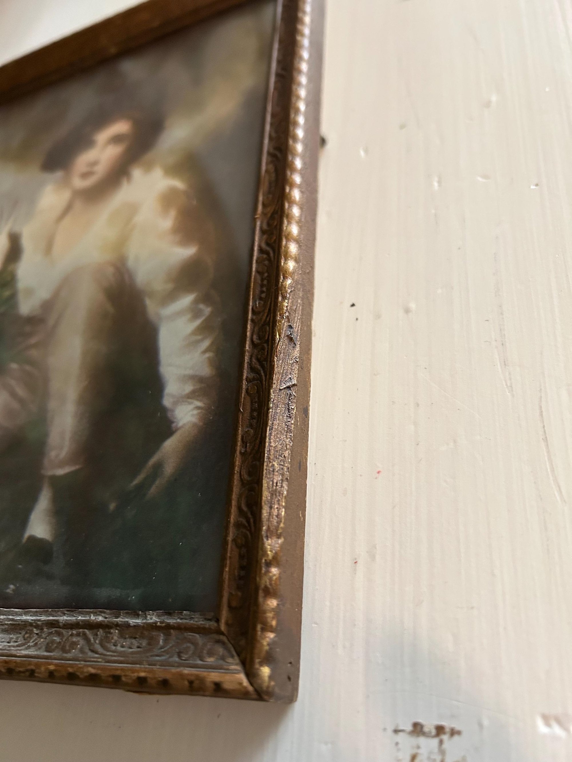 This vintage frame and picture are a great addition to a vintage styled room. The frame is sturdy and strong, the carving on the frame is very pretty. There is one area of damage on the right side of the frame however it has been painted out the same colour as the frame so not very noticeable, this adds to its charm (see pic #8)
