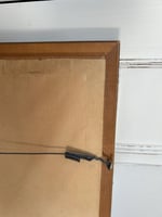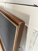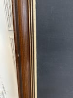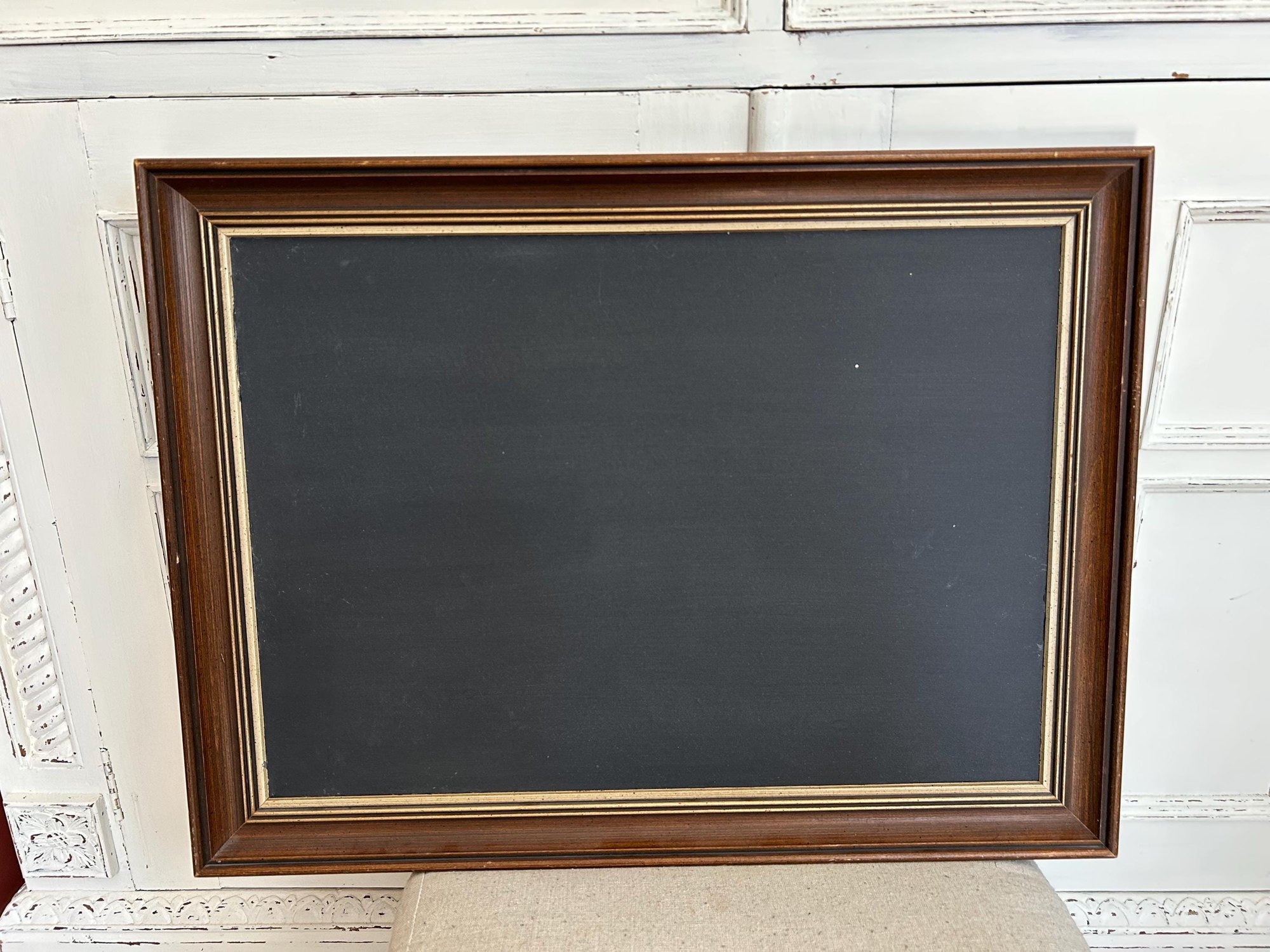 This vintage wood framed chalkboard is in very good condition. The frame is vintage, probably from the 1960s. It originally held an old vintage print. The chalkboard has been added by myself using acrylic paint on the print backing. The original paper backing has been left on and the chalkboard can be hung from its original wire.