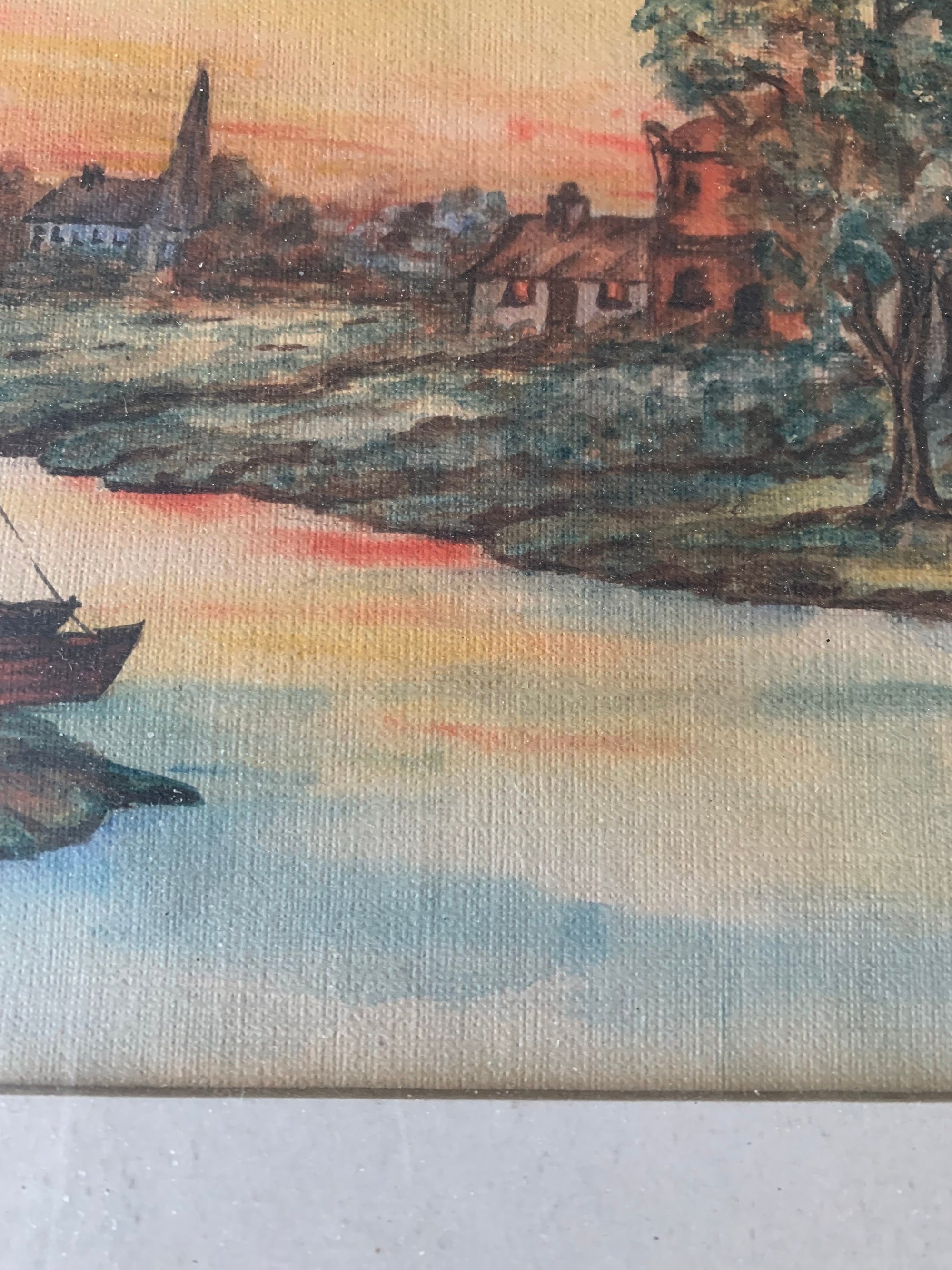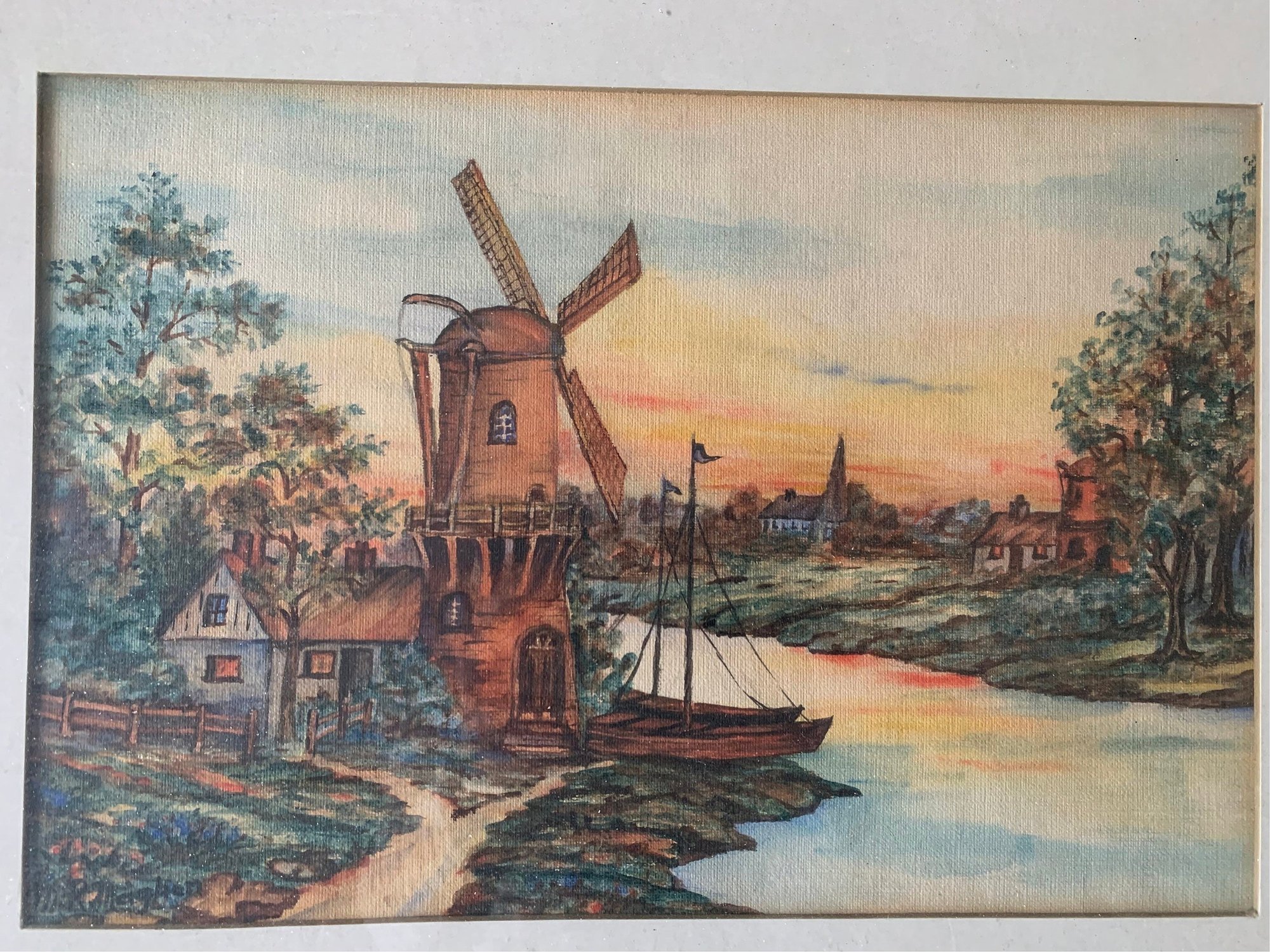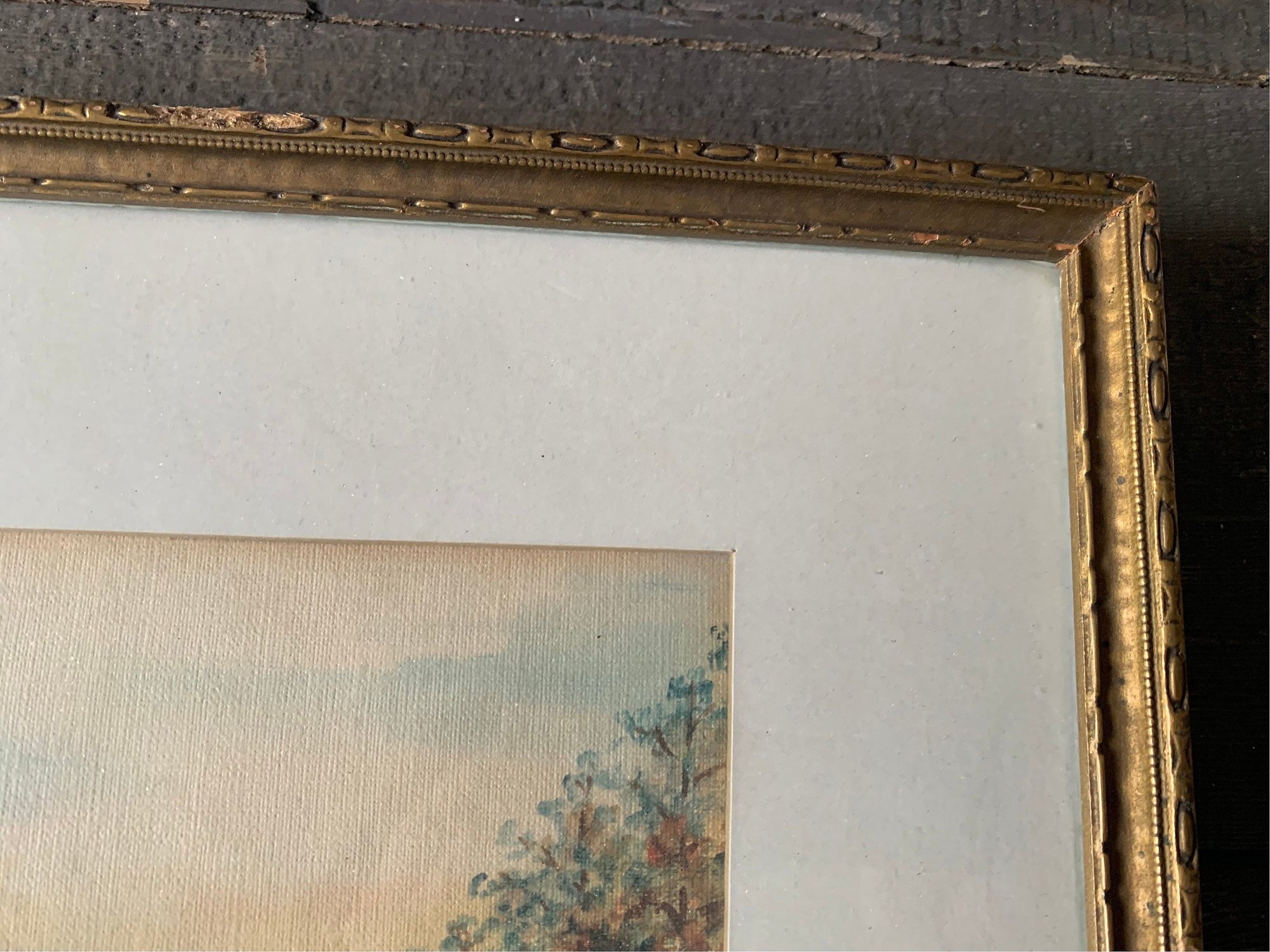 This framed painting is signed by the artist on the back of the picture as well as dated - 1938. The frame and painting are in very good vintage shape. The frame is sturdy and strong. The wood has a lovely old patina. The colouring on the painting is still strong even though this is older.