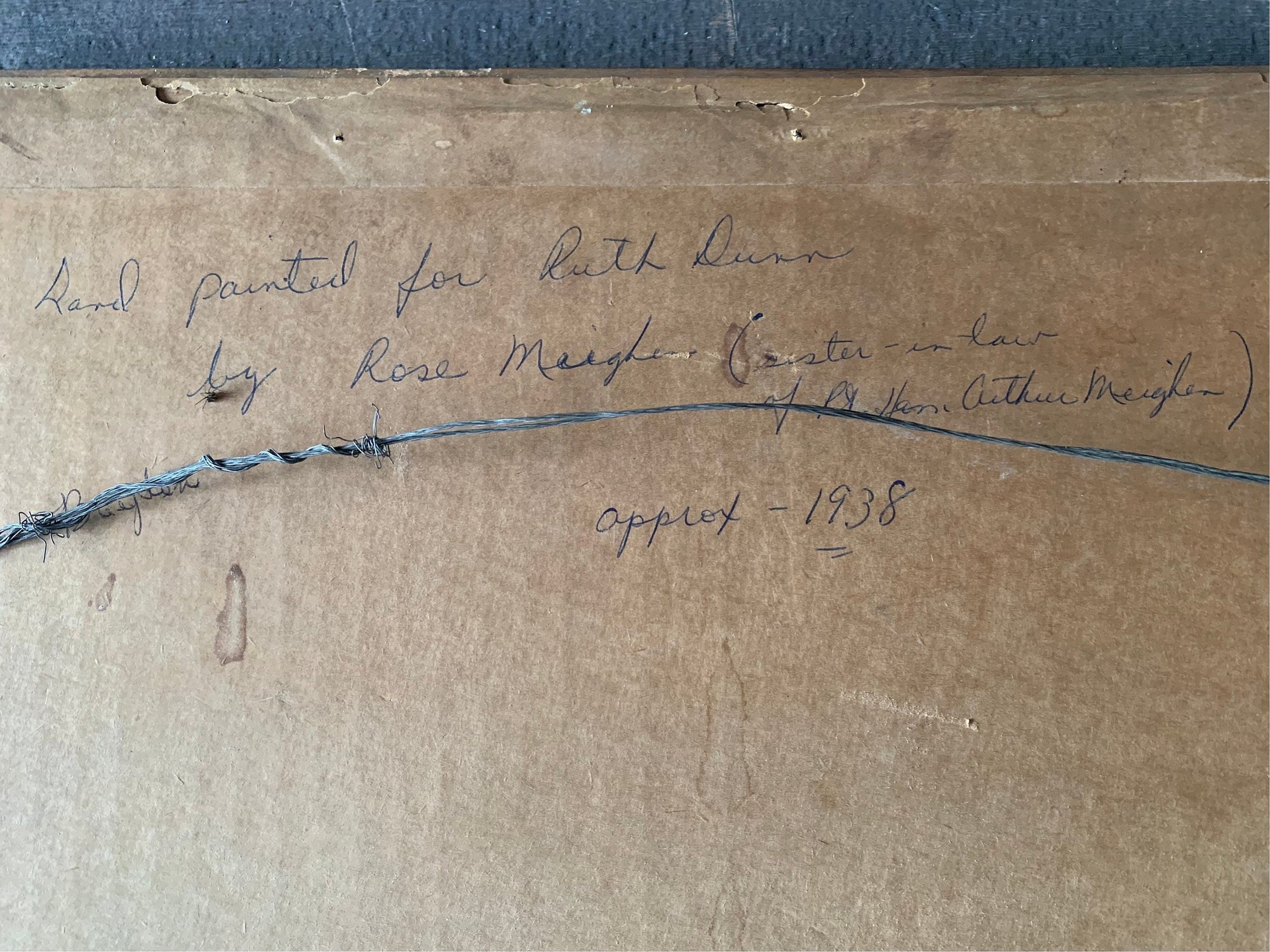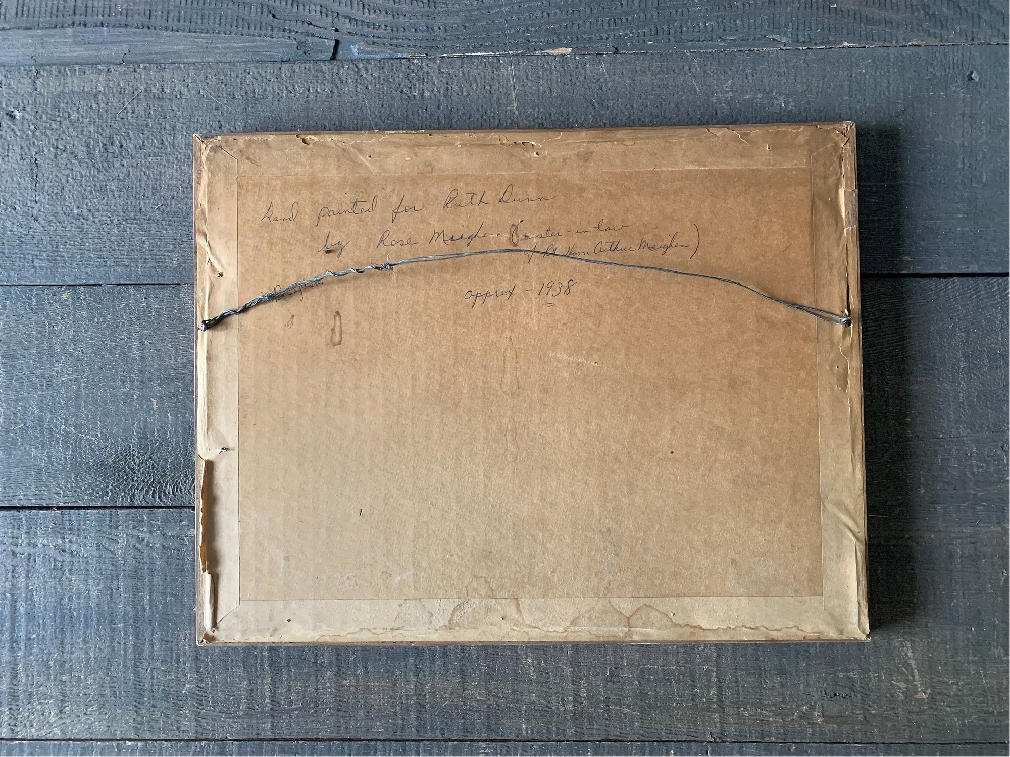 The back shows age in the paper covering and it is all held in by old tape, I have not altered this as my intent is to leave it in its original vintage state as much as possible. The printing on the back states ' Hand Painted for Ruth Dunn by Rose Meighen (sister in law of Rt Hon Arthur Meighen)'. Arthur Meighen was a Canadian Politician and served as MP, 1908-26; leader of the Conservative Party 1920-26, 1941-42; PM, 1920-21, 1926; and senator, 1932-41.
