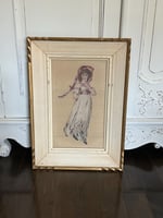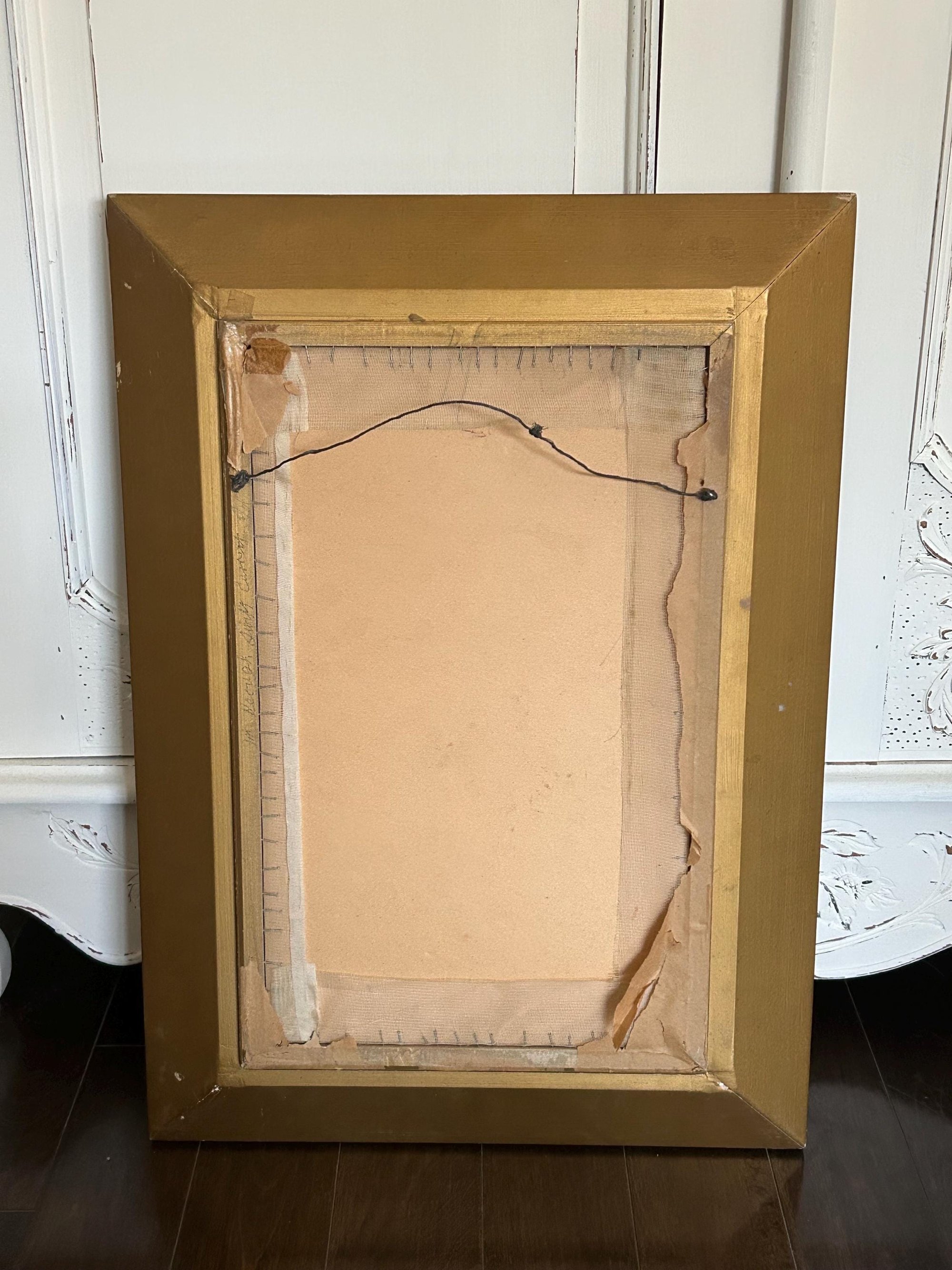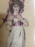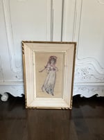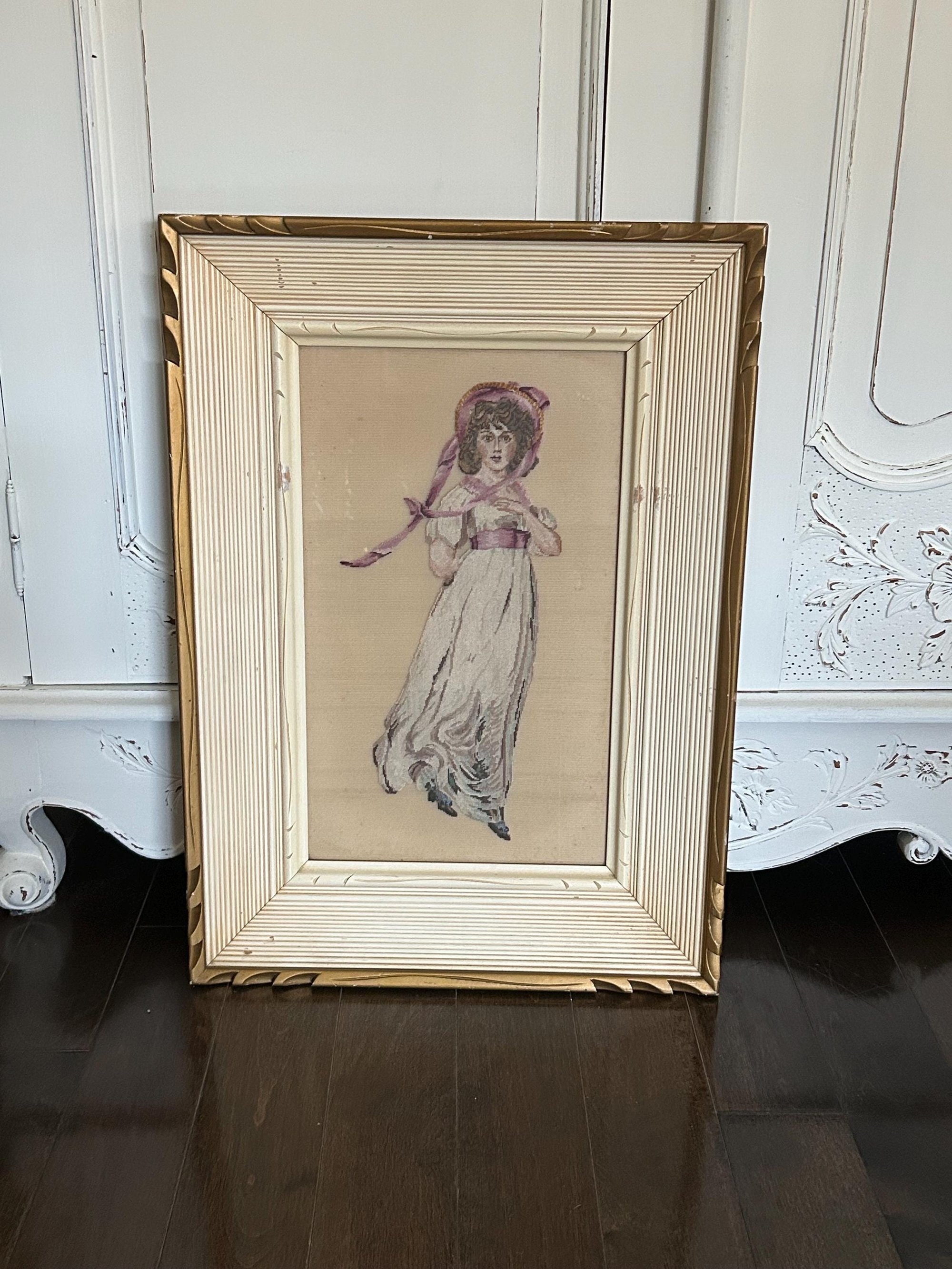 This vintage framed needlepoint / petit point work is in good condition. The frame has some wear and tear due to age, please see all pics. The frame itself is sturdy and strong. Featuring Pinkie (from famed Pinkie and Blue Boy) it still has strong colours of pink and white evident in the embroidery.
