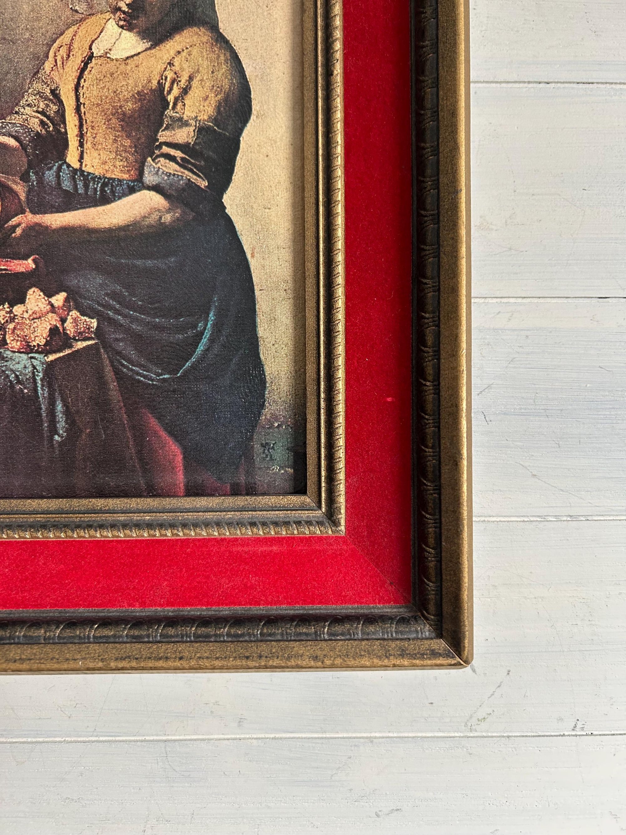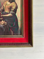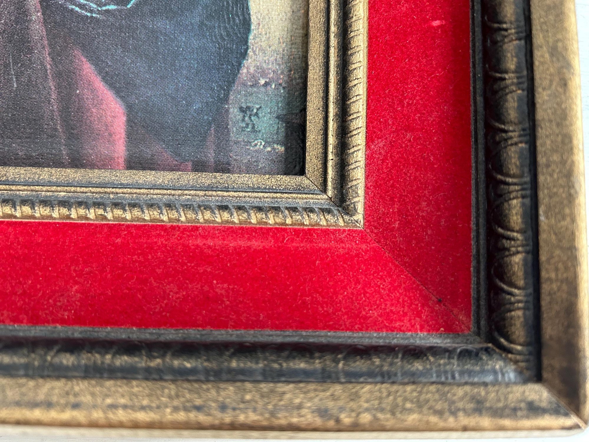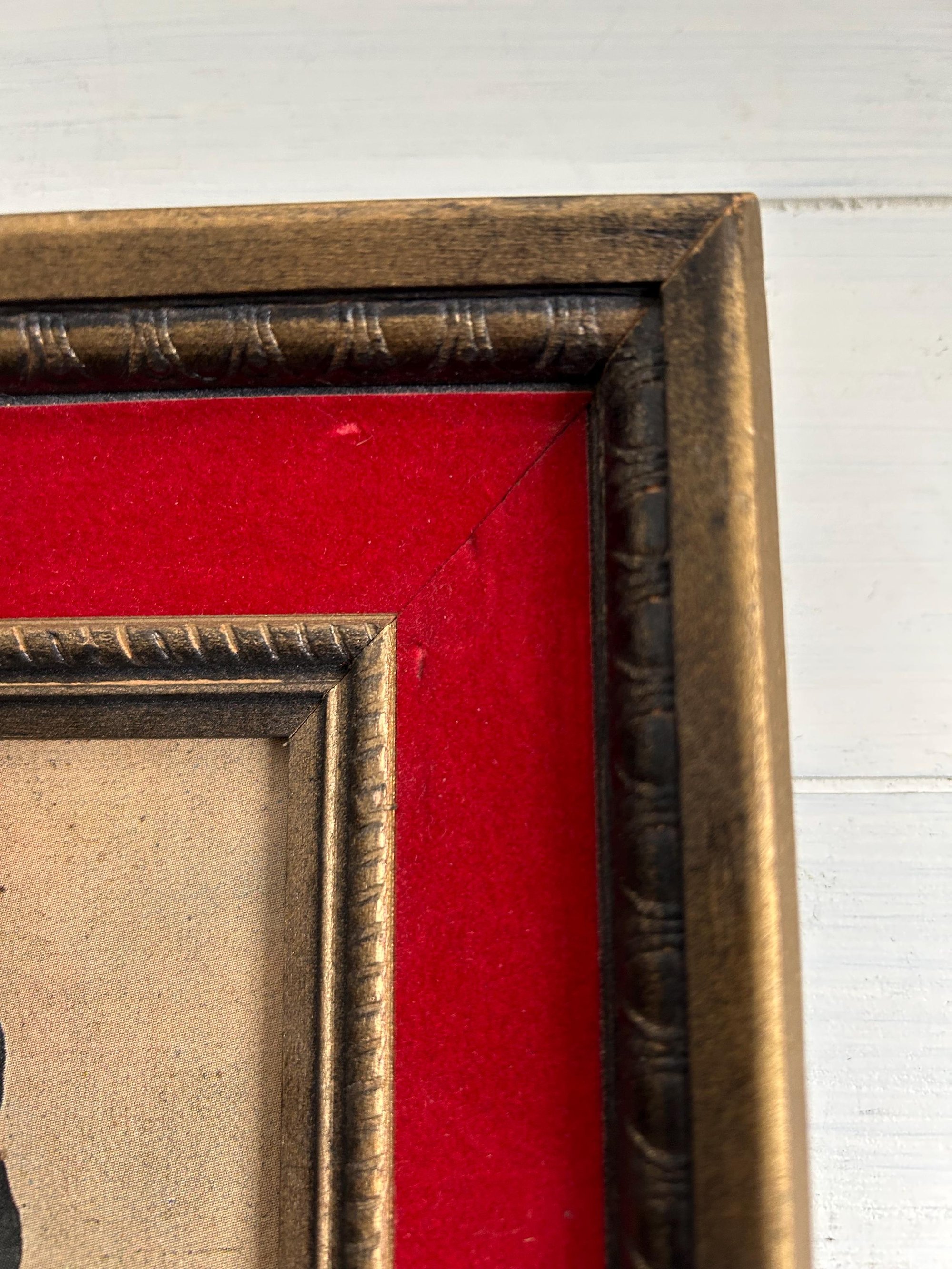 This vintage frame is in good shape, the red portion of the frame is velvet and is in good shape as well. There are a few light spots on the velvet but overall its in good shape. the frame is strong and sturdy and the print inside is a reproduction.