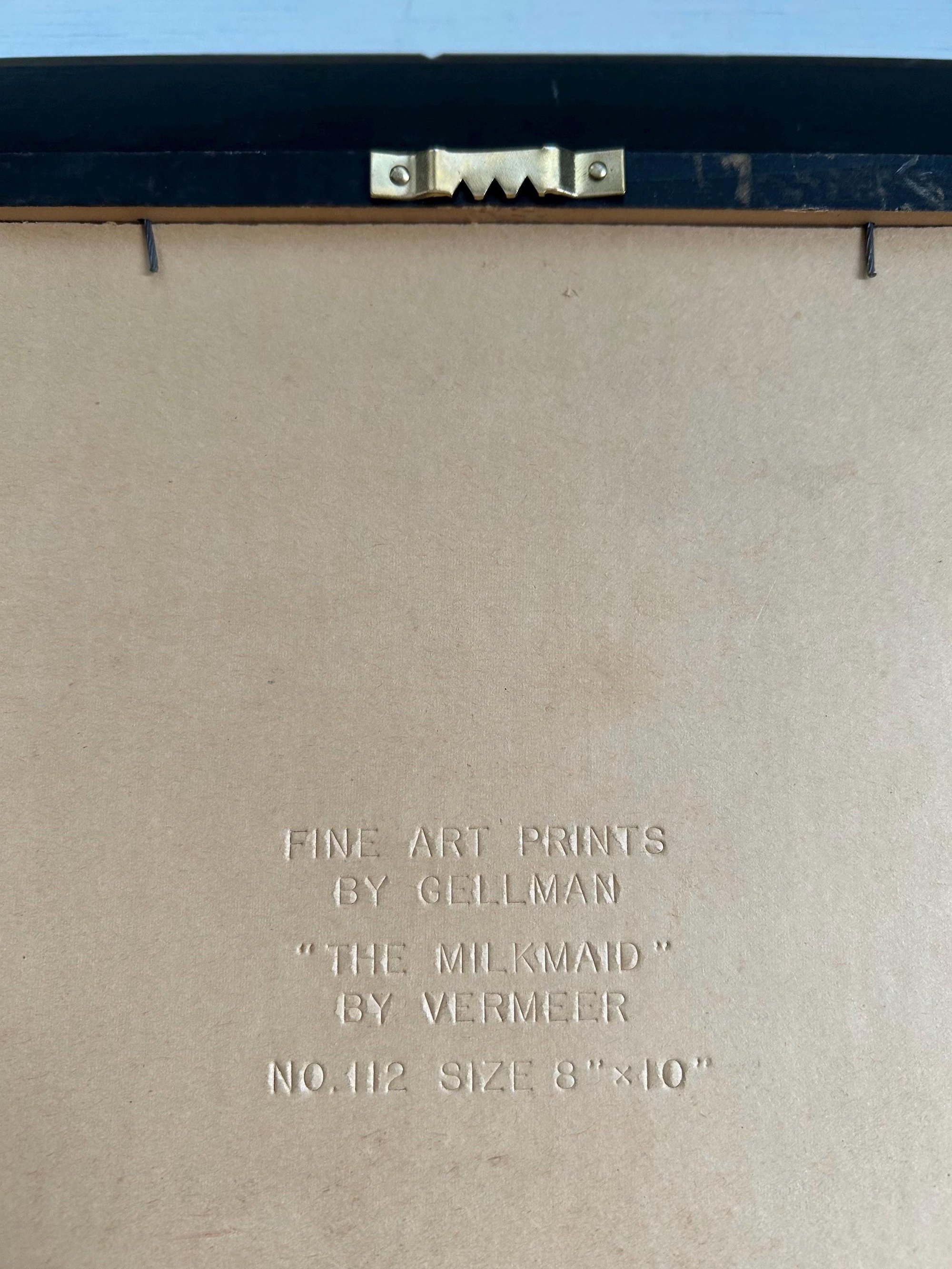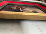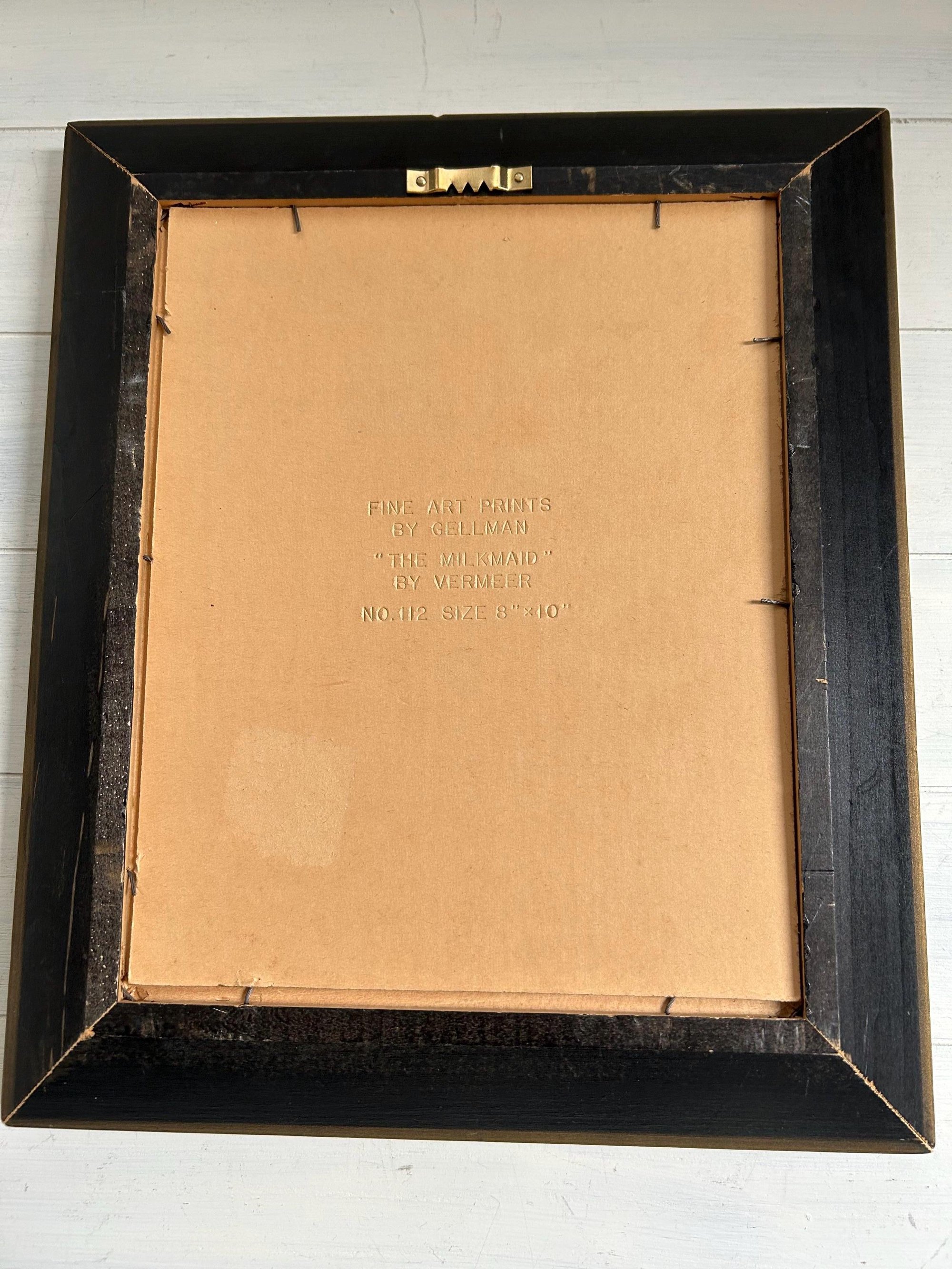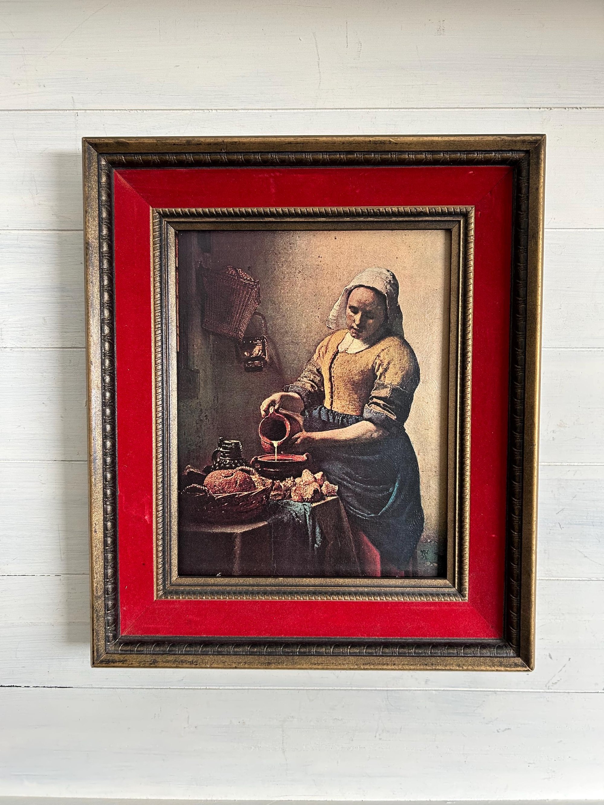 This vintage frame is in good shape, the red portion of the frame is velvet and is in good shape as well. There are a few light spots on the velvet but overall its in good shape. the frame is strong and sturdy and the print inside is a reproduction.