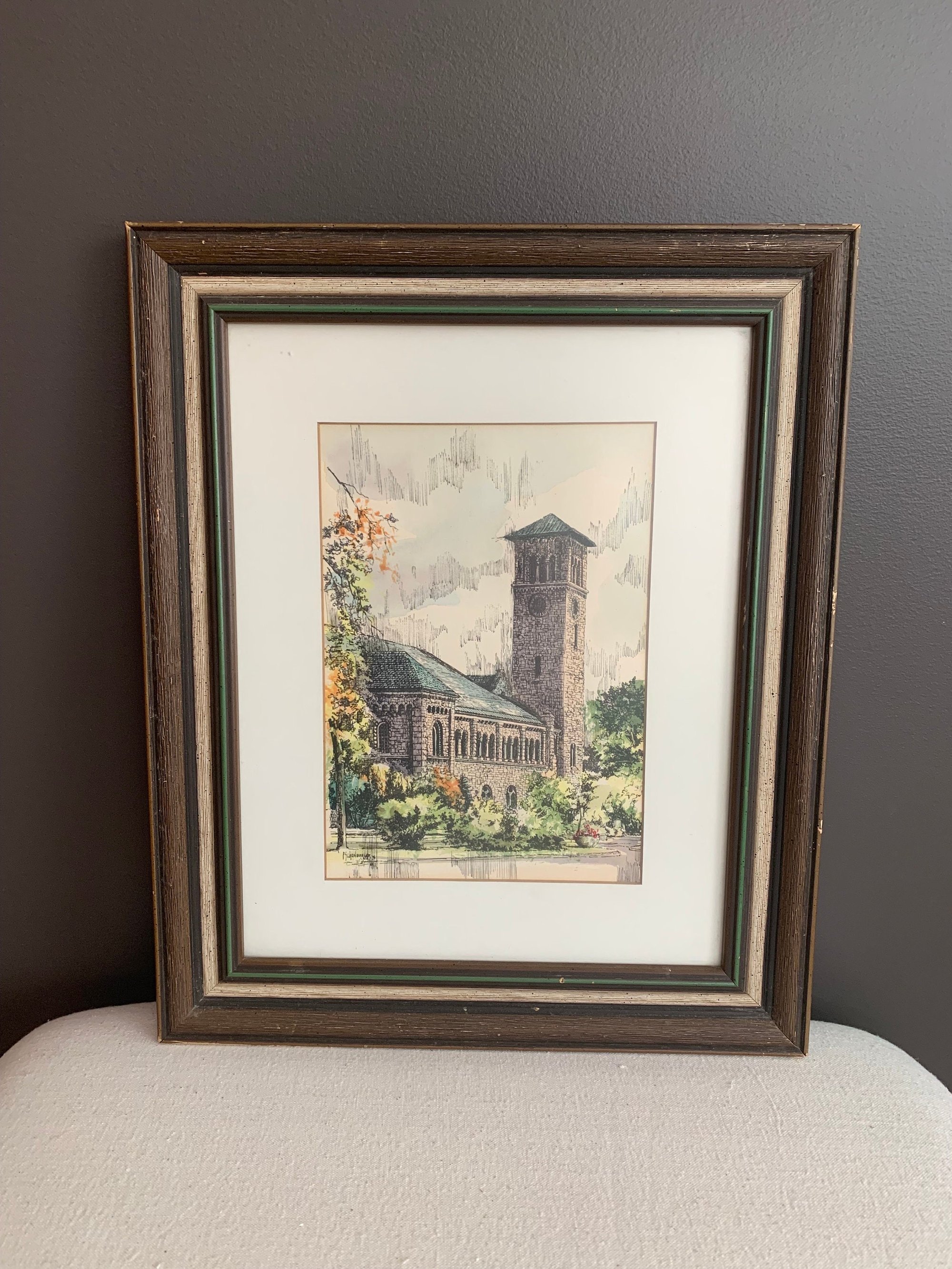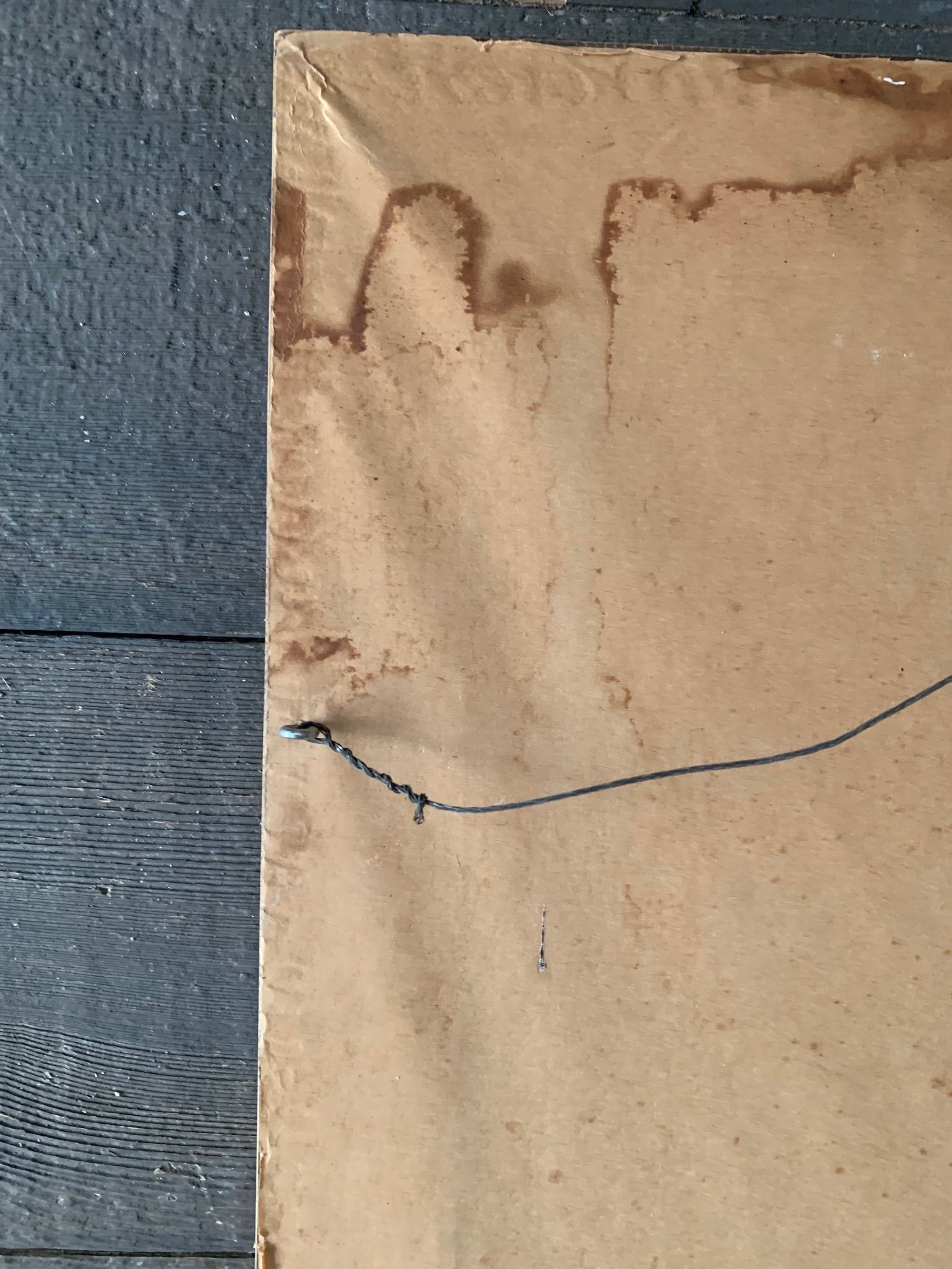 This framed art work is quite unique. This coloured sketch is in excellent condition, the coloring is still vivid. Original backing still attached and wiring for hanging.