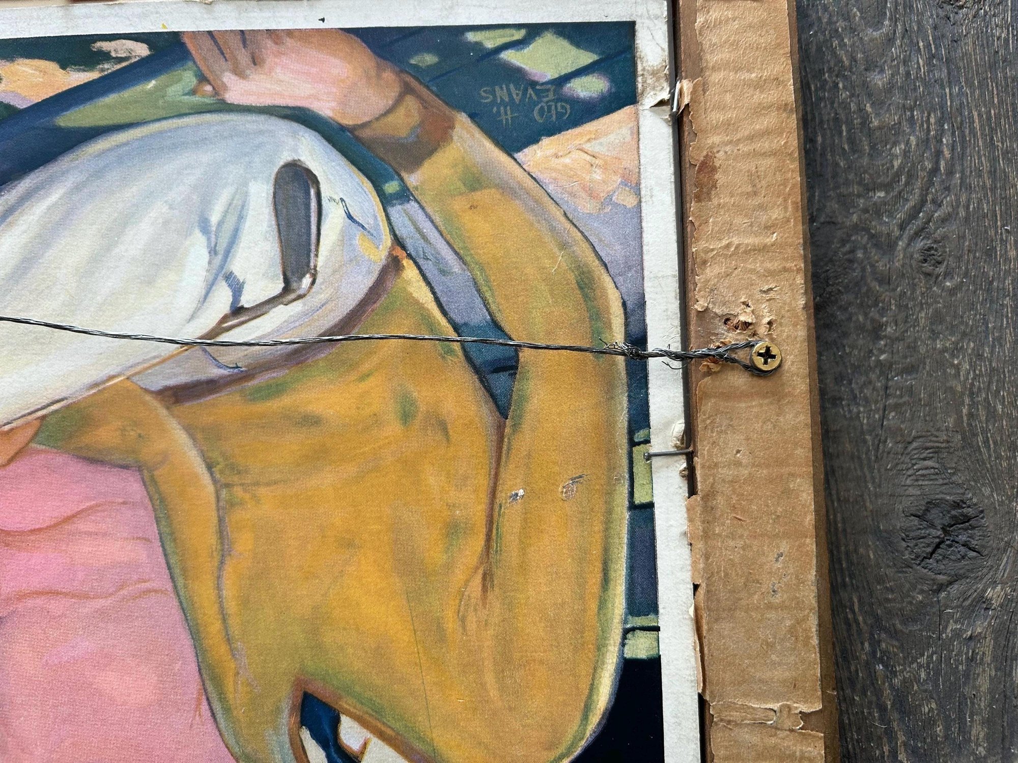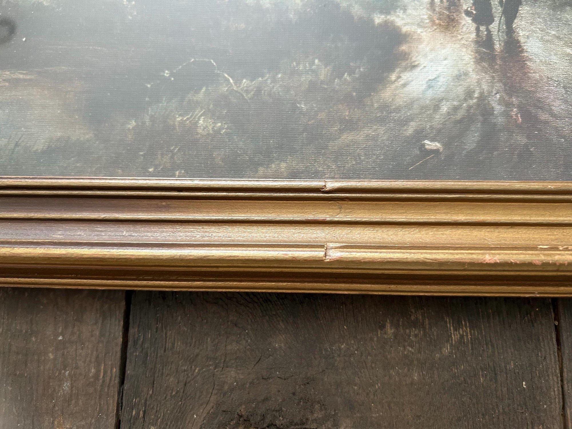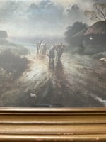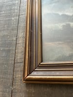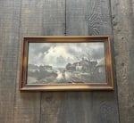 This vintage English print is filled with dark and moody colors. The print depicts a English village on a stormy night with villagers. The print is in good condition. The frame shows some age and has wonderful vintage charm. On the back is a sticker that reads 'Calm after Storm' This is signed in the bottom right corner by J Gozzard