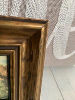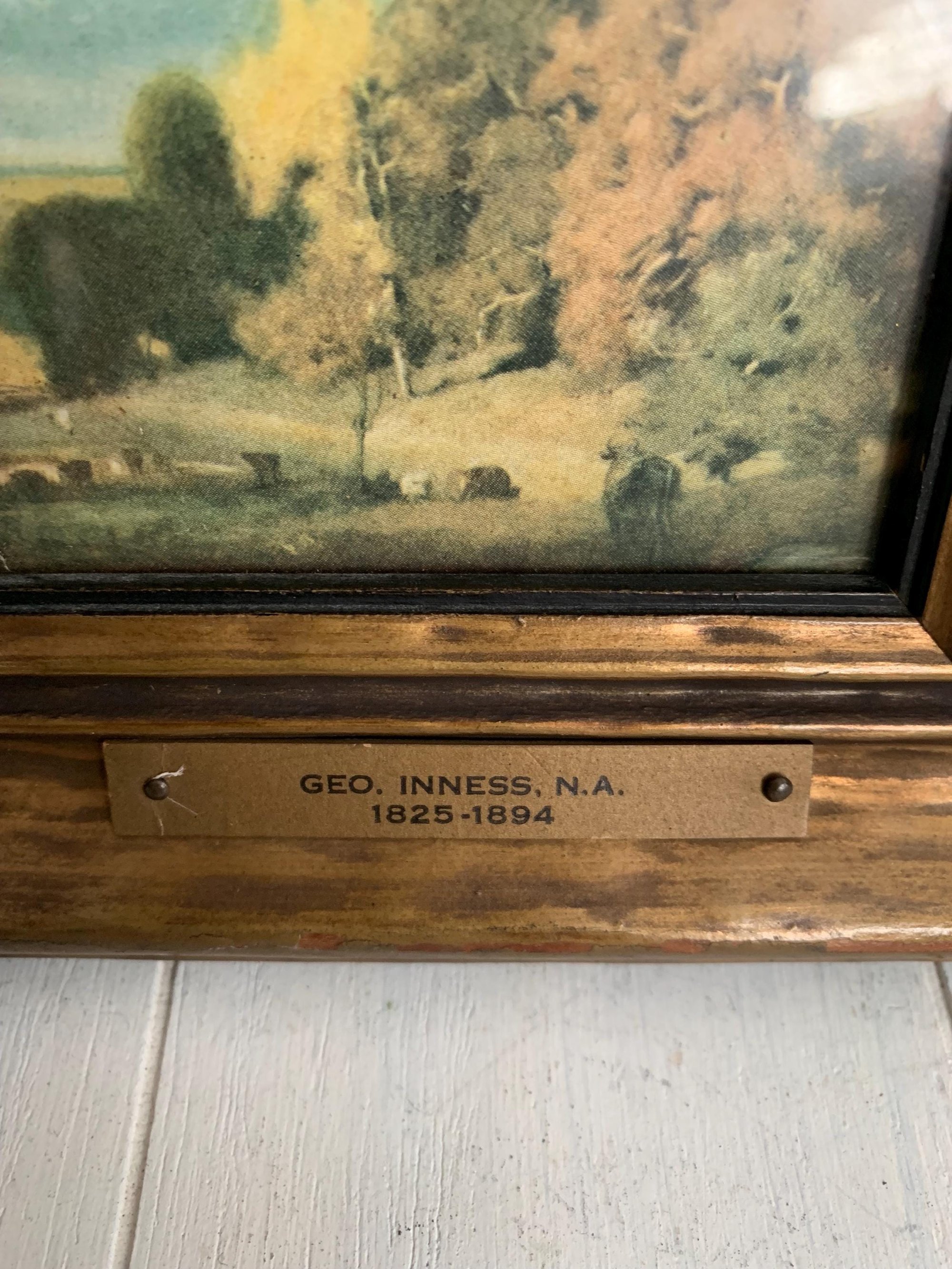 This George Inness (1825-1894) framed print is in good vintage condition. The print is rather faded, however, the frame is sturdy and firm, shows no sign of chipping or cracking, and the original backing is still attached. The Burlington Art Shop sticker indicates this print and frame is from the '80s or '90s.