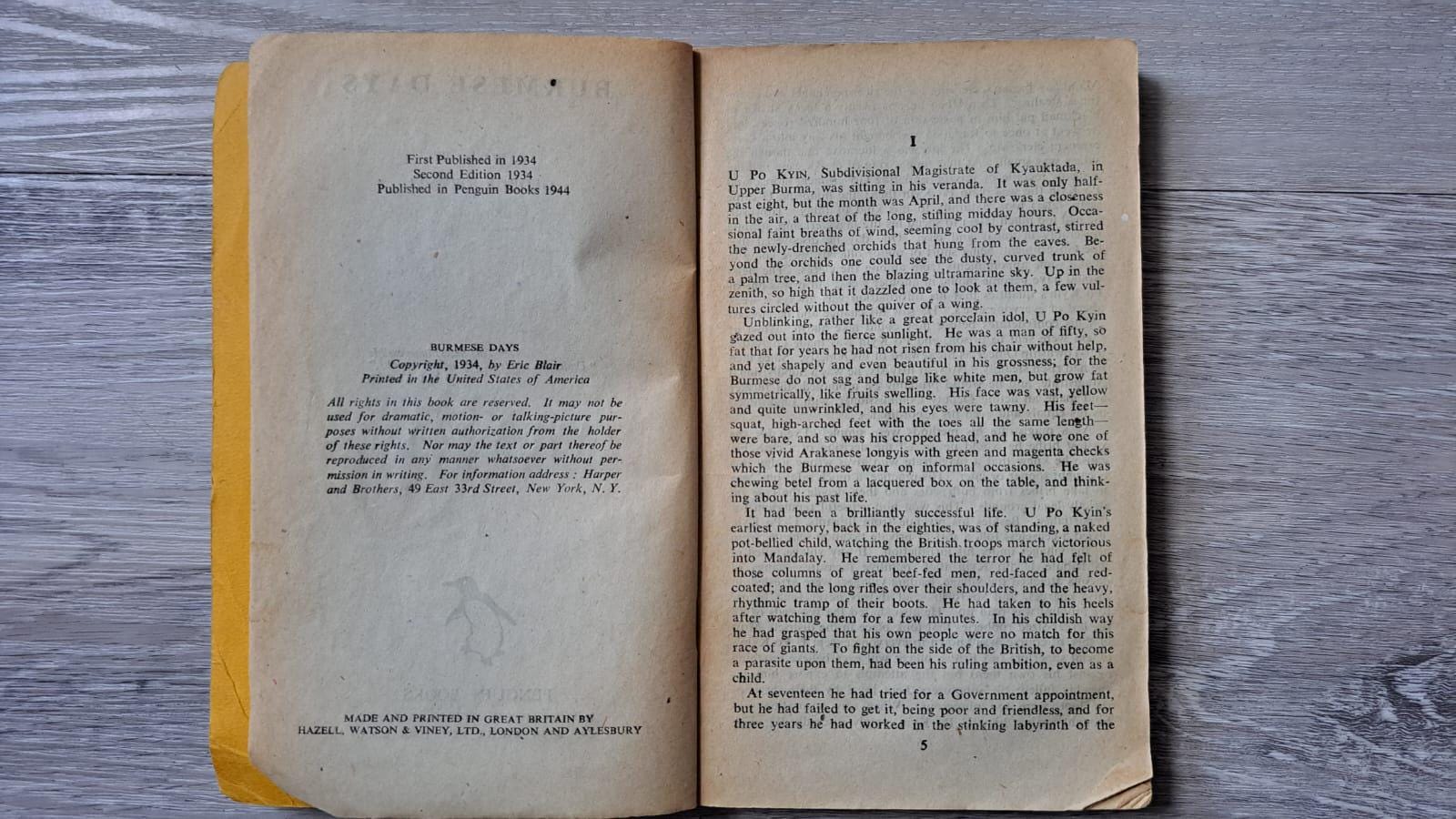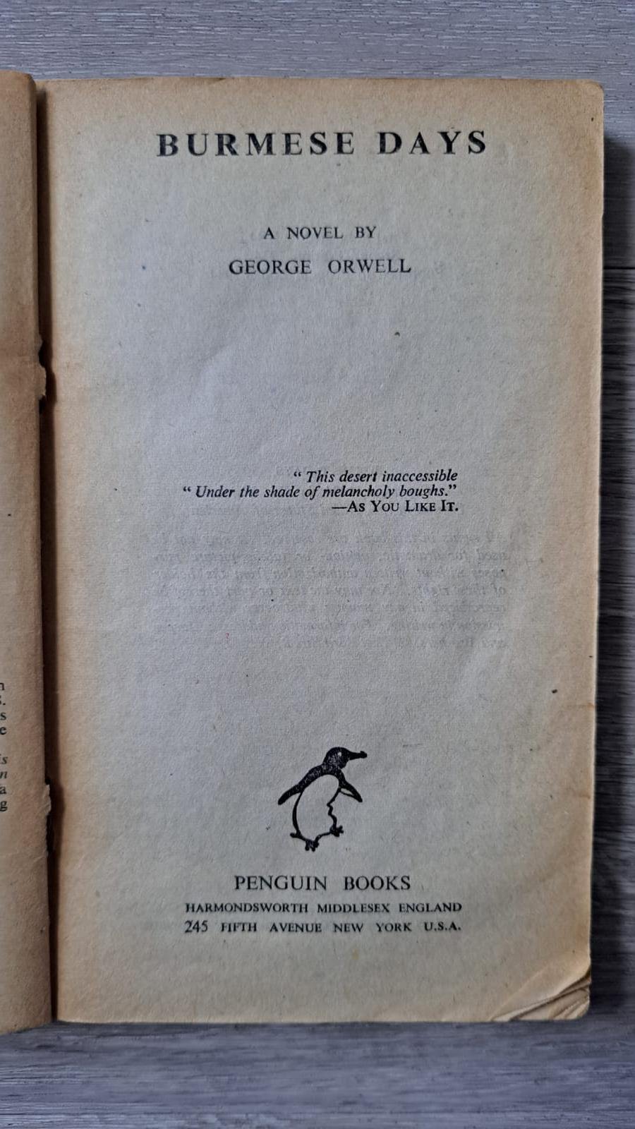This vintage copy of Burmese Days by George Orwell was published in 1944 by Penguin Books.
