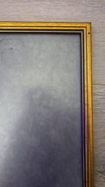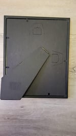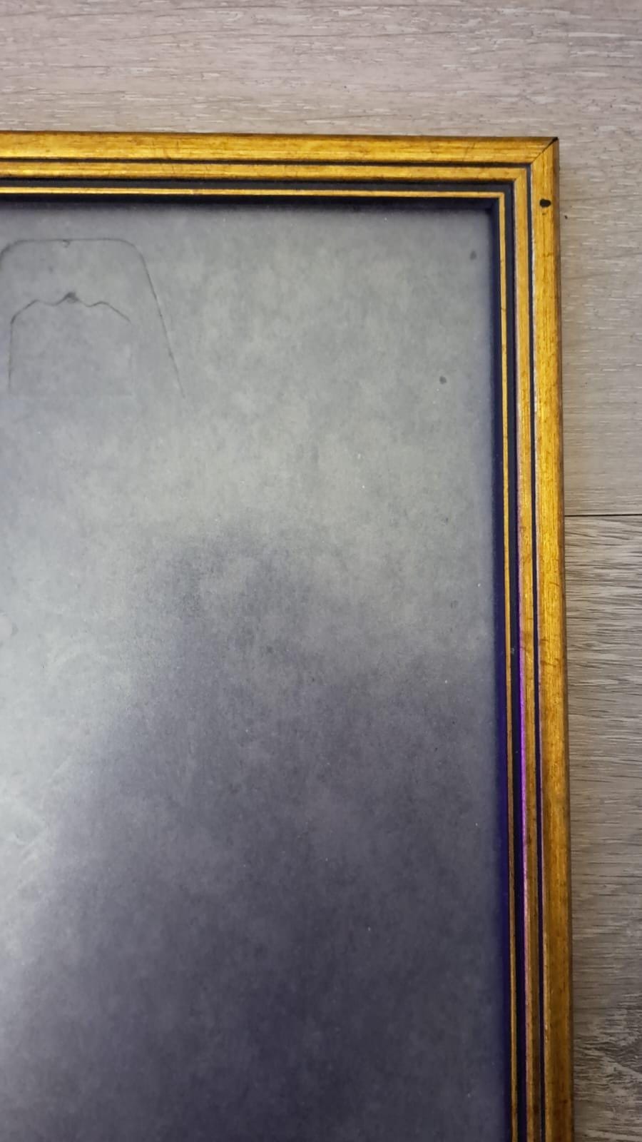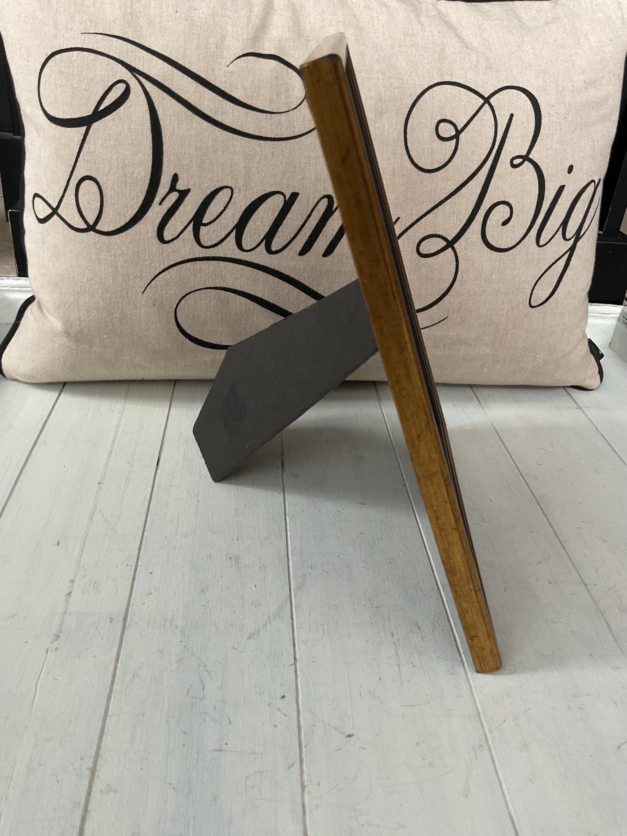 This vintage plastic frame sits steady on a tabletop. The frame is in good condition. The backing is in good condition. The colouring is gold with a black inset.