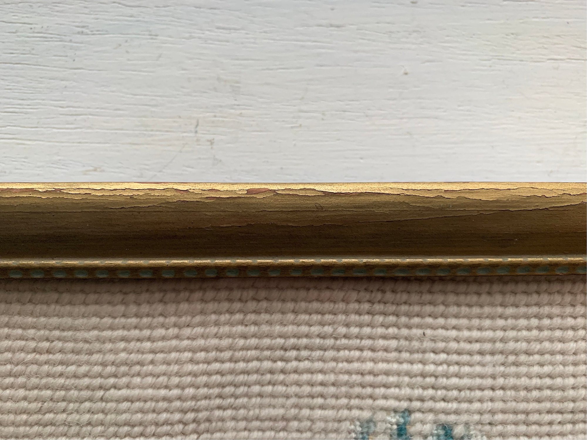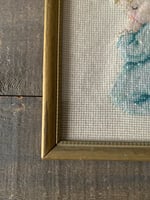 This vintage picture is in very good condition, the wood colouring is gold and and its appearance is slightly distressed as the gold is wearing and showing the wood grain under it. The embroidery is still in good shape and has retained good colour. It does appear to have shifted within the frame causing a small amount of wave underneath the frame (pic #2)