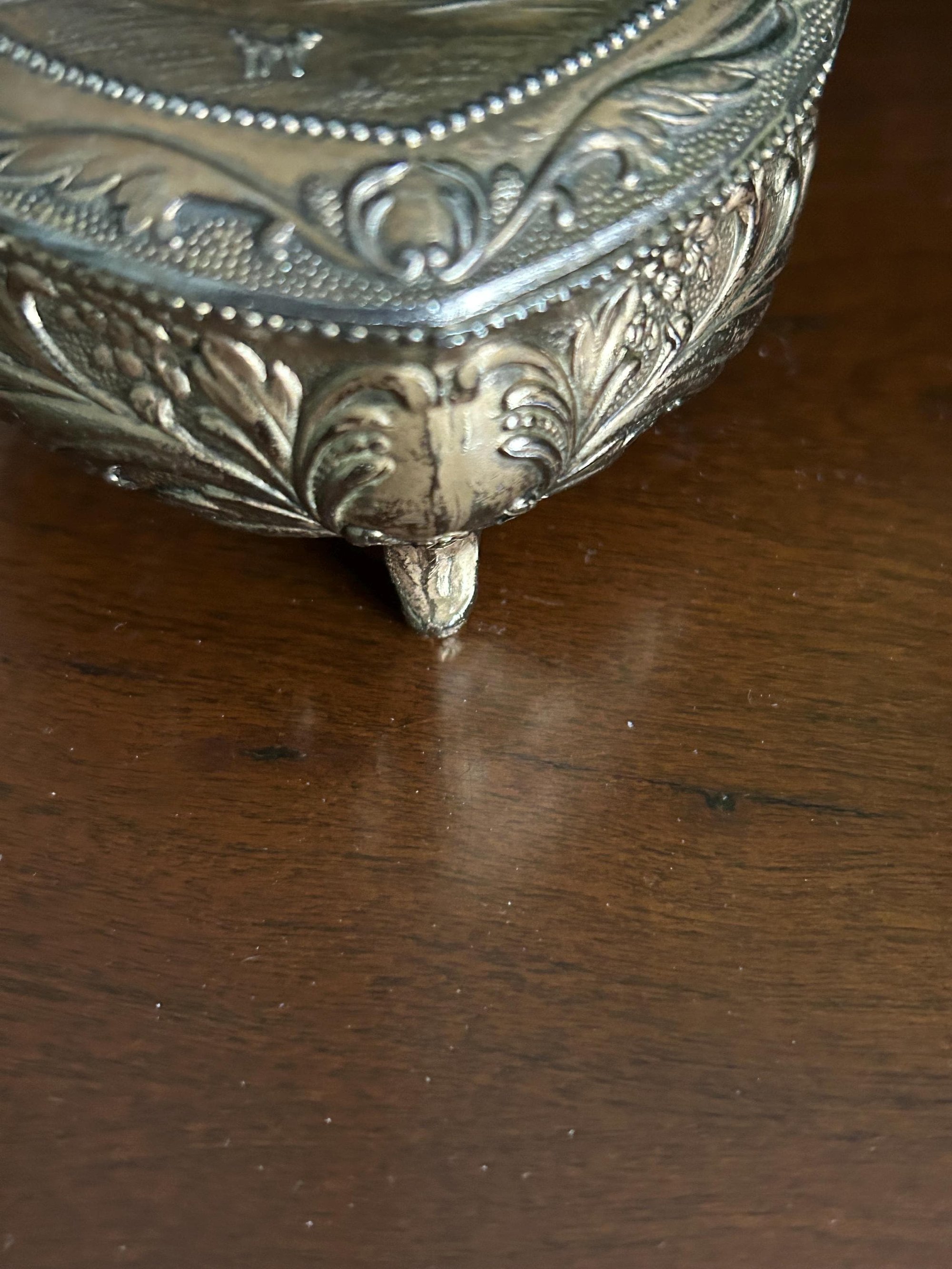 This incredibly detailed jewelry box is in excellent vintage condition. The inside dark red velvet is in great shape, no rips. There is ornate scroll work all over the sides as well as the engraved picture on the top. The underside has the word Japan stamped on it.