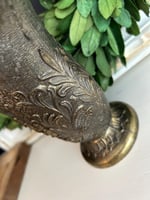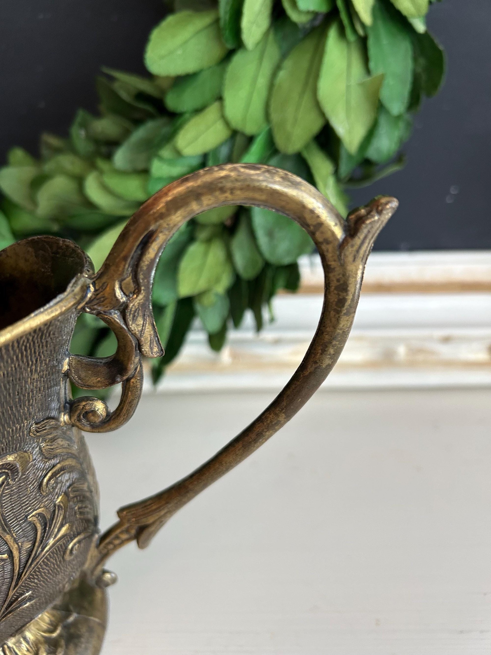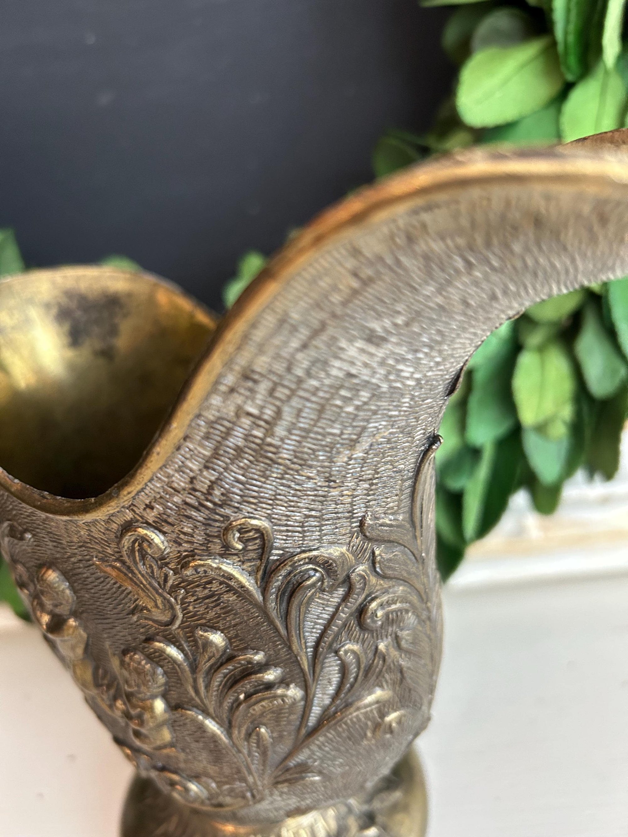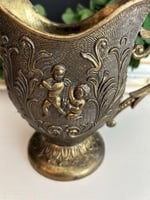 Vintage pitcher with beautiful cherub designs and a nice patina. Made in Italy. No dents or scratches. It is stable on a table top. It is on the heavier side.