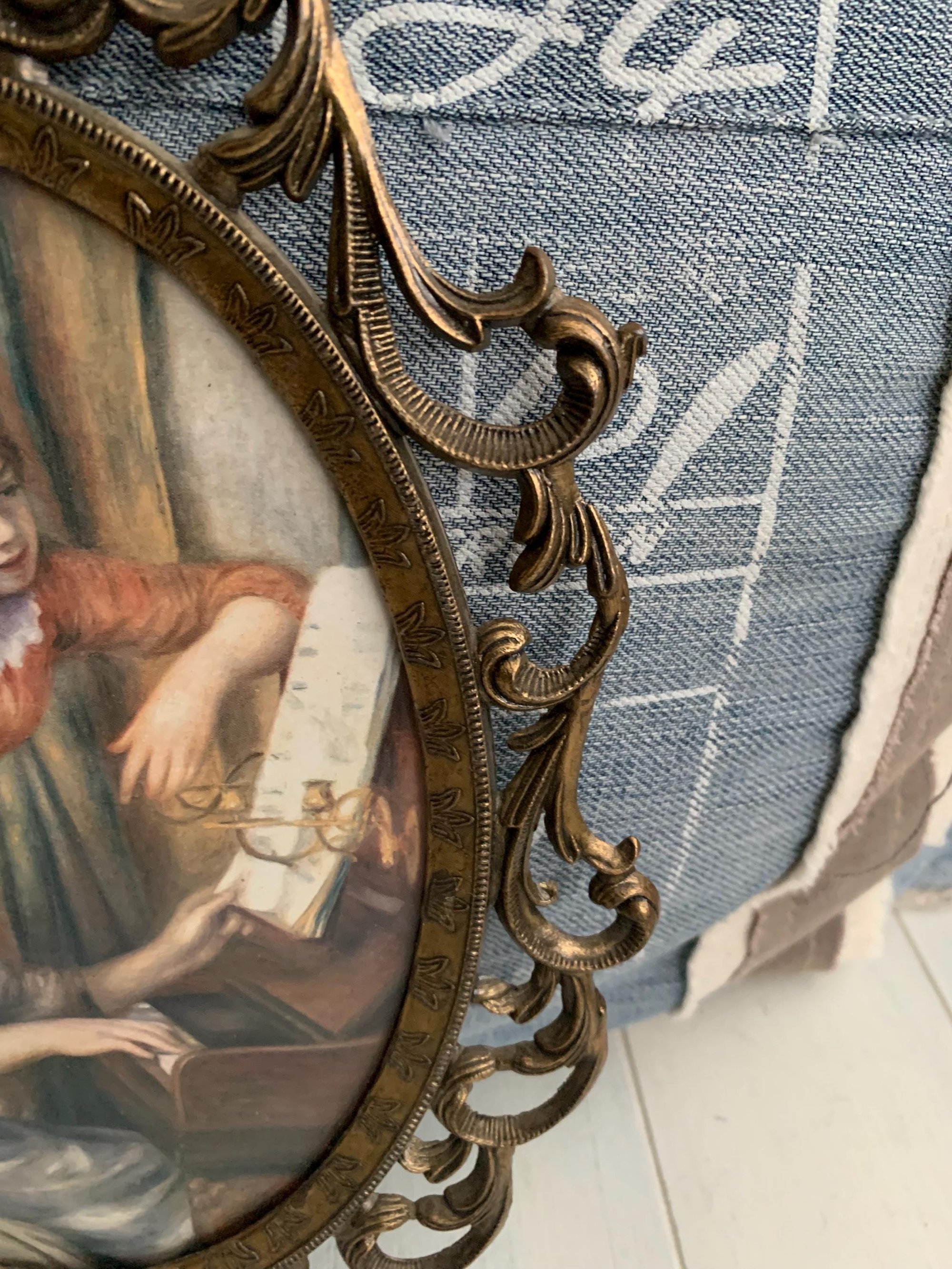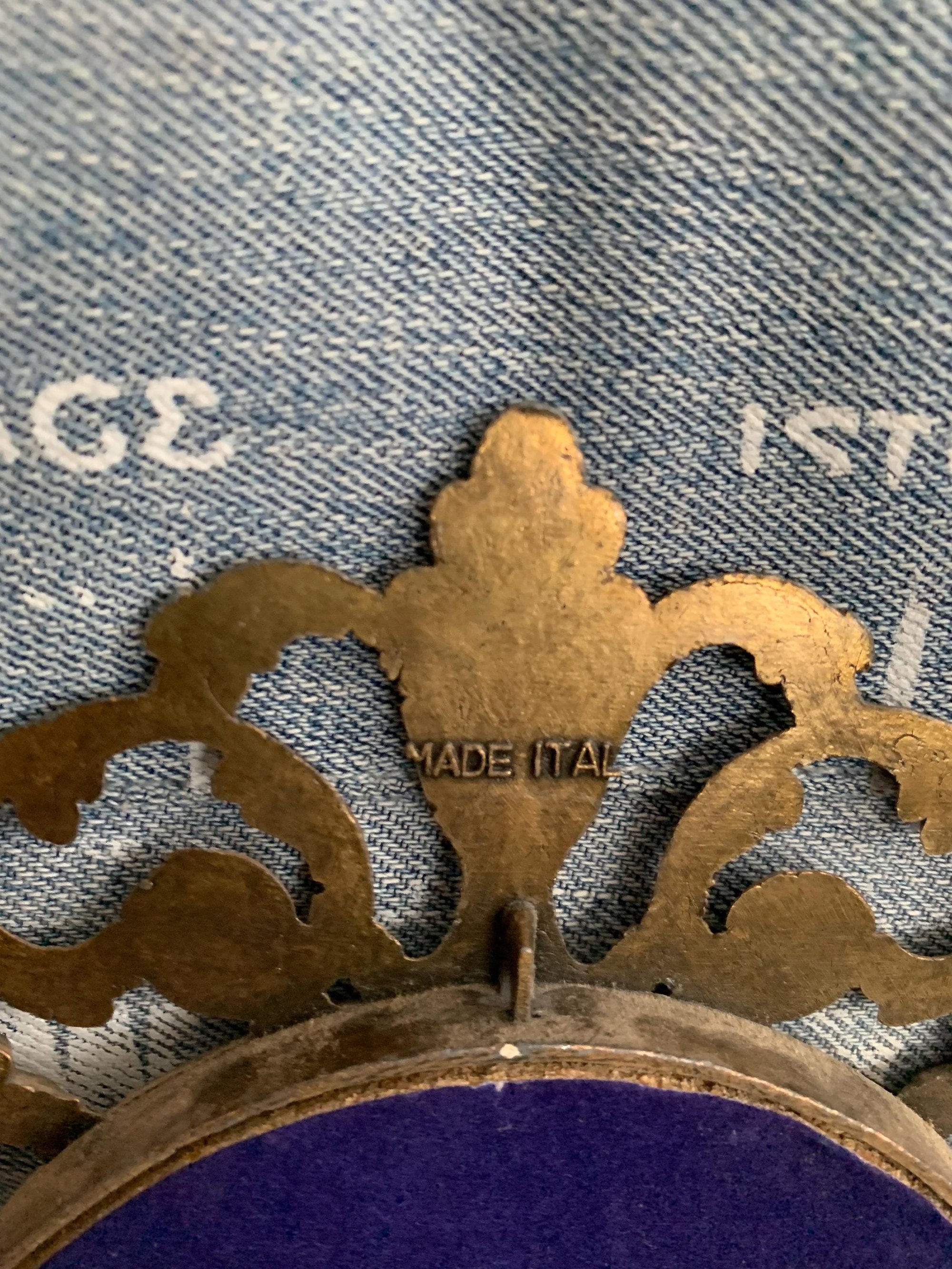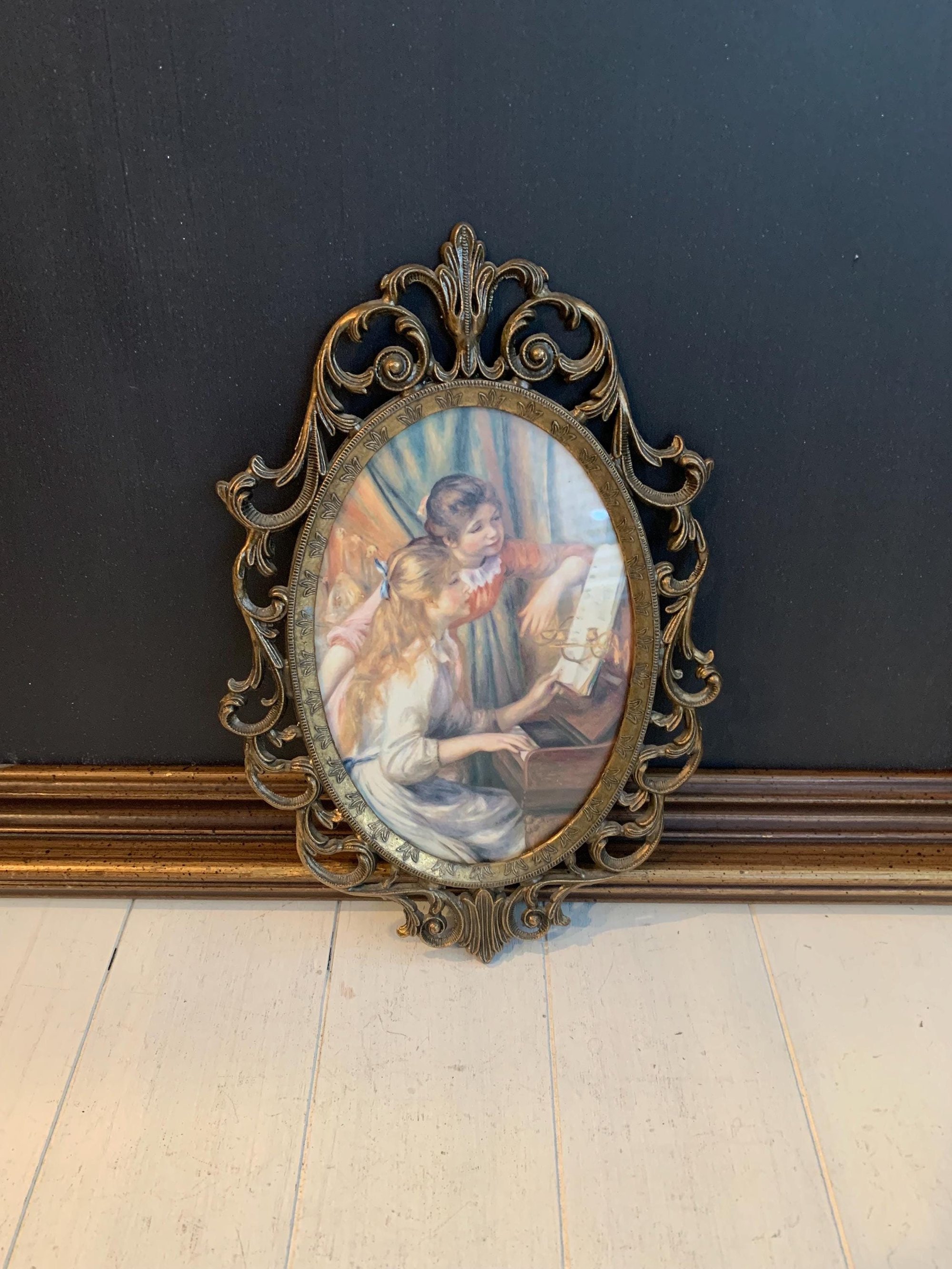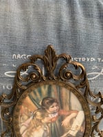 This ornate metal frames with a vintage picture is made in Italy is in very good vintage condition. The colouring on the picture is still strong, no fading. This vintage brass decorative picture frame will compliment any Victorian, Shabby Chic and Antique decor.