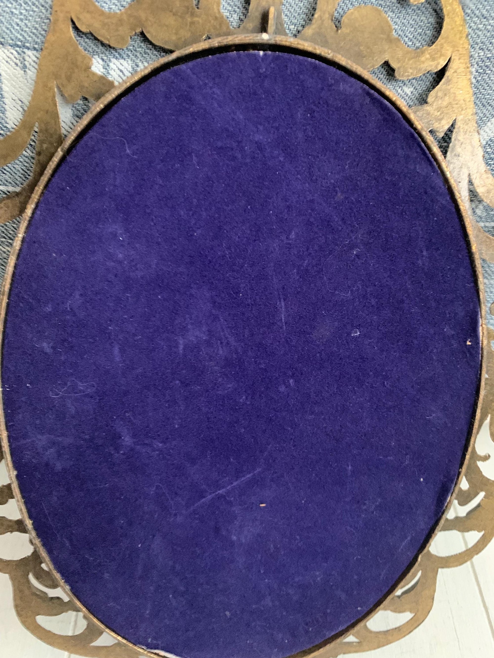 There is glass. The frame is in excellent condition. The metal has a dark bronze colouring to it. The frame has a hook that appears to be glued onto the blue velvet back to hang. It is stamped made in Italy on the back.