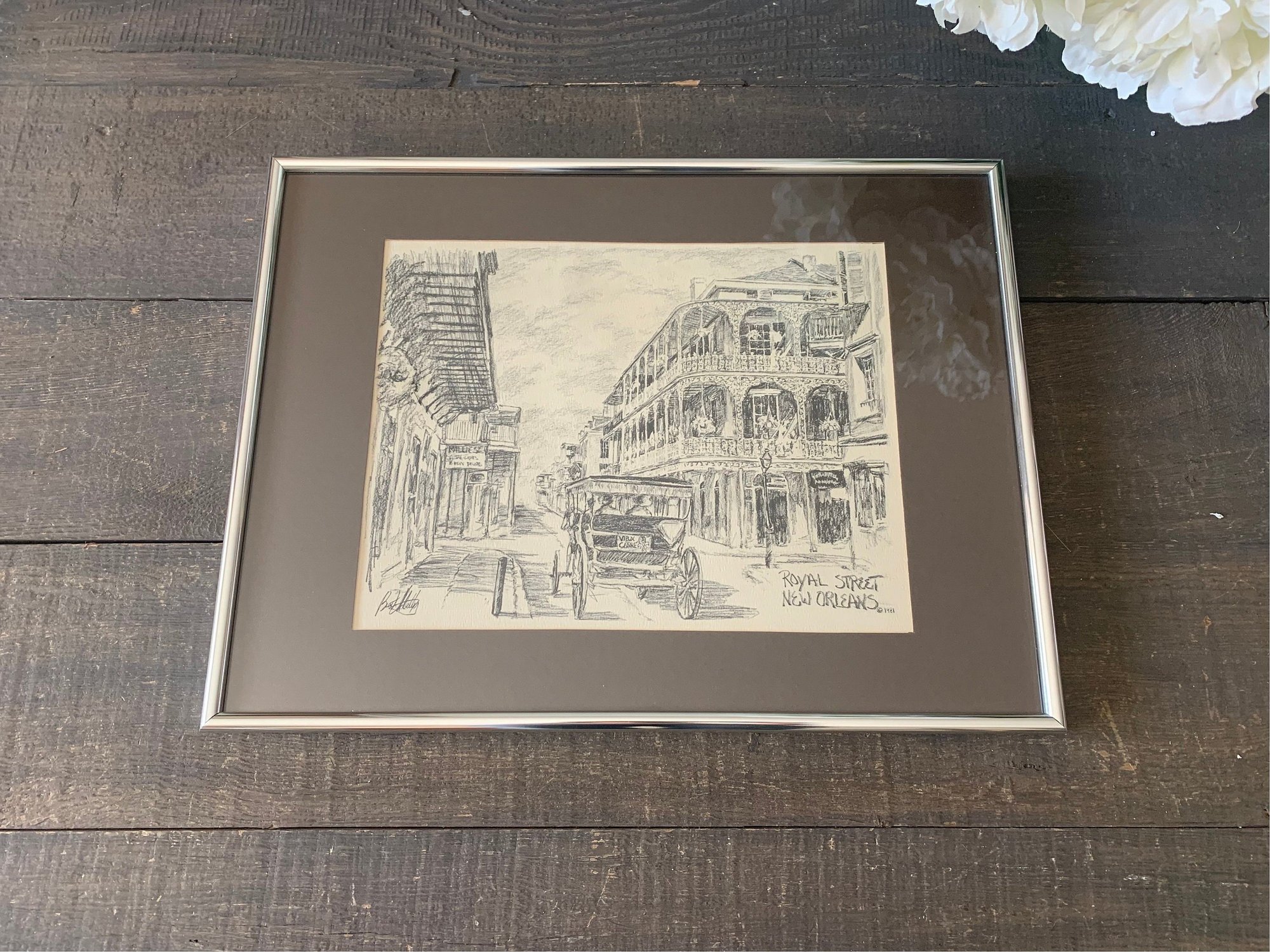 Royal Street New Orleans was illustrated by Brent McCarthy in 1980. This is a vintage signed print in a vintage metal frame. An artist's plaque is on the back of the frame (see pictures). Excellent condition; no scratches or chips.