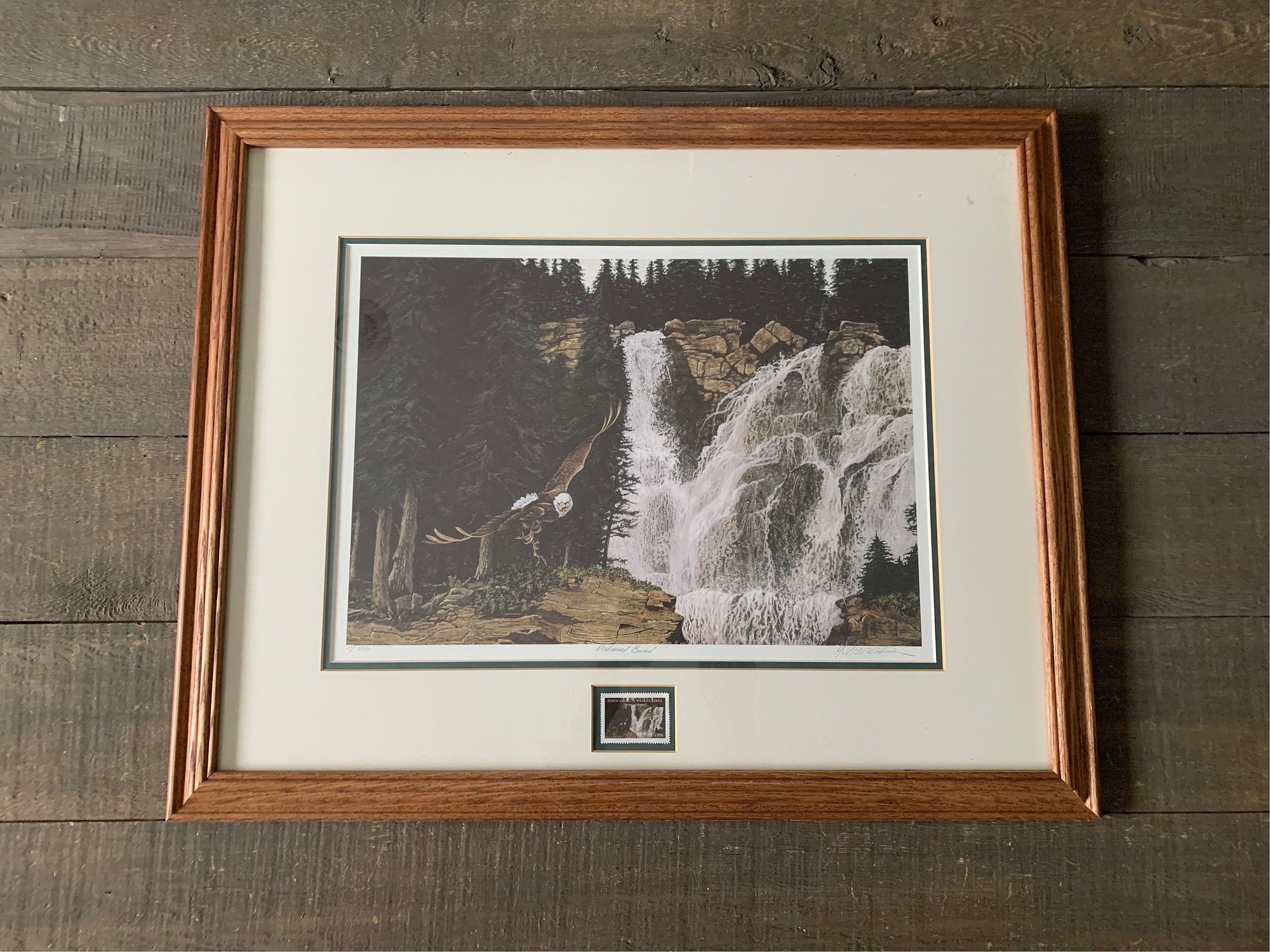 This beautiful framed eagle print from 1996 by Marten Visser is numbered 11/4950. The frame is in very good vintage condition and the print is still strong in its colouring.