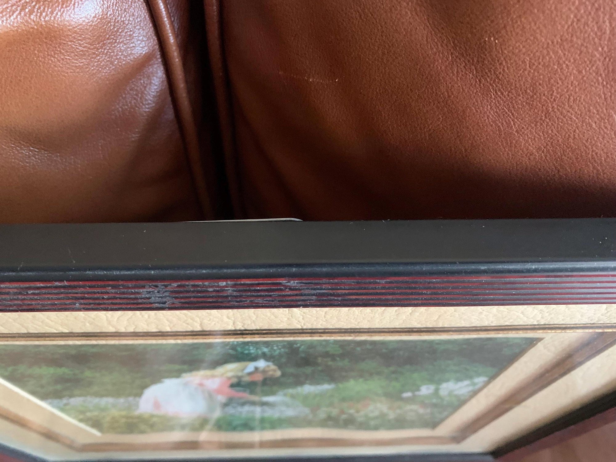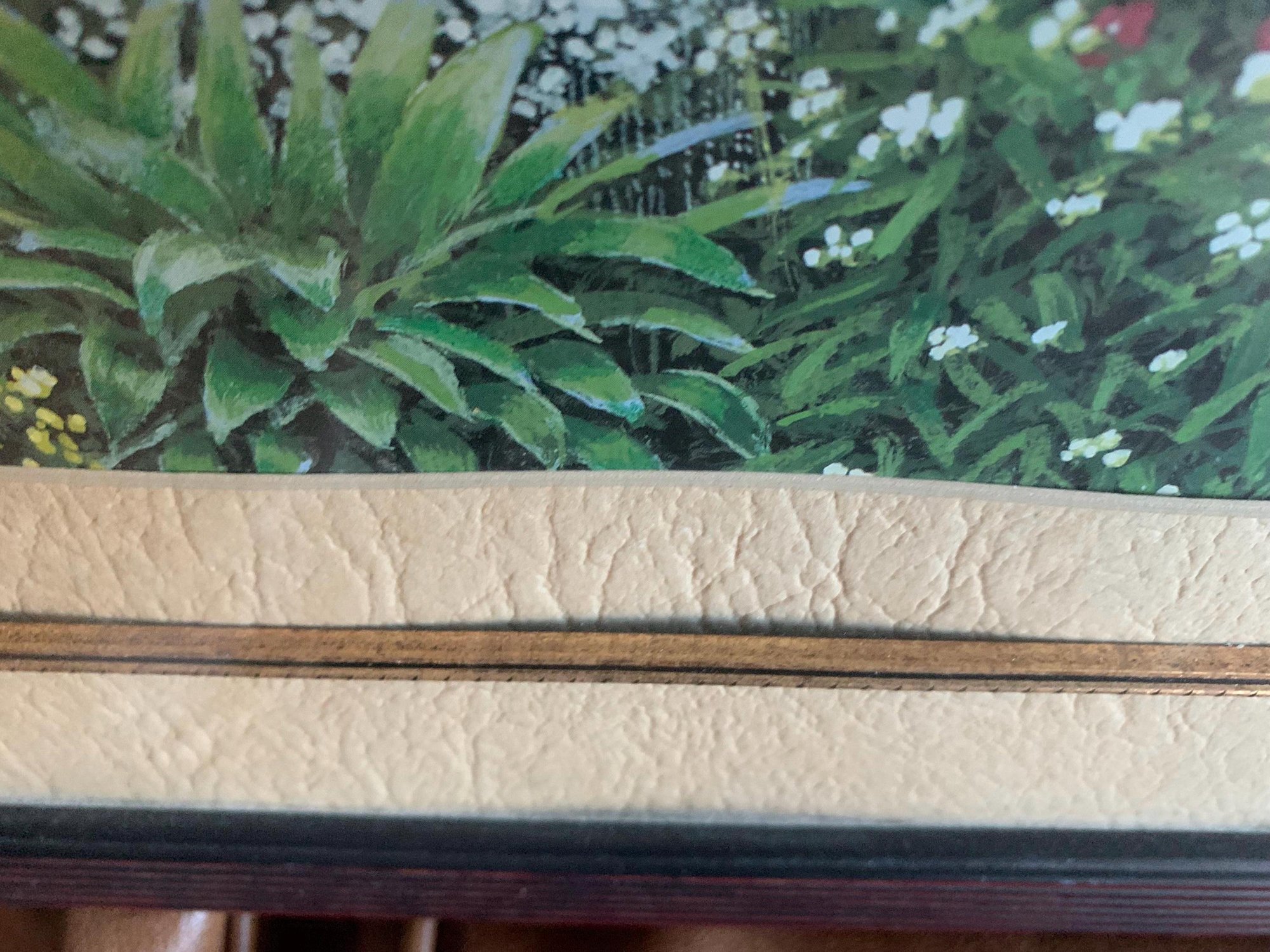 This vintage Mary G. Smith print is in excellent condition. There are no signs of fading in the colours, no stains, the mat is in very good condition however there is one area where the mat curves outward (see Pic #6). The frame has no marks, scratches or chips on it.