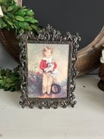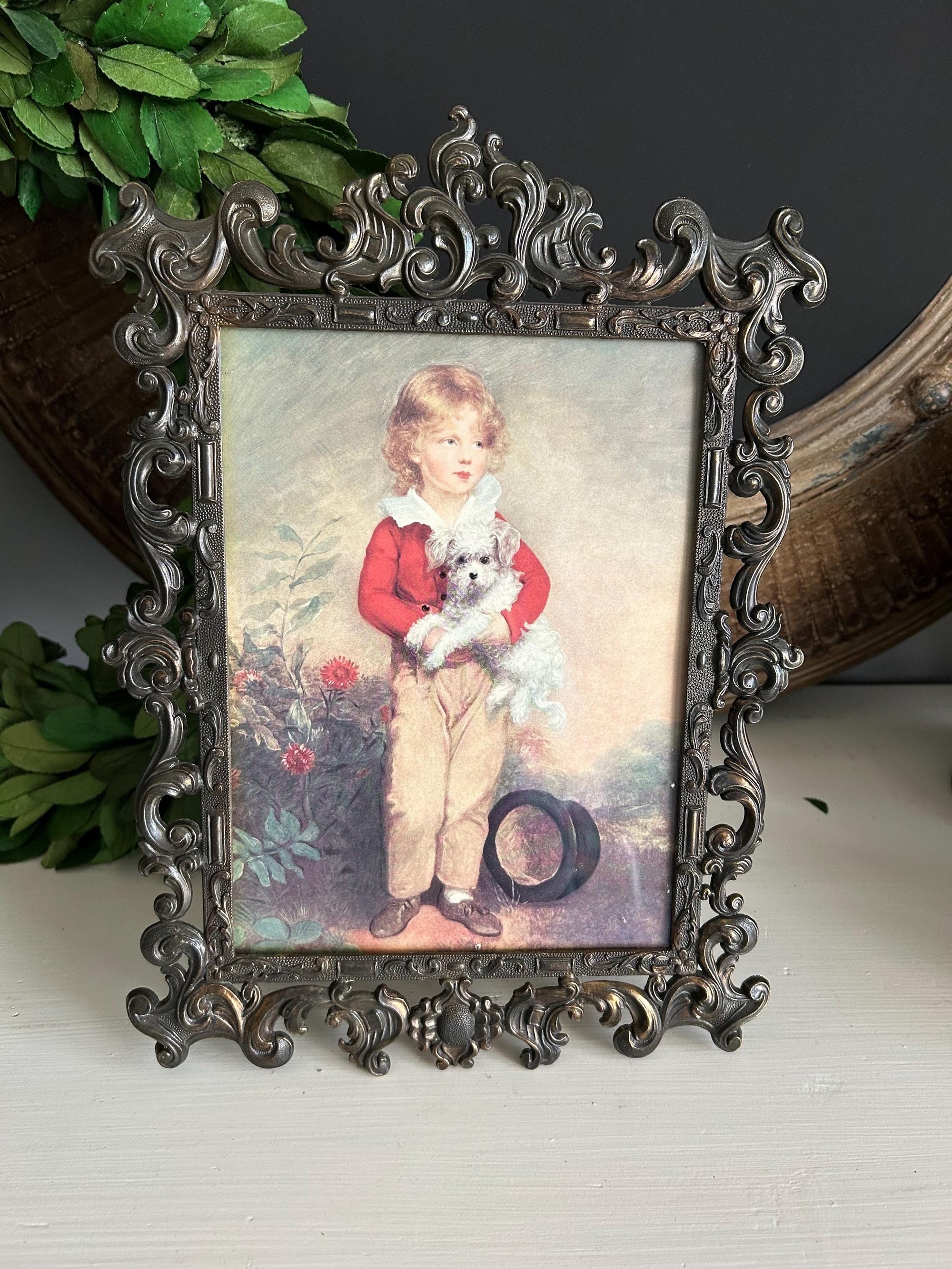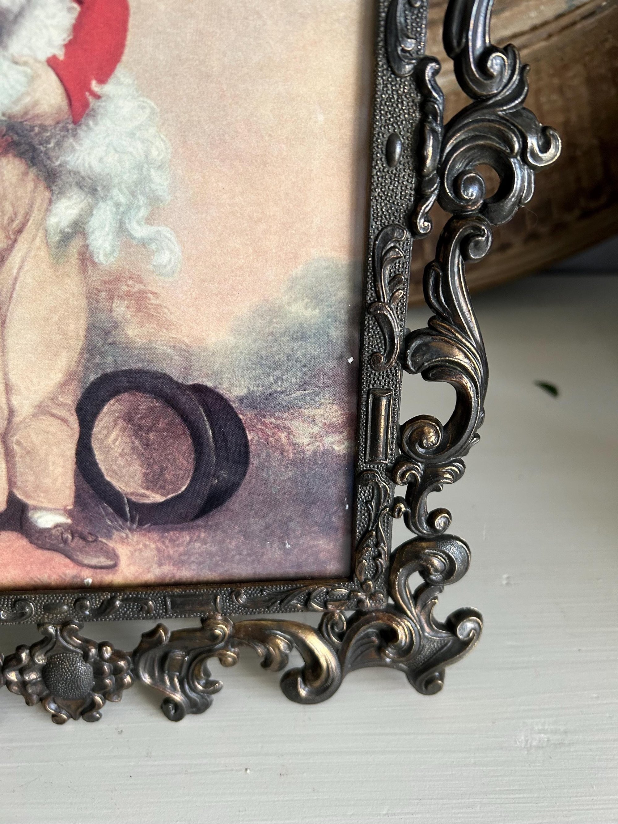This vintage print of and metal frame are in amazing shape. The cloth backing is in great shape as well and the stand is sturdy. There are 2 metal pins holding the picture in place showing the age of the frame. A beautiful patina is starting on the metal.